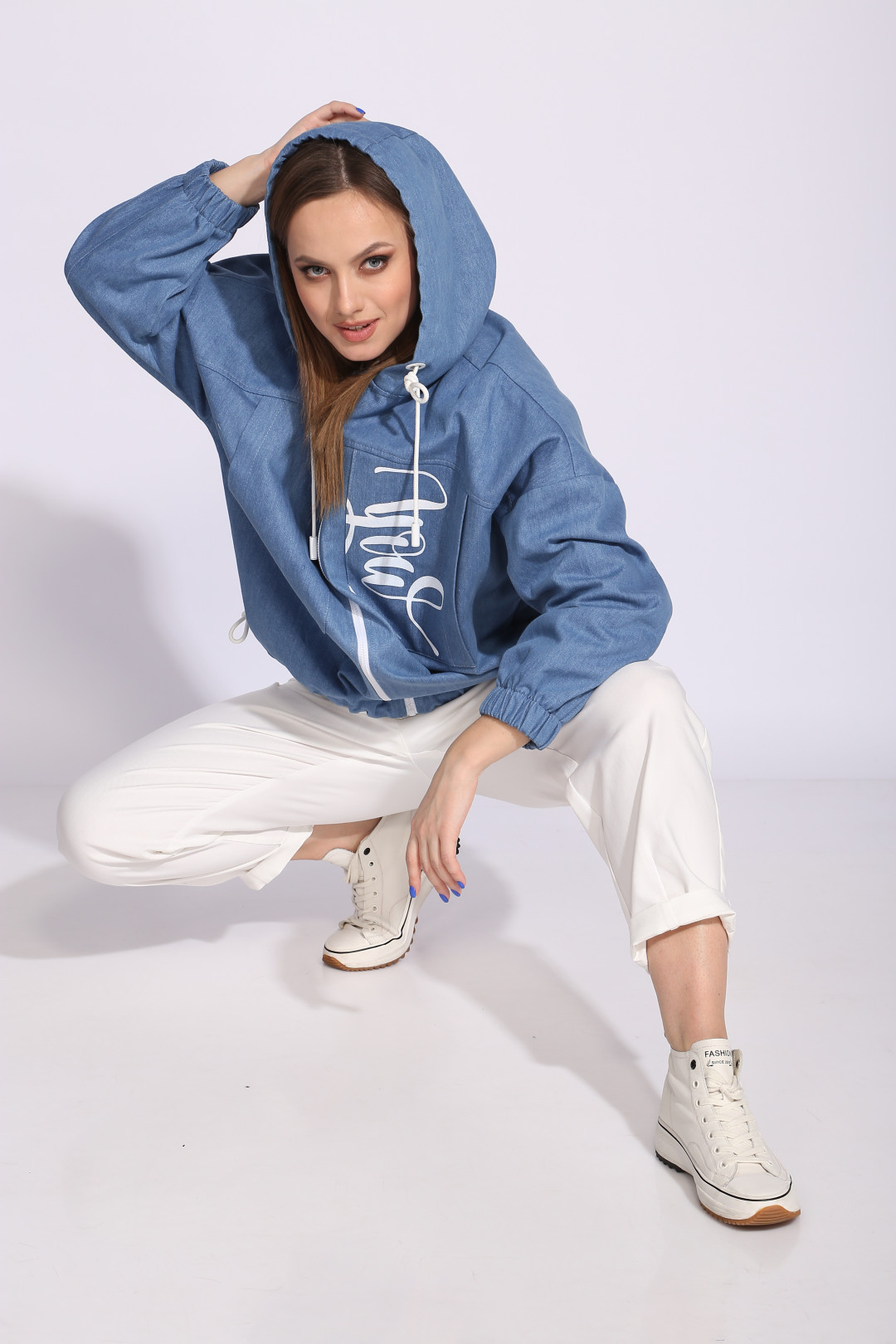 Наступление весны часто ассоциируется у нас с переменами, началом чего-то нового! И это может стать отличным поводом обновить гардероб.Эта легкая курточка, незаменимая весной, ранней осенью и прохладными летними вечерами, СТАНЕТ ОСНОВОЙ ТВОИХ СВЕЖИХ ВЕСЕННИХ ОБРАЗОВ. Ветровка женская, объемная , без подкладки. Рукав длинный, со спущенной линией плеча, по низу на резинке. По переду и спинке отрезные кокетки. По переду от кокеток большие накладные карманы. Один карман задекорирован принтом. Застежка централтьная на молнию. Капюшон с кулисой. Также кулиса по низу ветровки. На спинке эксклюзивный дизайнерский принт. Длина по спинке 66 см, длина рукава от горловины 76 см в рр.44-48, 79 см в рр.50-54. На фото с брюками цвет молочный м.1055 — брюки в наличии.