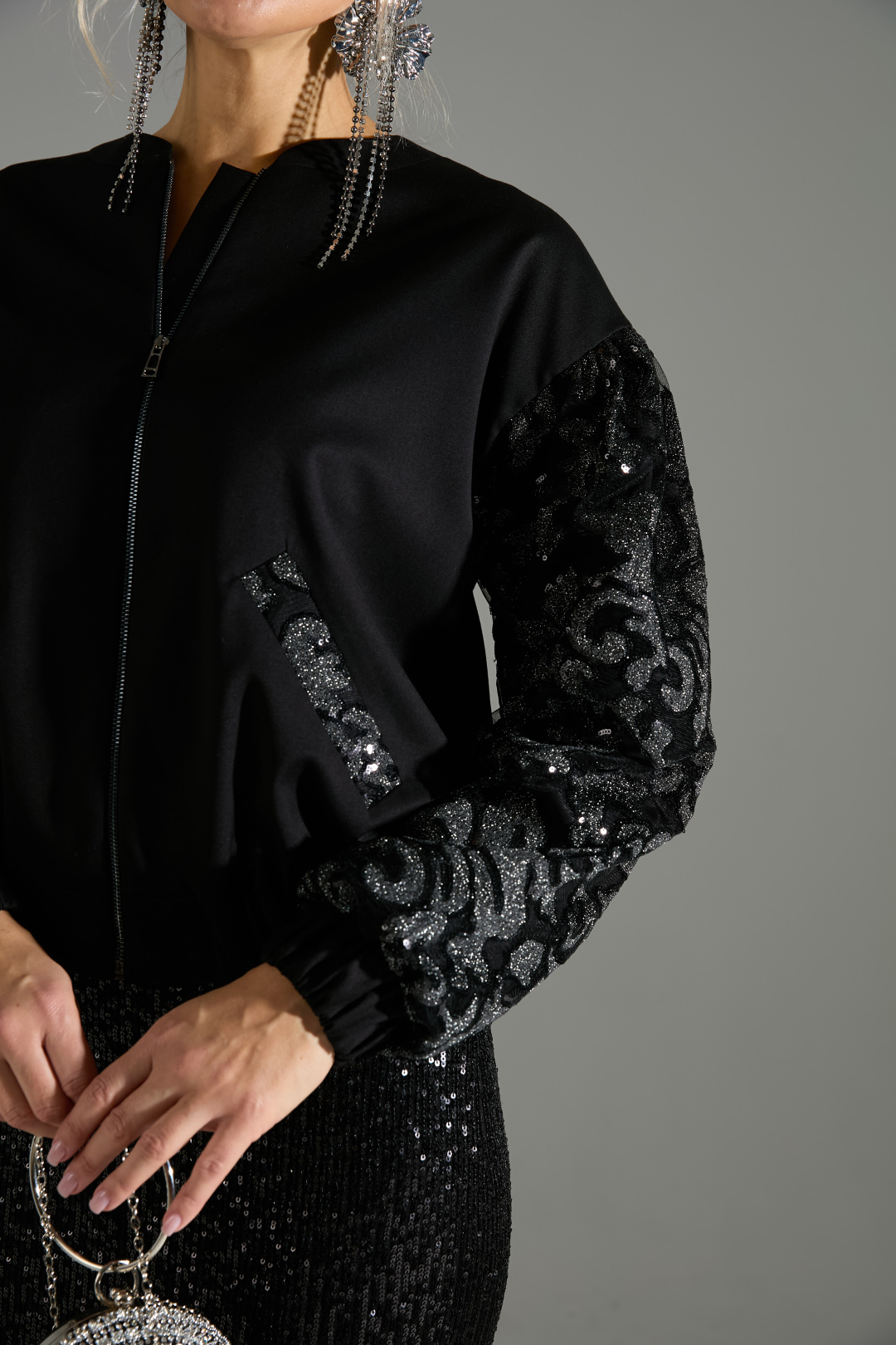 Комплект 2ка, состоящий из бомбера и юбки. Бомбер свободного силуэта с объёмными рукавами и застёжкой на молнию. Манжеты и низ бомбера на резинке. Карманы и рукава бомбера декорированы кружевной тканью расшитой пайетками. Юбка- карандаш длиной ниже колена прямого силуэта. Пояс юбки и подкладка выполнены из эластичного трикотажа. Верхний слой юбки из лёгкой ткани расшитой пайетками. Застёжка на потайную молнию в среднем шве по спинке, разрез расположен внизу среднего шва.