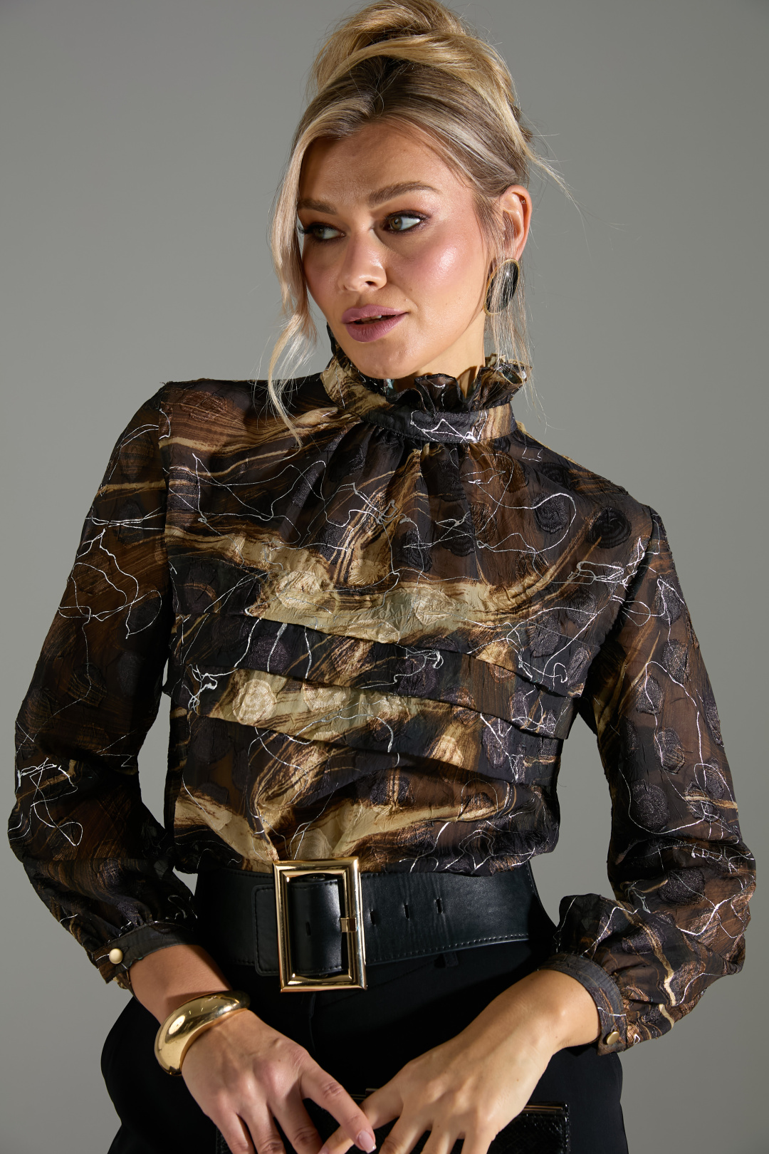 Комплект 2-ка, состоящий из блузы и брюк. Элегантная блуза из легкой ткани свободного силуэта. По переду блузки добавлен оригинальный элемент в виде складок. Брюки широкого объема, прямого силуэта. В боковых швах расположены карманы. Застежка-гульфик. Пояс отрезной, притачной. В задней части пояса вставлена эластичная тесьма (резинка). Пояс застегивается на петлю и крючок.