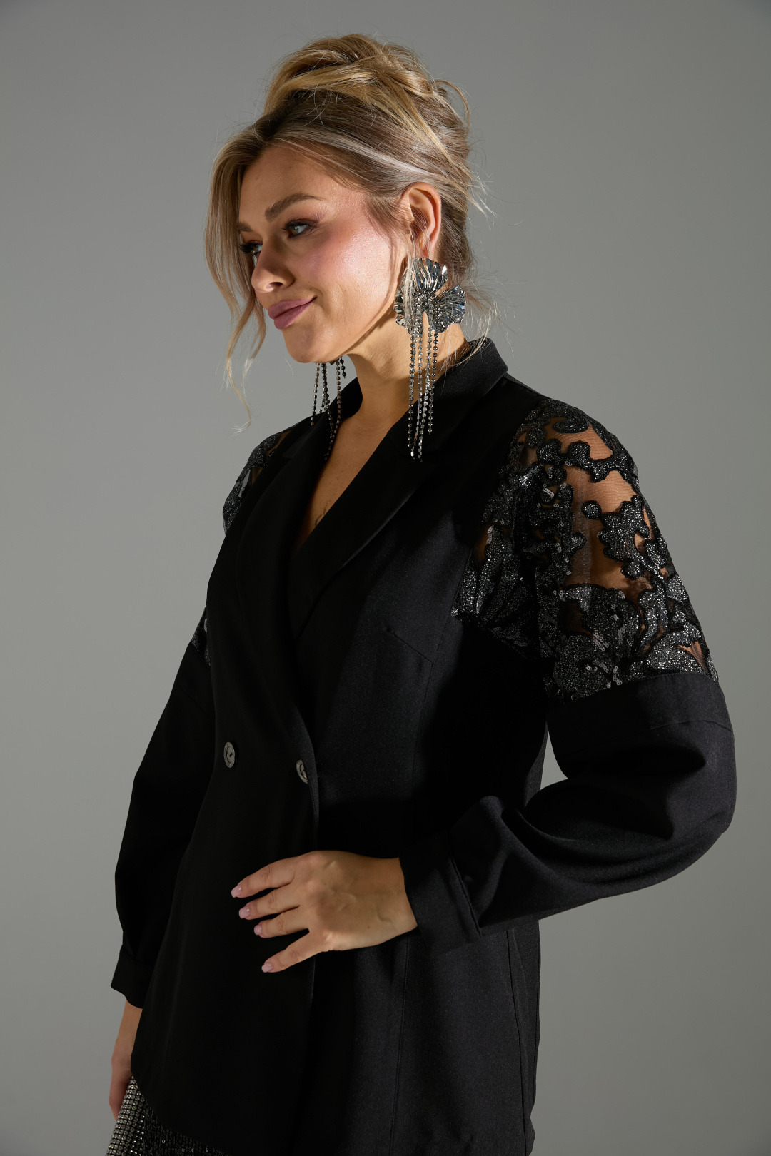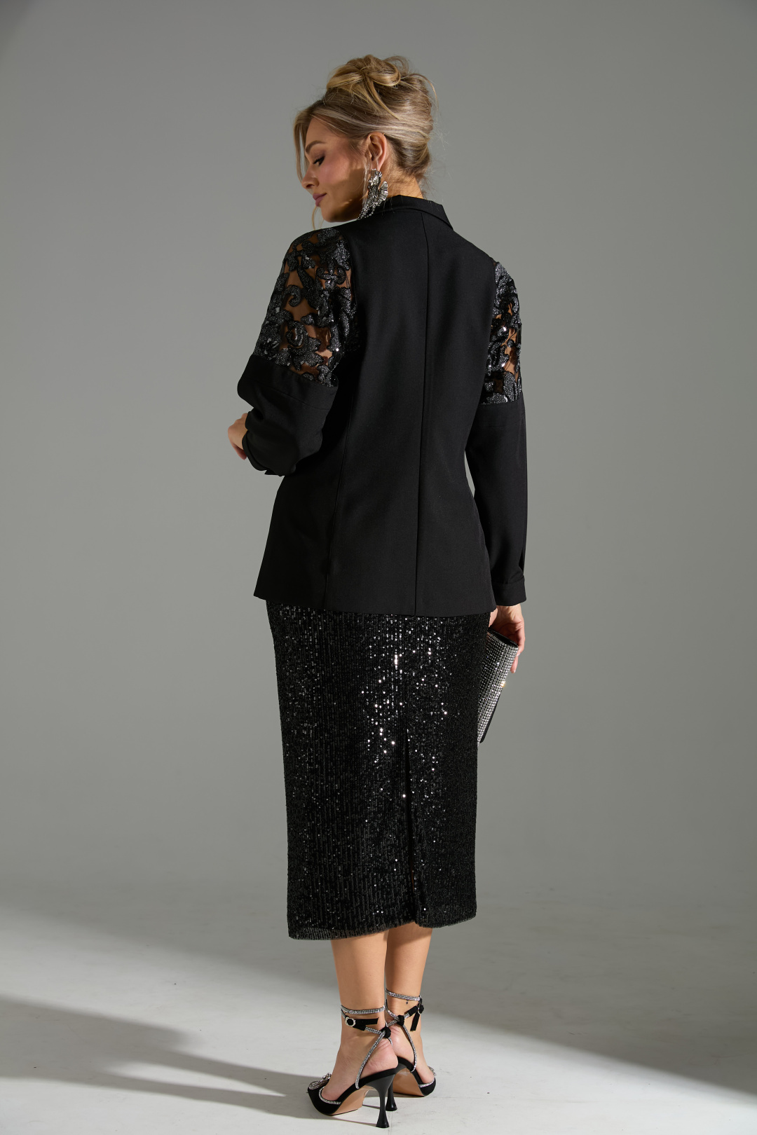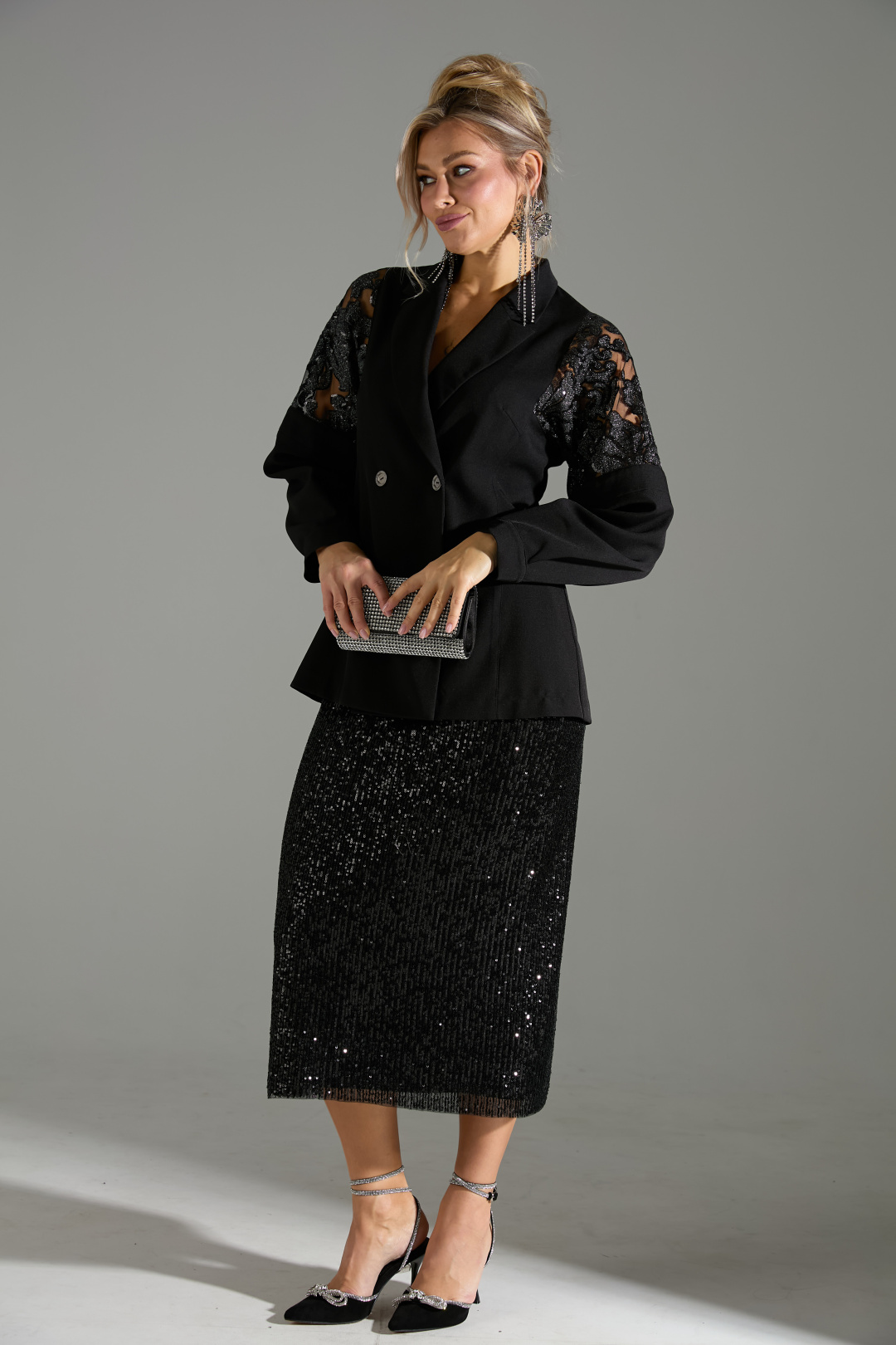 Комплект 2ка, состоящий из жакета и юбки. Двубортный жакет полуприлегающего силуэта с застёжкой на две пуговицы без карманов. Рукава жакета объёмные, заканчиваются манжетой с застёжкой на пуговицу. В качестве декора в районе плеча присутствуют вставки из кружевной ткани с пайетками. Юбка- карандаш длиной ниже колена прямого силуэта. Пояс юбки и подкладка выполнены из эластичного трикотажа. Верхний слой юбки из лёгкой ткани расшитой пайетками. Застёжка на потайную молнию в среднем шве по спинке, разрез расположен внизу среднего шва.