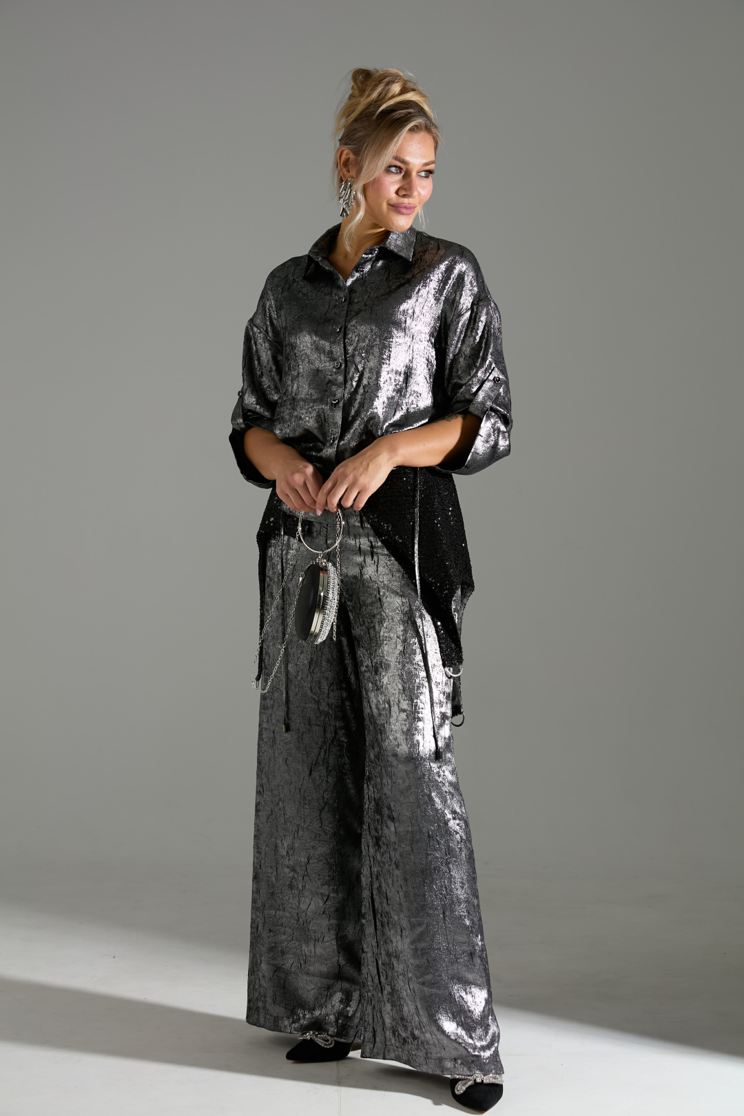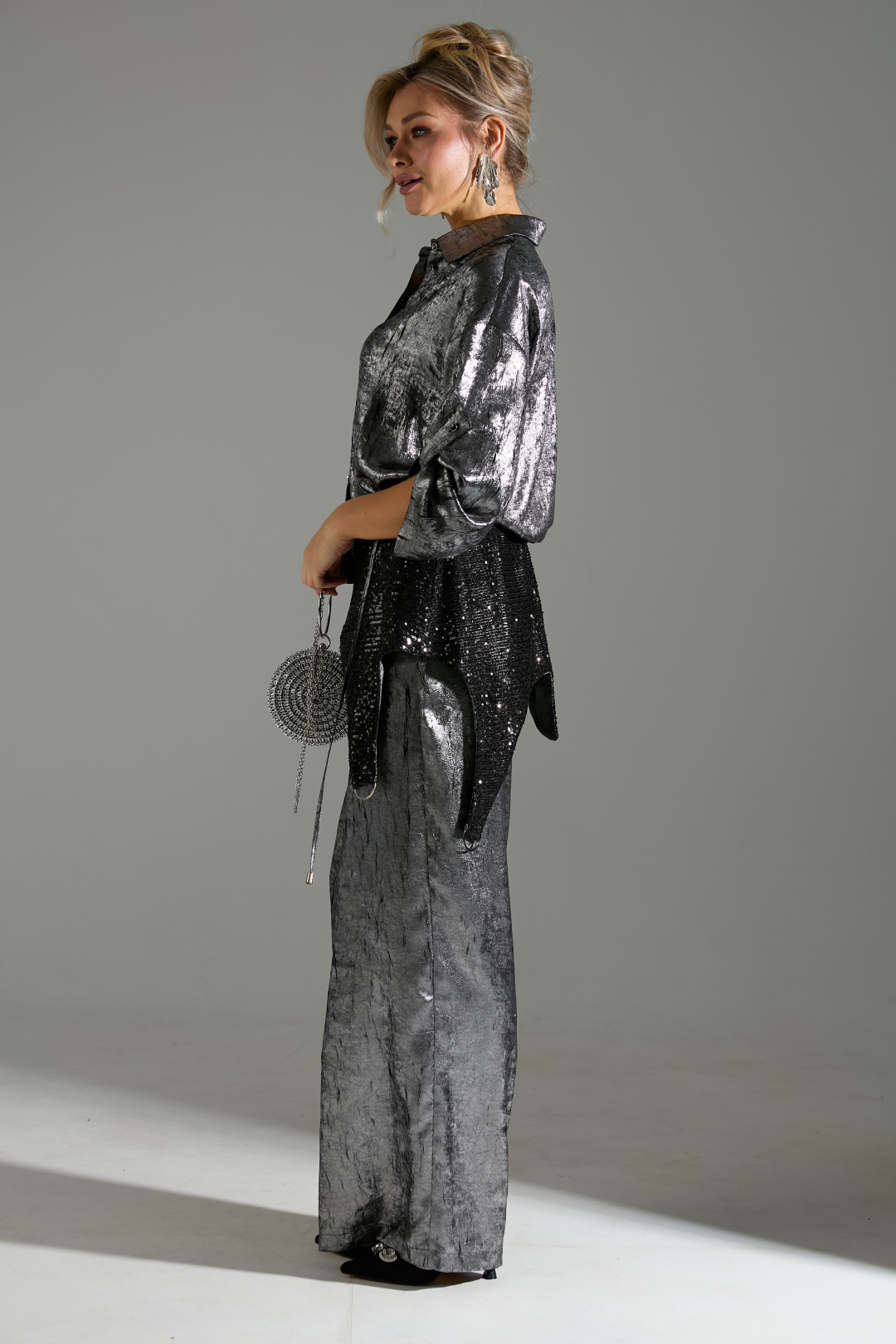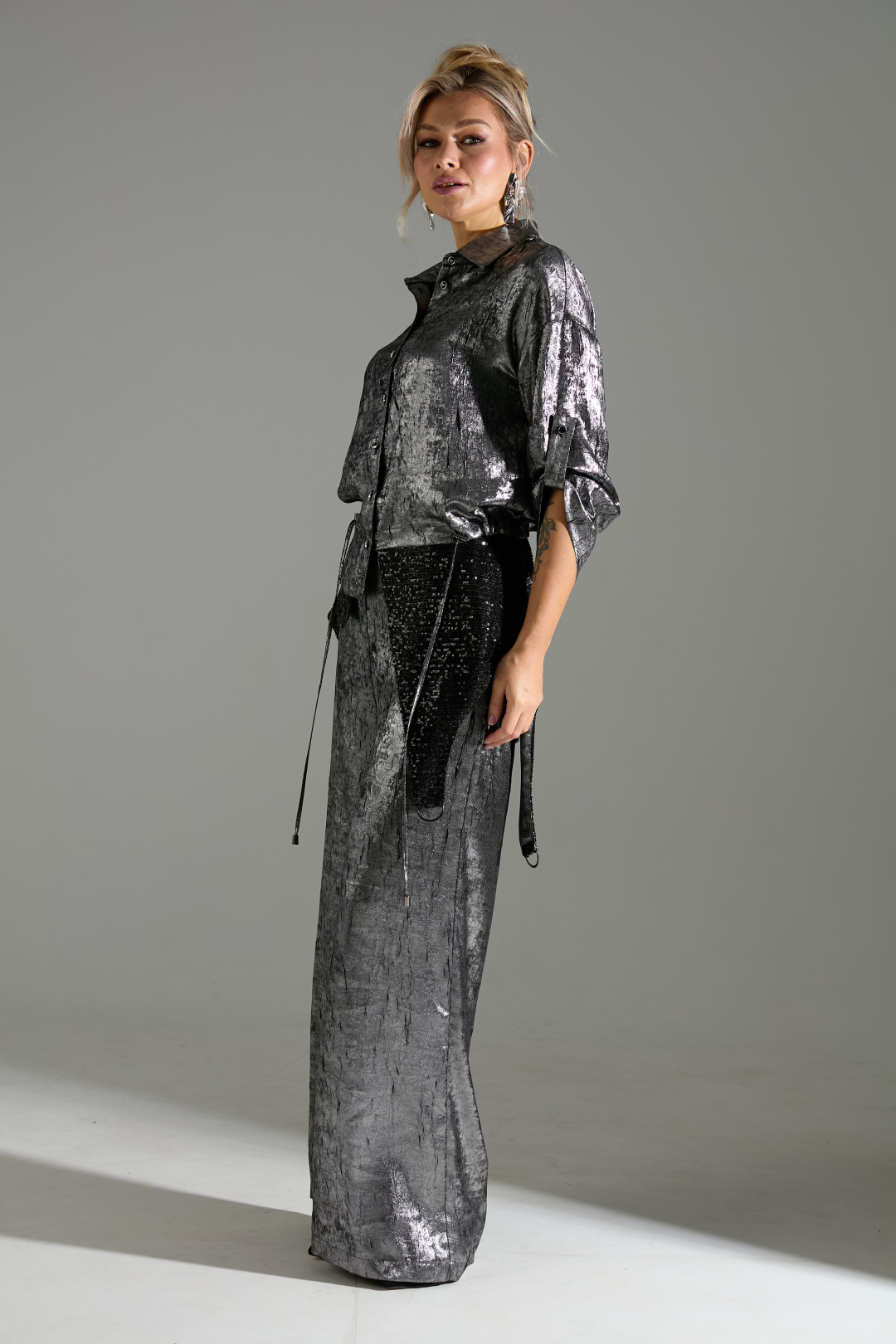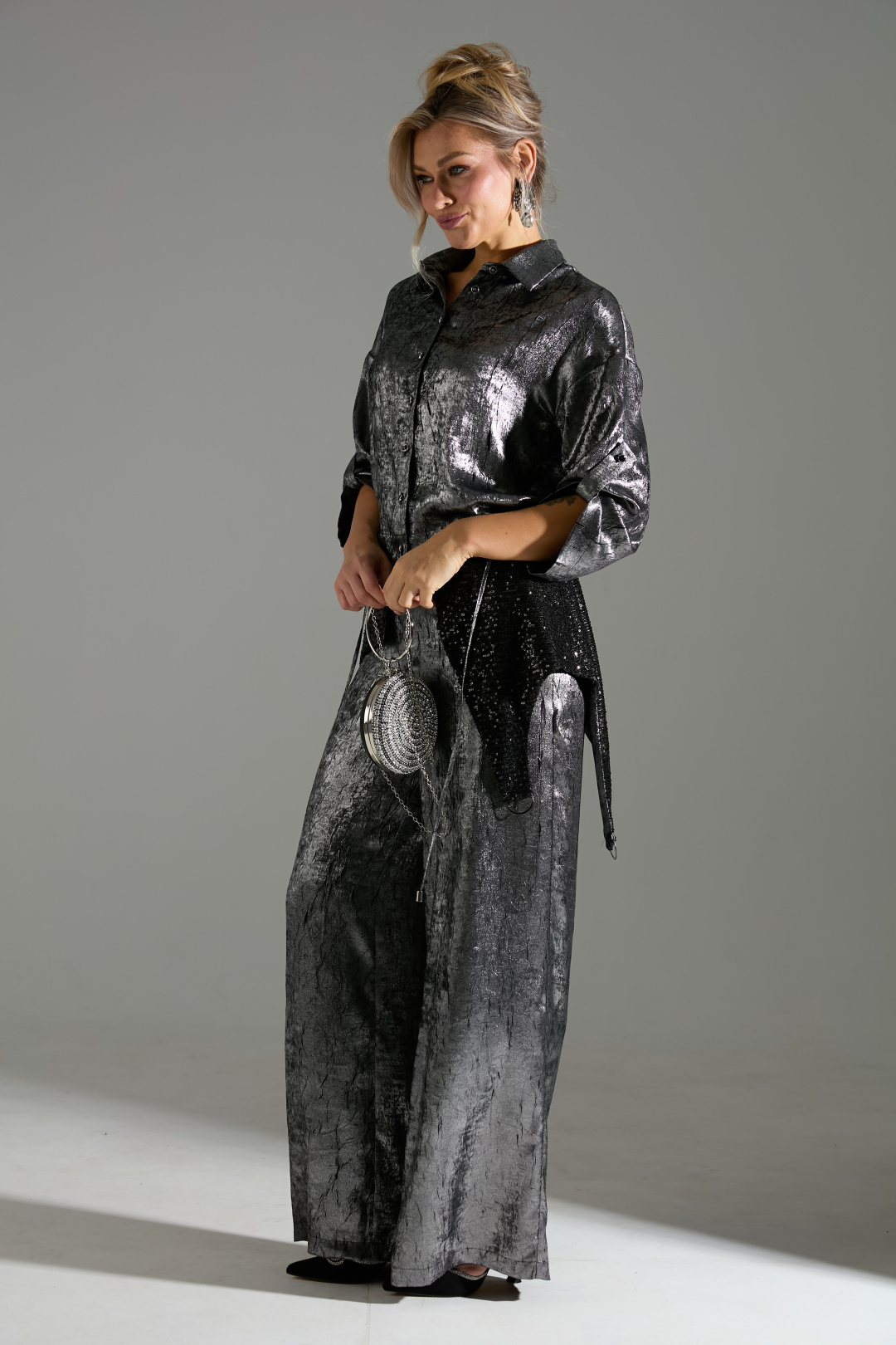 Элегантный женский брючный костюм из двух предметов: рубашки и прямых широких брюк. Рубашка выполнена в объёмном силуэте с длинными рукавами, оснащена пуговицами и шлейками на рукавах с пуговичной застёжкой для регулировки объема. Брюки прямого кроя дополняют образ, создавая лаконичный и современный вид. Особенность костюма – его текстурированный материал с металлическим блеском серебристо-чёрного цвета, который придает изделию роскошный и выразительный характер. Этот костюм идеален для создания стильного вечернего образа.