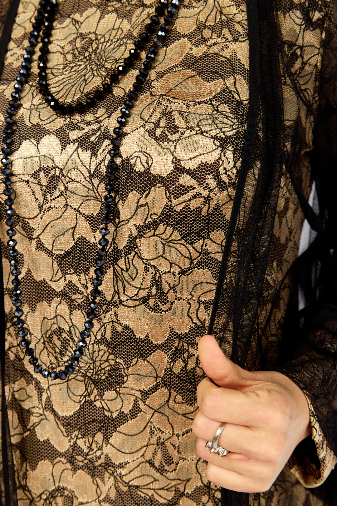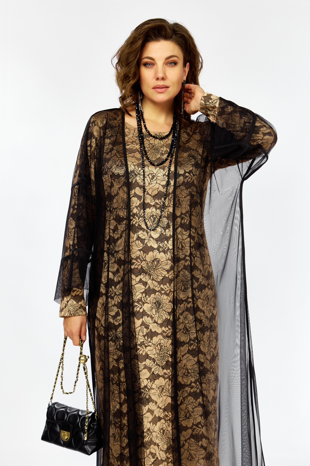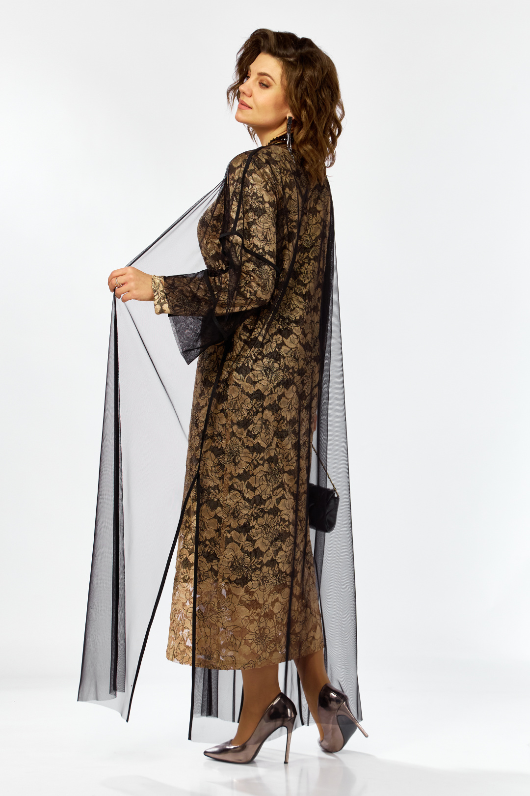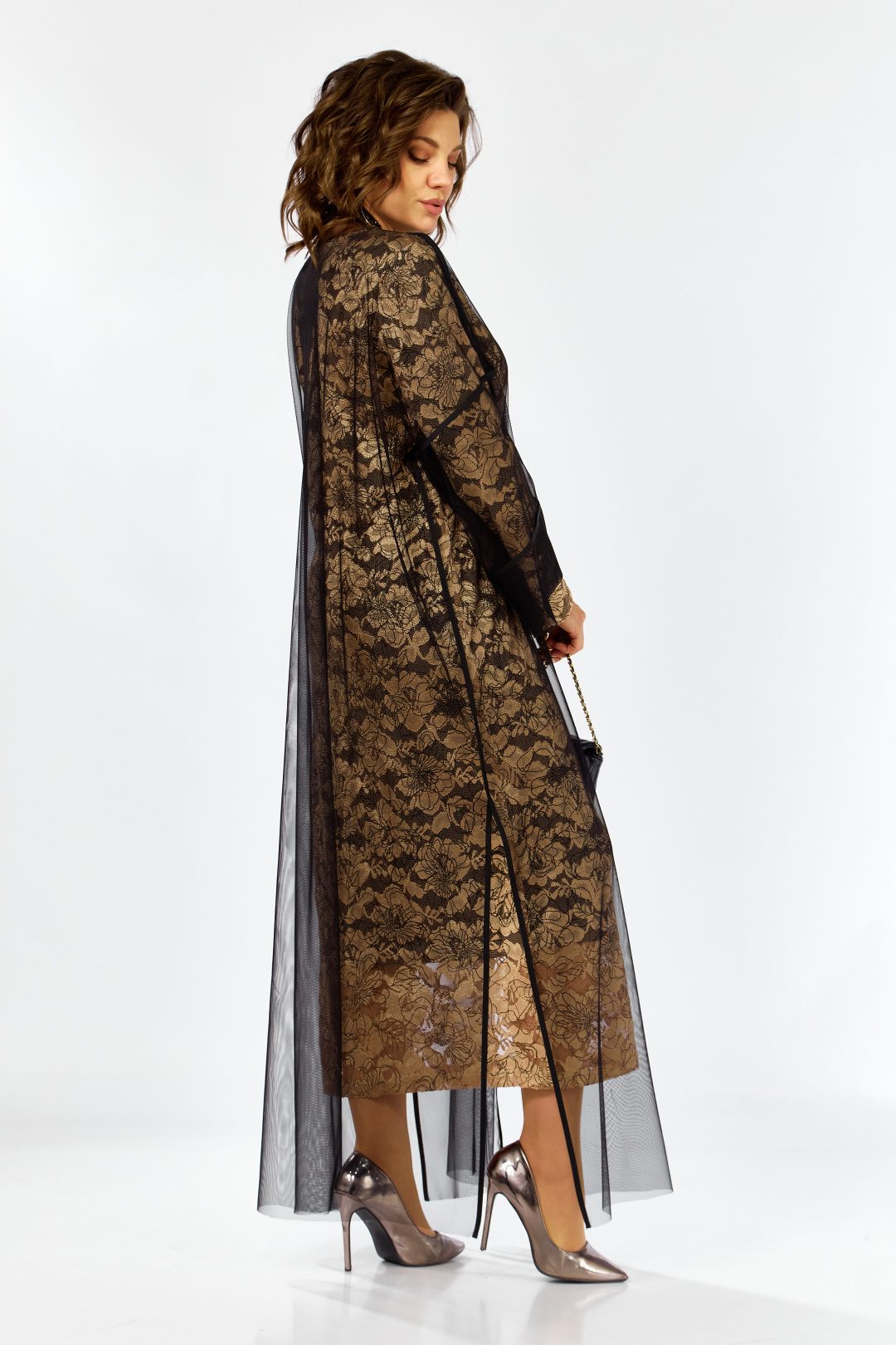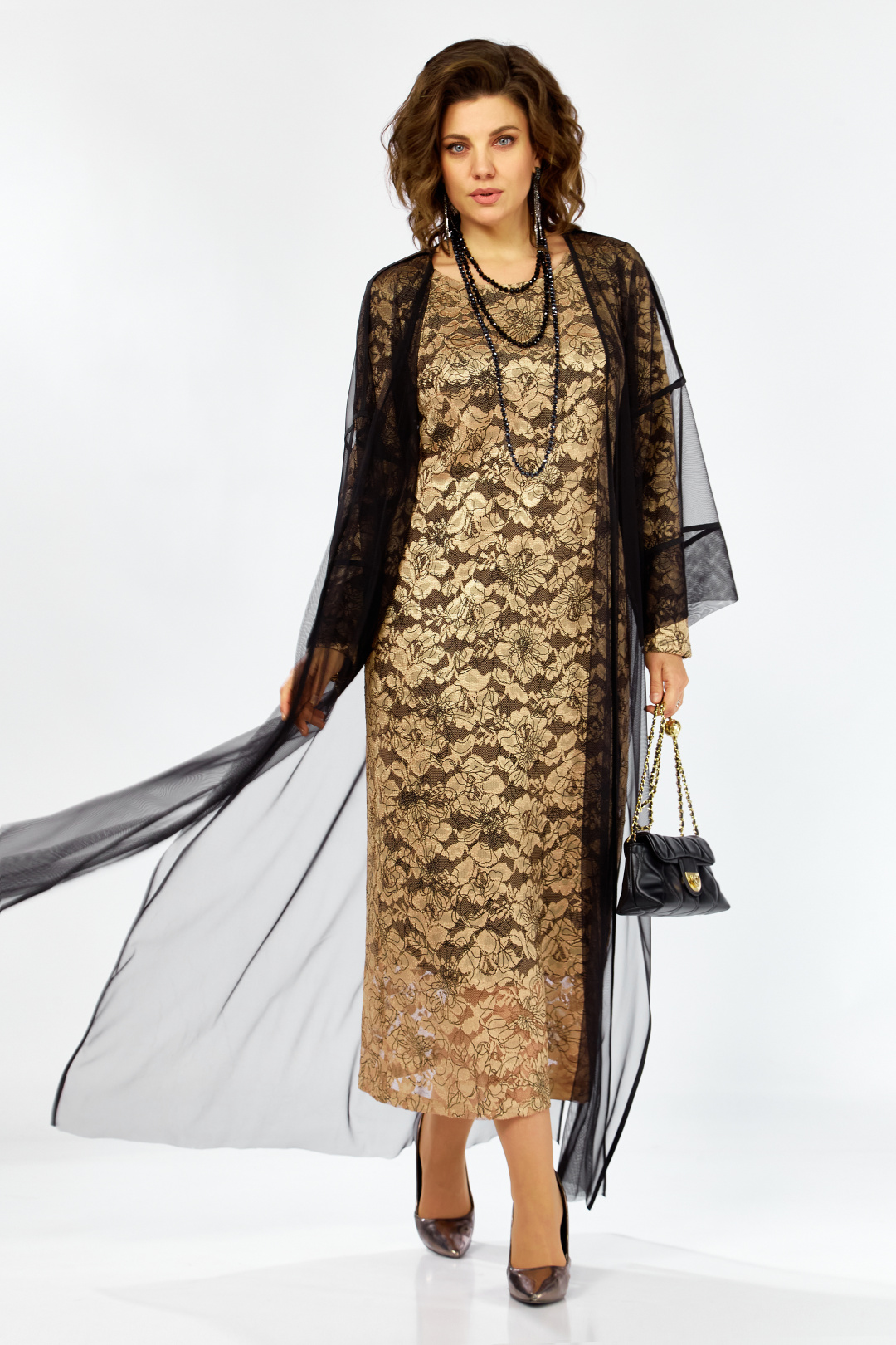 Элегантный и утонченный комплект созданный для особых случаев в основе платье полуприлегающего силуэта на трикотажной подкладке из кружевного гипюра с контрастным рисунком в цветочной тематике ,Сверху легкая накидка шазюбль из прозрачной сетки , она мягко драпируется , создавая воздушный легкий силуэт длинные рукава и свободный крой добавляют образу благородства и загадочности .