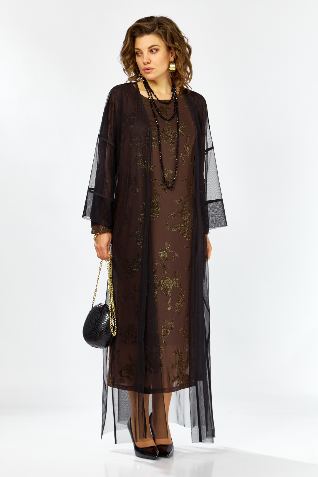 Роскошный плательный комплект. Платье на трикотажной подкладке полуприлегающего силуэта из мягкой стретч-сетки украшенной флоковым напылением с позолотой создает эффект дорогого кружевного орнамента. Образ дополняет Сверху легкая накидка кардиган-шазюбль из прозрачной сетки , она мягко драпируется , создавая воздушный легкий силуэт длинные рукава и свободный крой добавляют образу благородства и загадочности этот комплект идеально подойдёт для вечерних мероприятий торжеств и особых случаев.