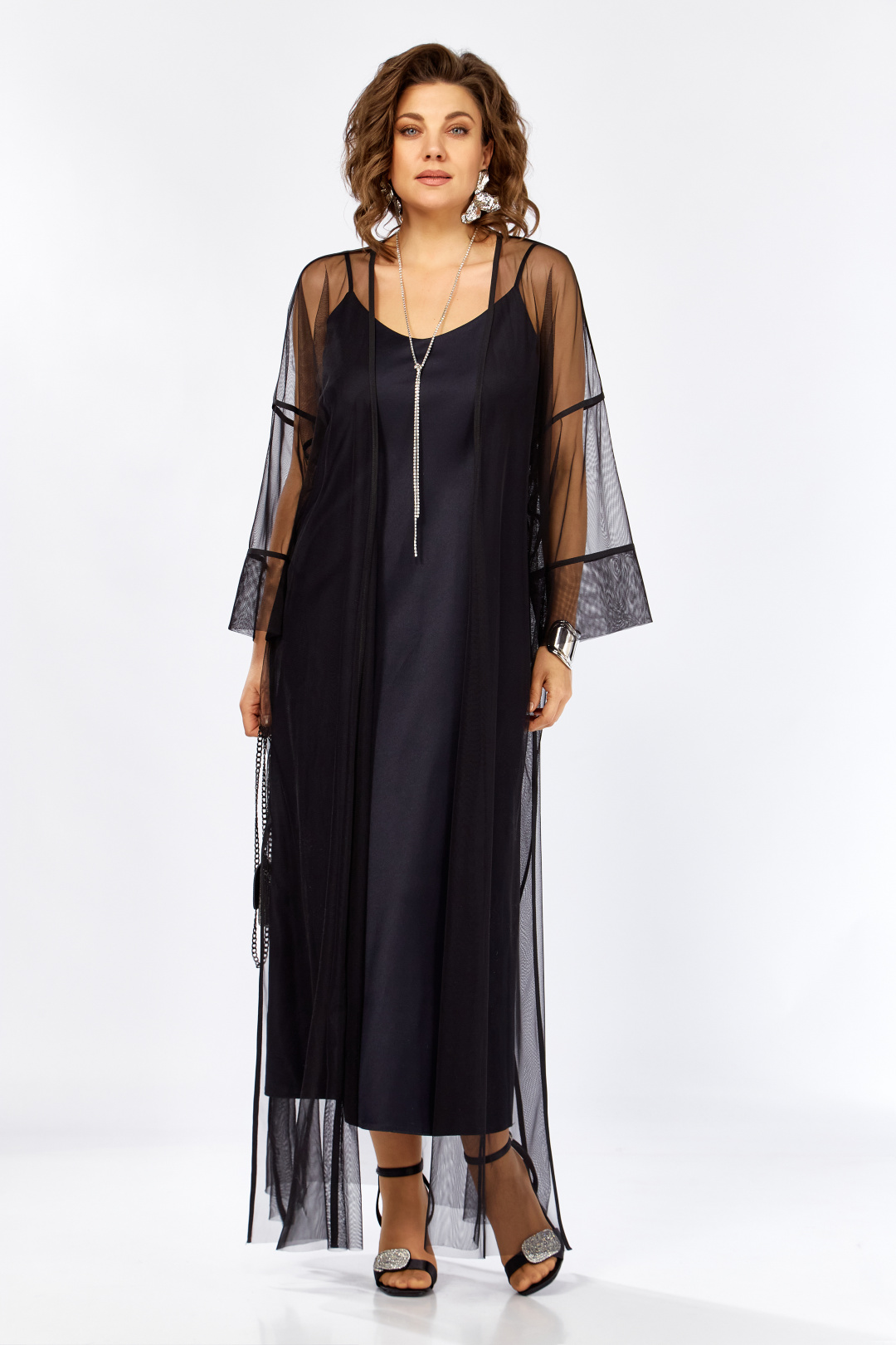 Изысканный комплект сочетает в себе платье из плотного атласа, свободного А образного силуэта , на Тонких бретелях и воздушную кардиган-шазюбль из сетки создавая образ утончённой элегантности женственности