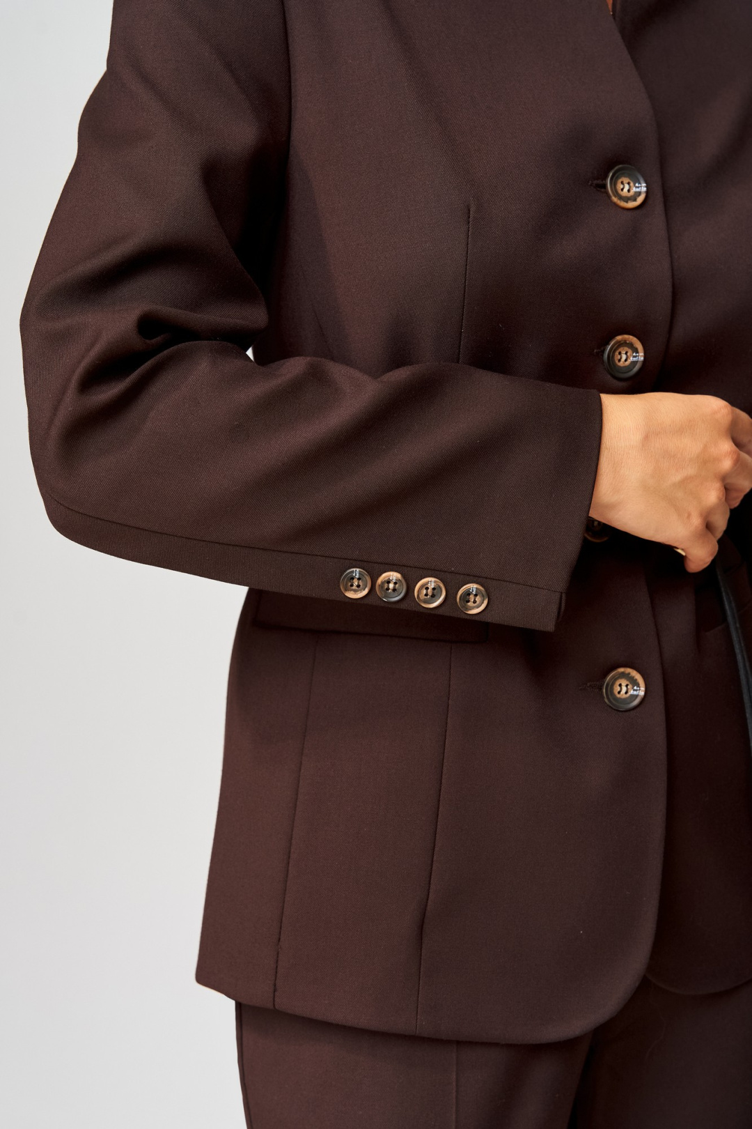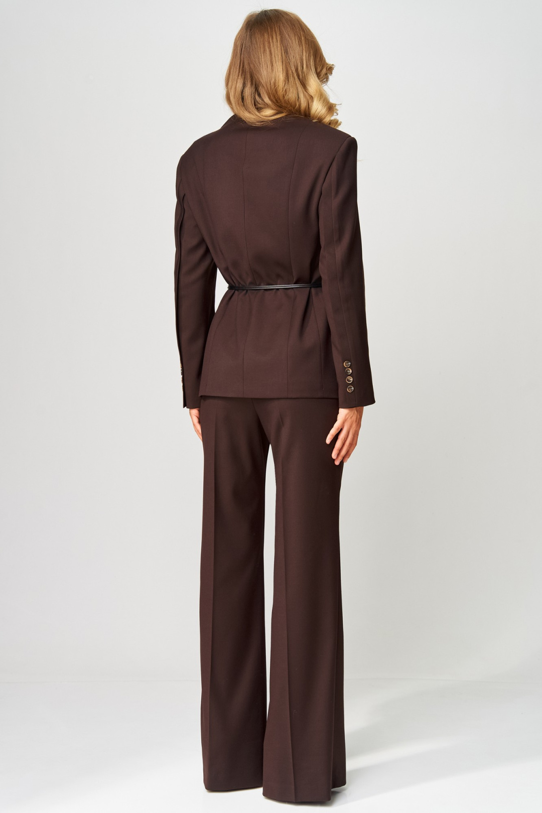Жакет полуприлегающего силуэта с центральной застежкой на 4 петли и 4 пуговицы. Вырез горловины жакета фигурной формы. Детали переда жакета с отрезными бочками и вертикальными нагрудными вытачками. Карманы горизонтальные прорезные с листочками с втачными концами. Деталь спинки жакета со средним швом, отрезными бочками и рельефными швами. Рукава втачные двухшовные, по локтевым швам вставлена планка, по низу декоративно прикреплены по 4 пуговицы. Жакет с притачной понизу подкладкой. Съемный пояс в комплекте.