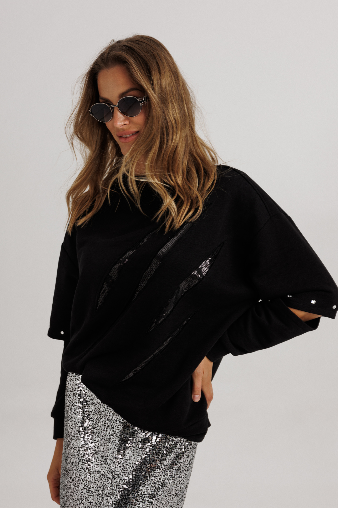 Блузон из уютного трикотажного полотна, свободного прямого силуэта. Линия плеча спущена, рукав прямой, на зауженной манжете. Линия плеча состоит из притачного элемента: погона. Рукав основной состоит из двух деталей, в горизонтальном шве стачивания данных деталей расположен открытый разрез. По верхнему срезу расположены стразы. При желании длина рукава может трансформироваться и отверстием выступает открытый разрез. Длина рукава вместе с плечевой линией 75 см. Из них 13 см: длина плеча и 62 см: длина рукава. Высота манжета 5 см.