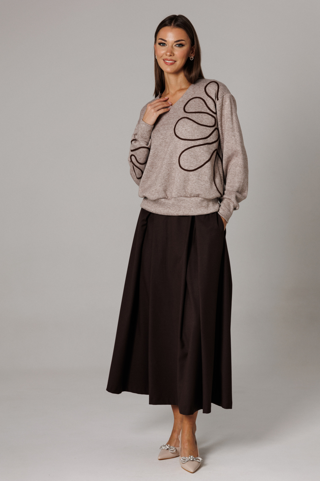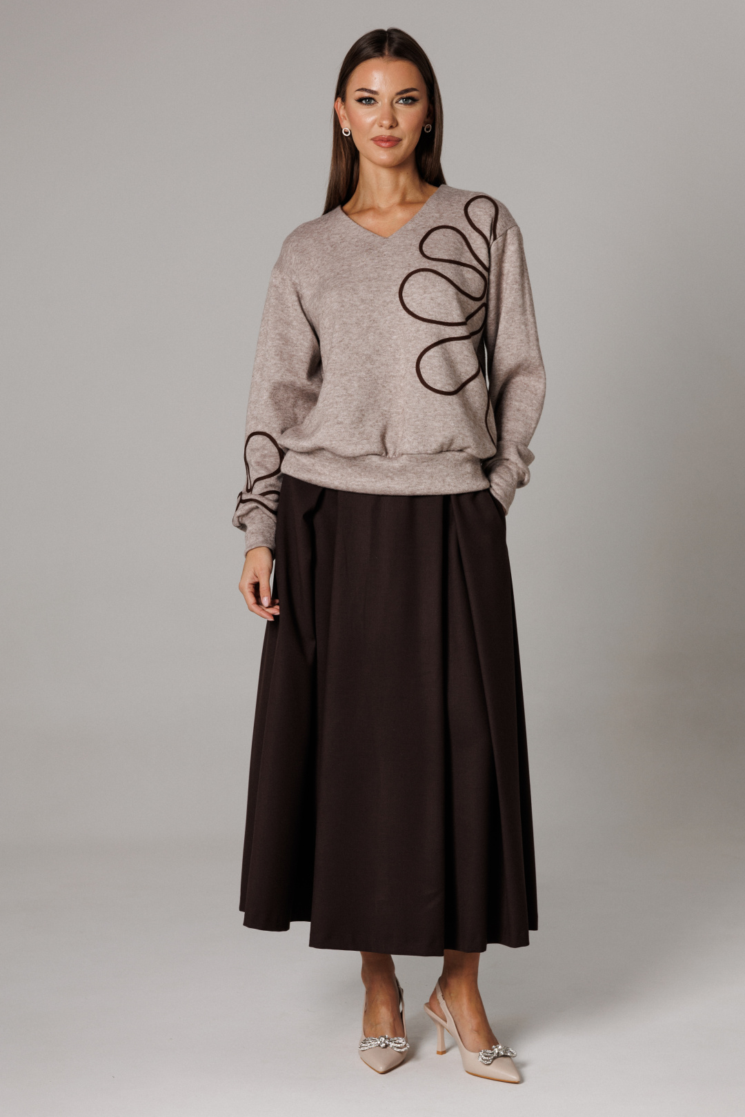 Декоративным элементом блузона выступает контрастный рисунок, напоминающий элементы лепестков цветочного узора. Расположены эти элементы асимметрично, на одном из рукавов, также полочке и частично в боковом сегменте спинки блузона. Рисунок создан трикотажным кантом. Горловина оформлена угловым вырезом на полочке и оформлена притачным обтачным элементом. Низ блузона оканчивается притачной манжетой, высотой 7,5 см. Длина блузона по спинке изделия 61 см.