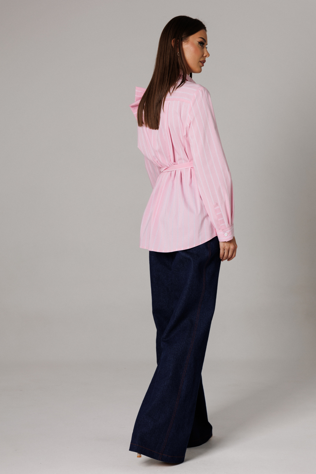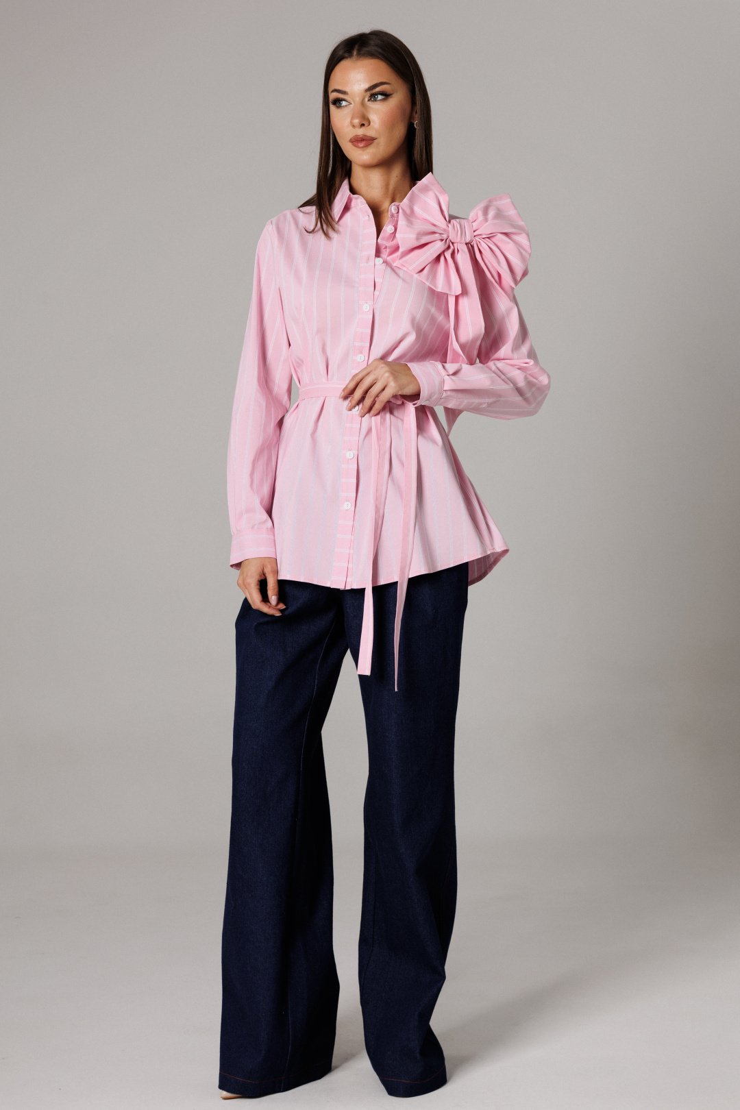 Стильный гармоничный комплект, состоящий из свободной блузы рубашечного покроя и брюками из джинса.