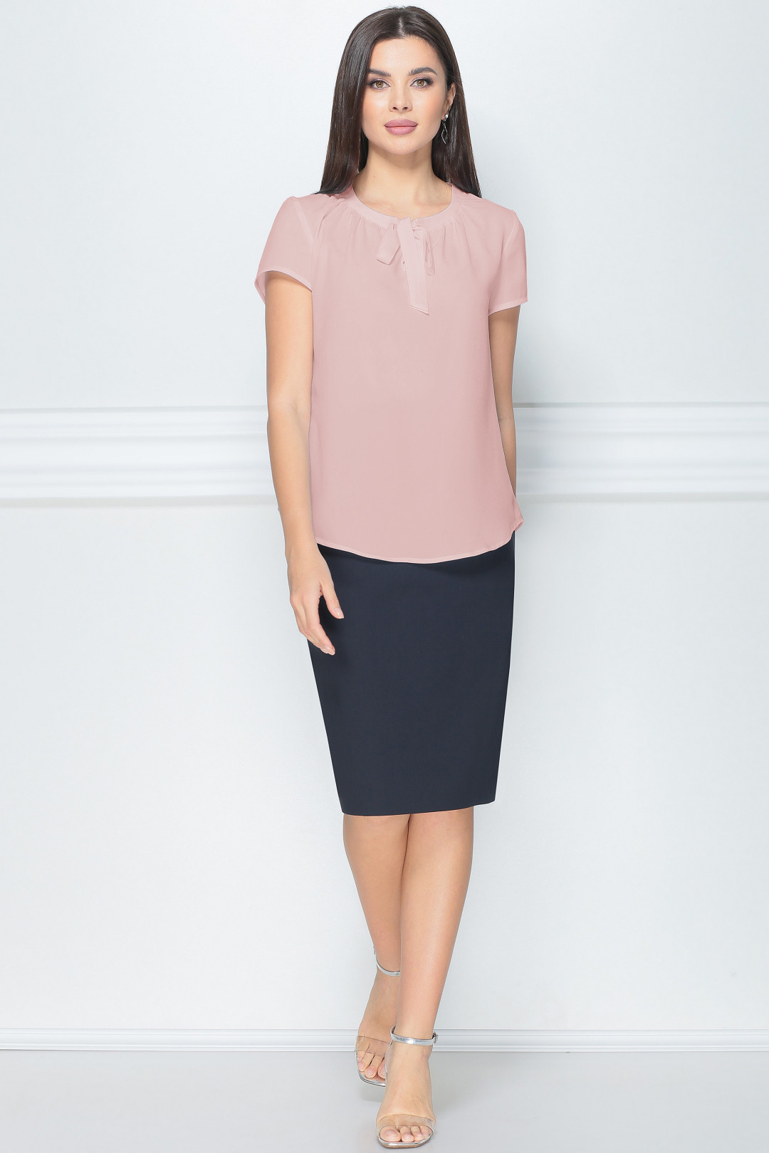 Блузка женская полуприлегающего силуэта со сборкой по горловине и V-образным вырезом. Рукав короткий втачной. По горловине декоративная планка переходящая в завязку-бант.