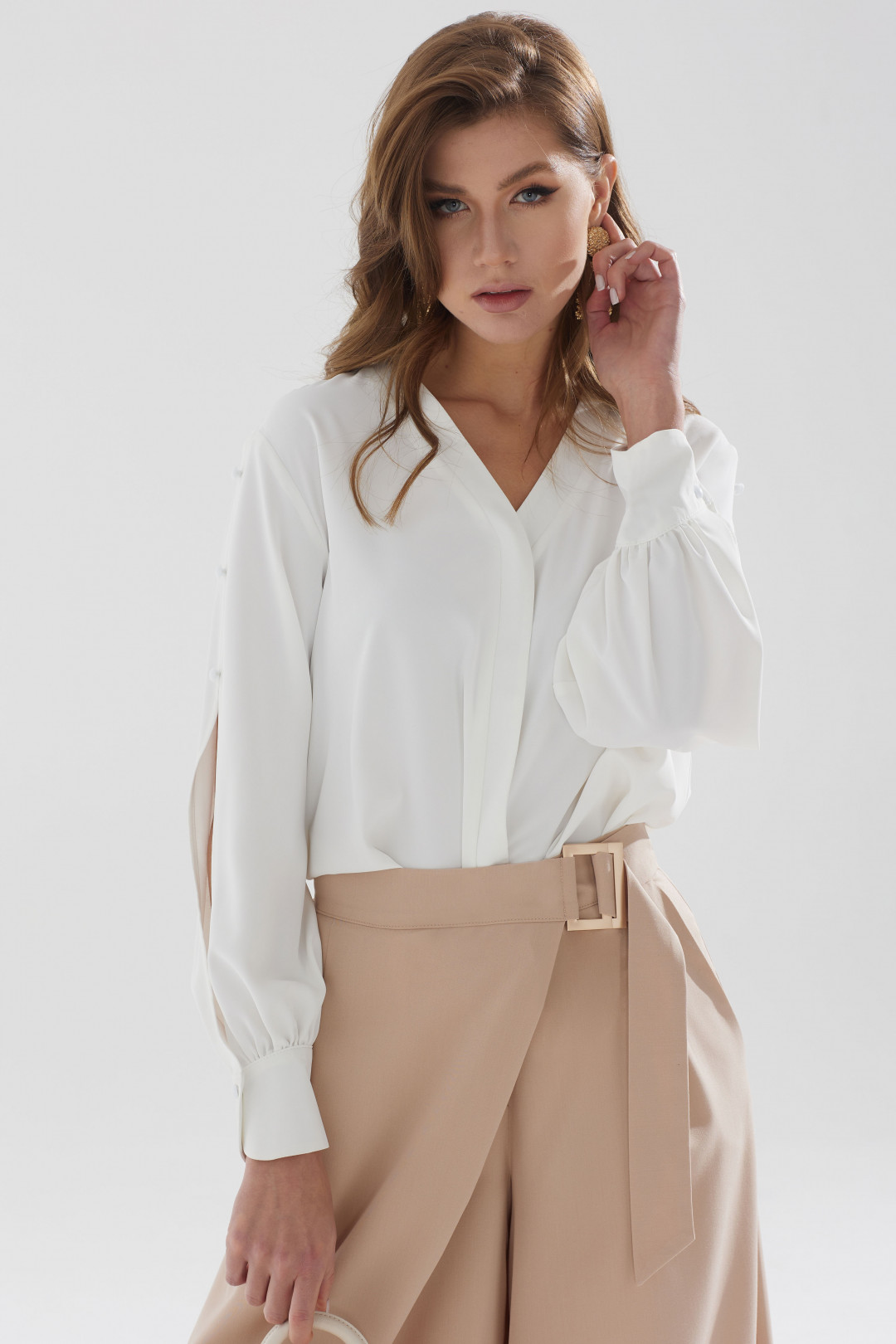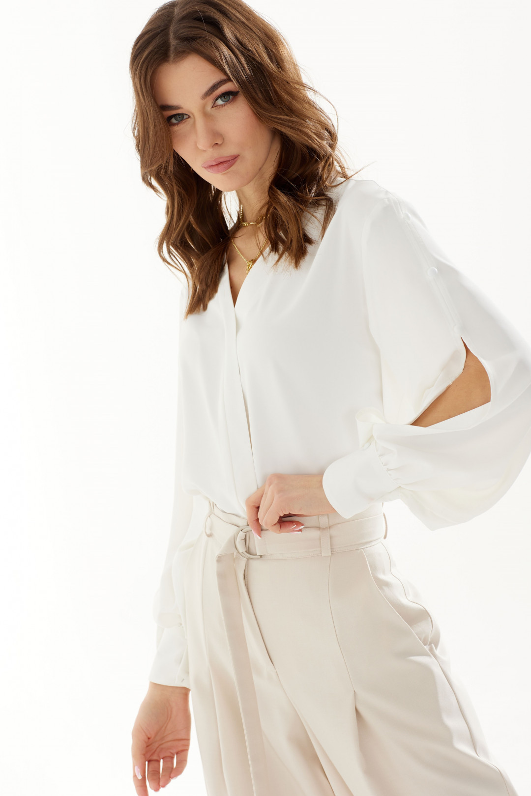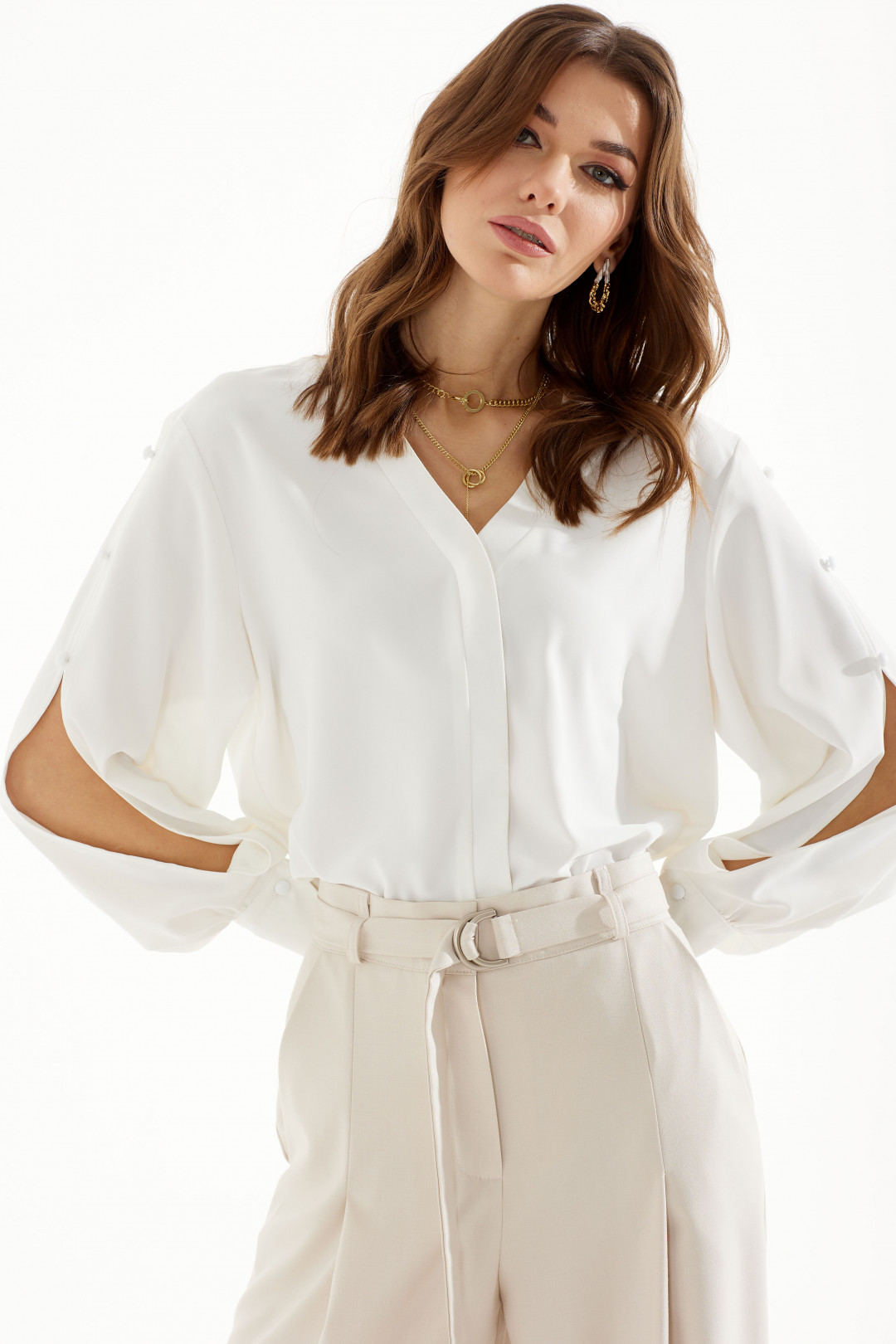 Стильная блузка прямого силуэта из струящейся ткани с фигурным низом. Горловина с V-образным вырезом, по переду декоративная планка. Рукав с декоративным разрезом и пуговицами, с застежкой на манжете.