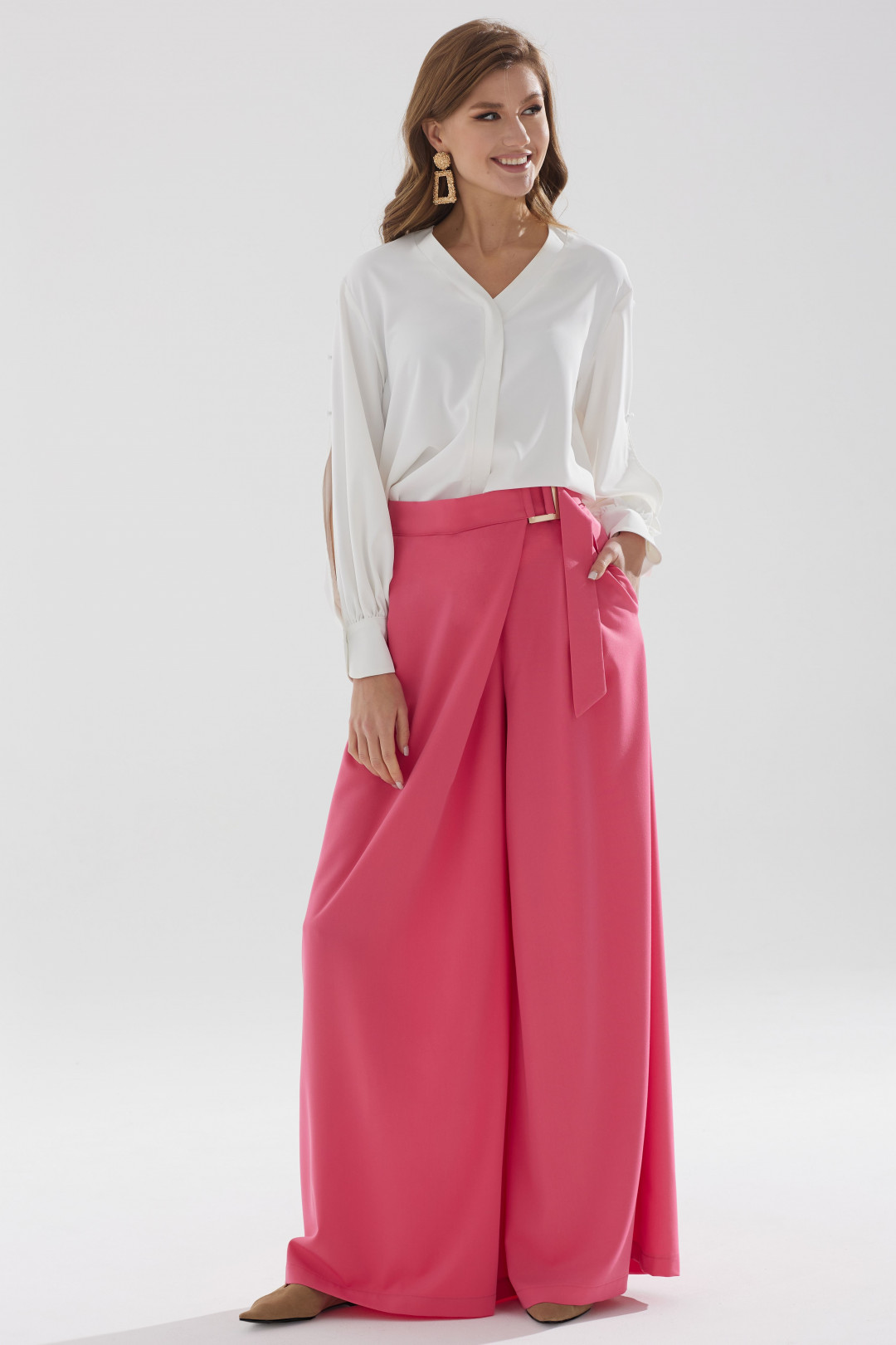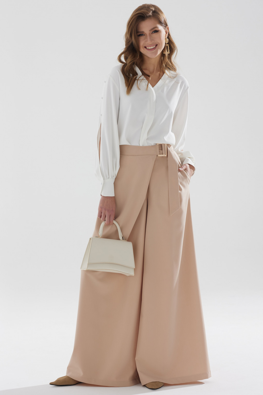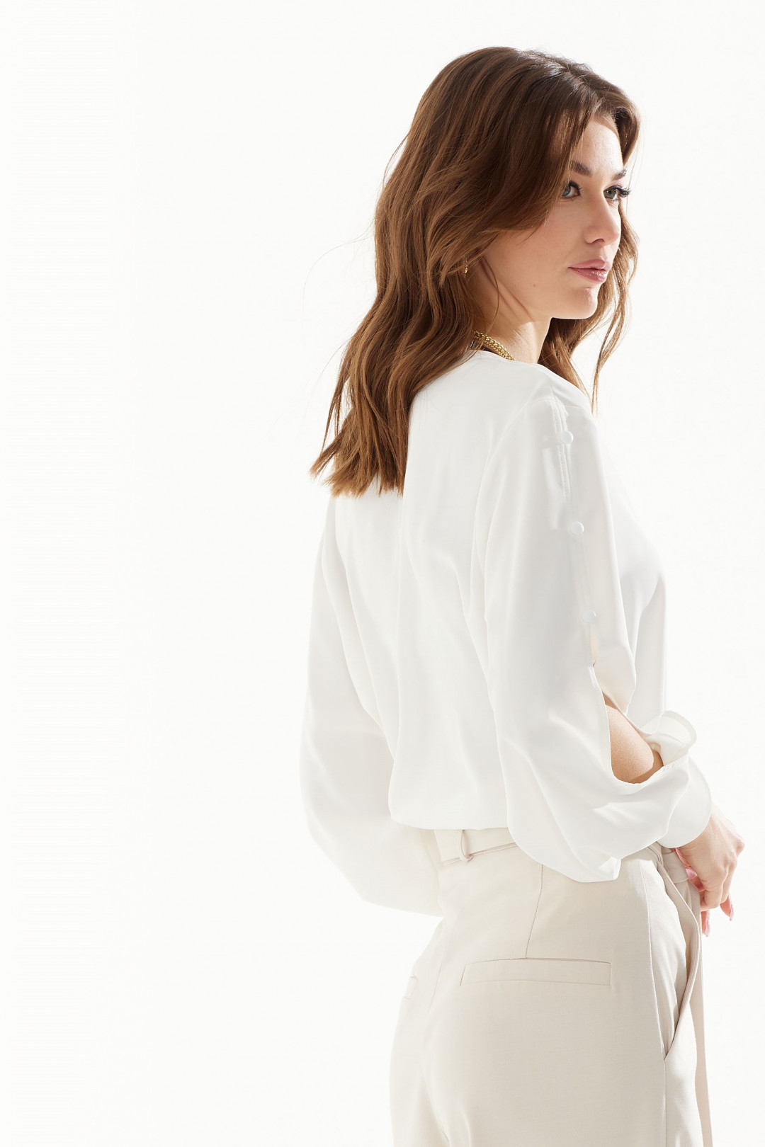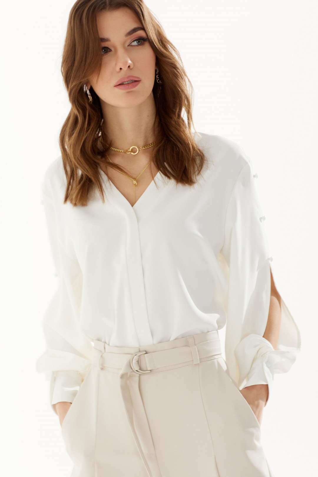 Стильная блузка прямого силуэта из струящейся ткани с фигурным низом. Горловина с V-образным вырезом, по переду декоративная планка. Рукав с декоративным разрезом и пуговицами, с застежкой на манжете.