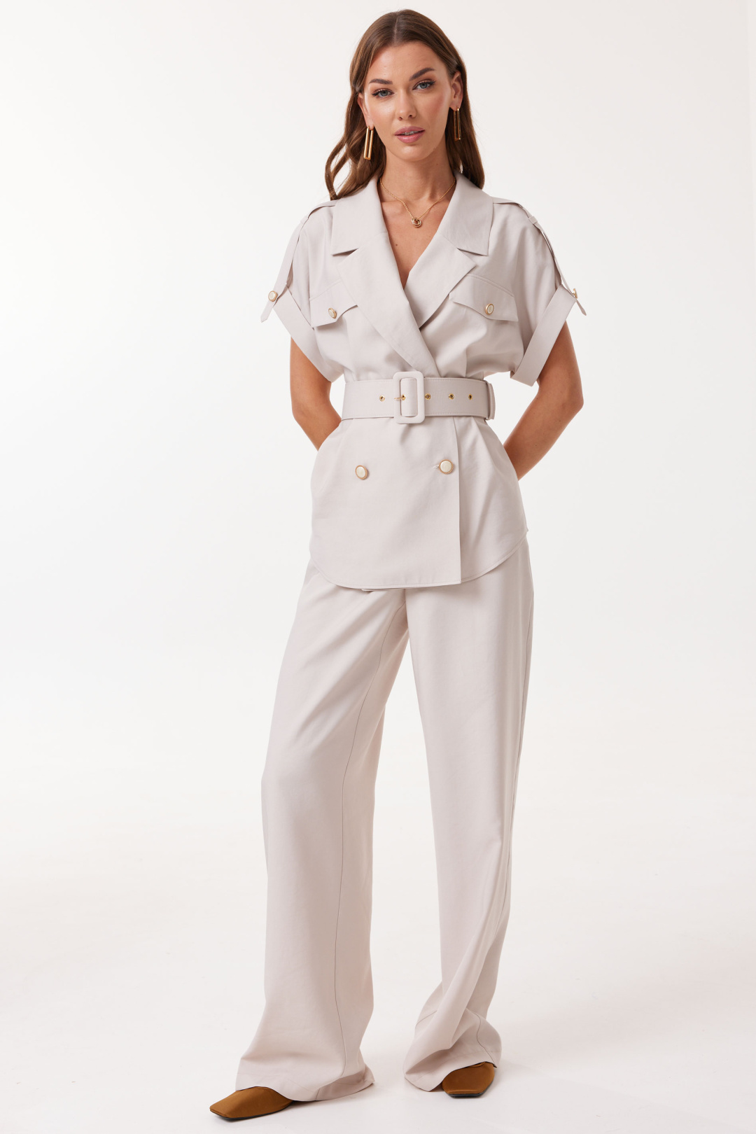 Блузка прямого силуэта с фигурным низом из плательной ткани. Воротник пиджачного типа с двубортной застежкой. Рукав цельнокроеный, по низу манжета и декоративная пата. По переду декоративные клапаны. В комплект входит ремень. Обращаем ваше внимание, что фурнитура может отличаться от фото.