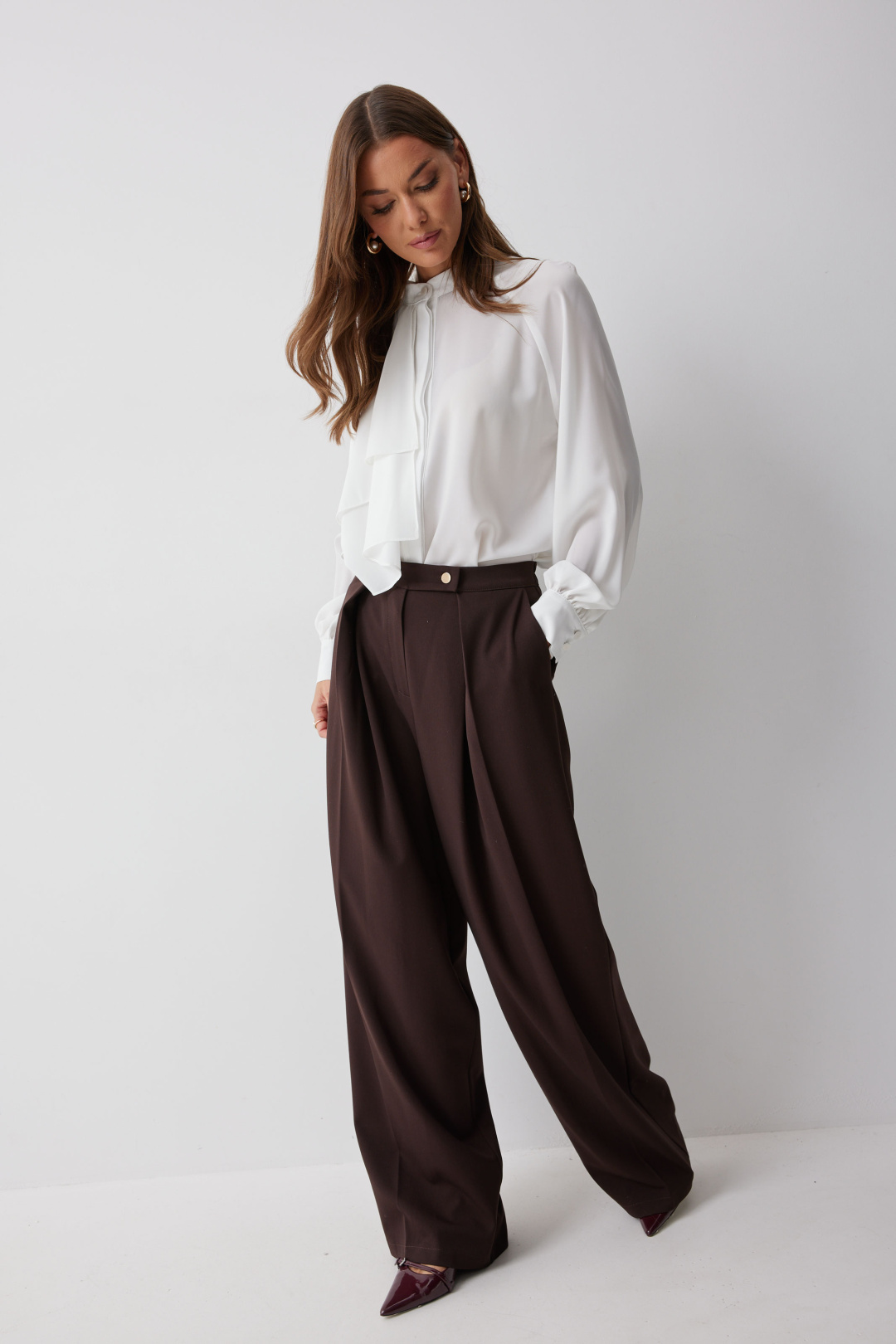 Стильная блузка полуприлегающего силуэта. Рукав – реглан, по низу на манжете со сборкой, застежка на петли и пуговицы. В правую половинку переда, в шов, вставлены декоративные воланы. Воротник-стойка, по центру планка с застежкой на петли и пуговицы.