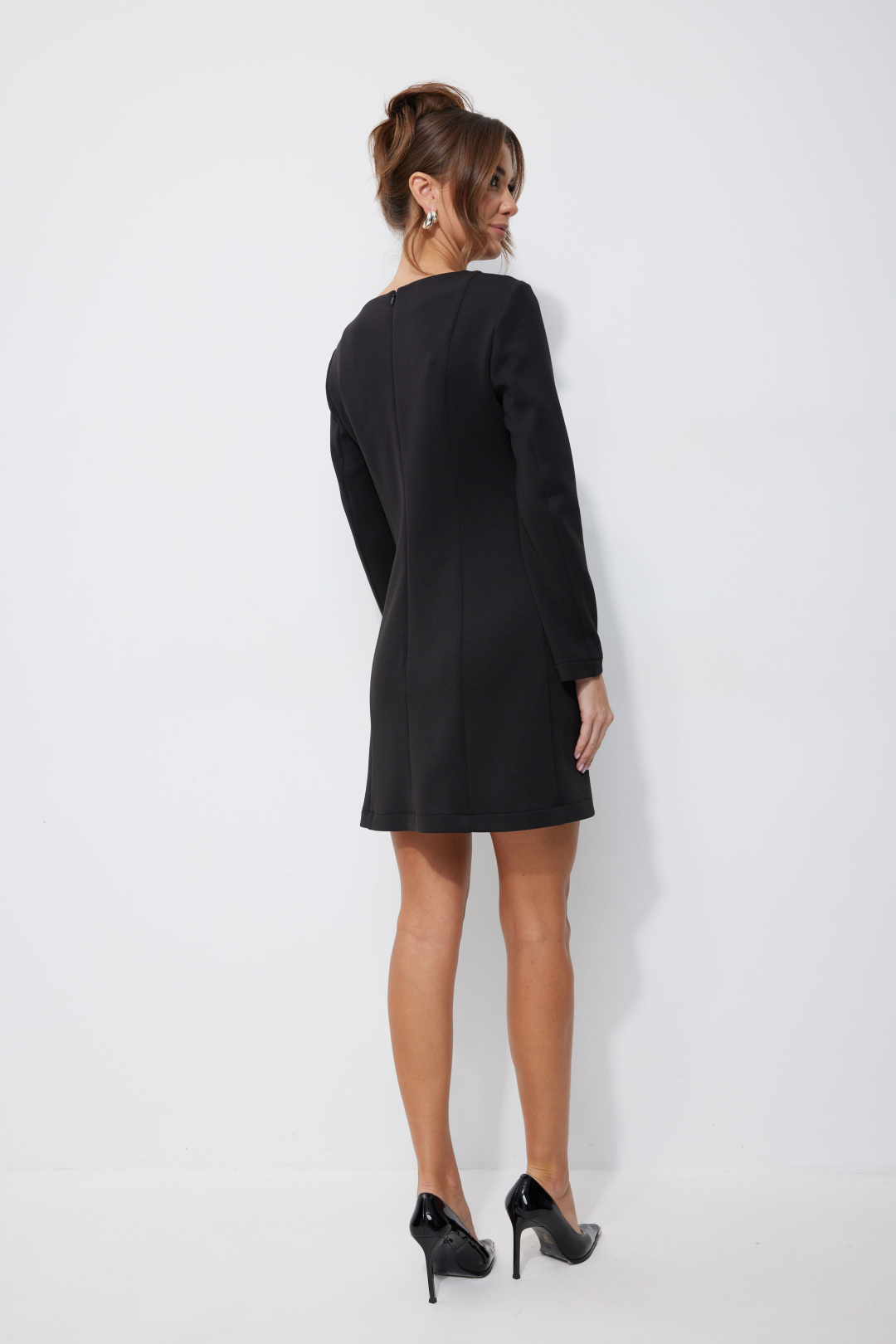 Нарядное платье из трикотажного полотна, длина мини. Платье прилегающего силуэта с небольшим расширением по низу. С рельефами по переду и спинке. По переду слева вдоль рельефа пришивной декор «цветы». По переду слева рельеф с разрезом по низу. Рукав втачной, длинный. Вырез горловины «лодочка». Потайная молния в среднем шве спинки. Обращаем Ваше внимание, что декор может незначительно отличаться от фото.