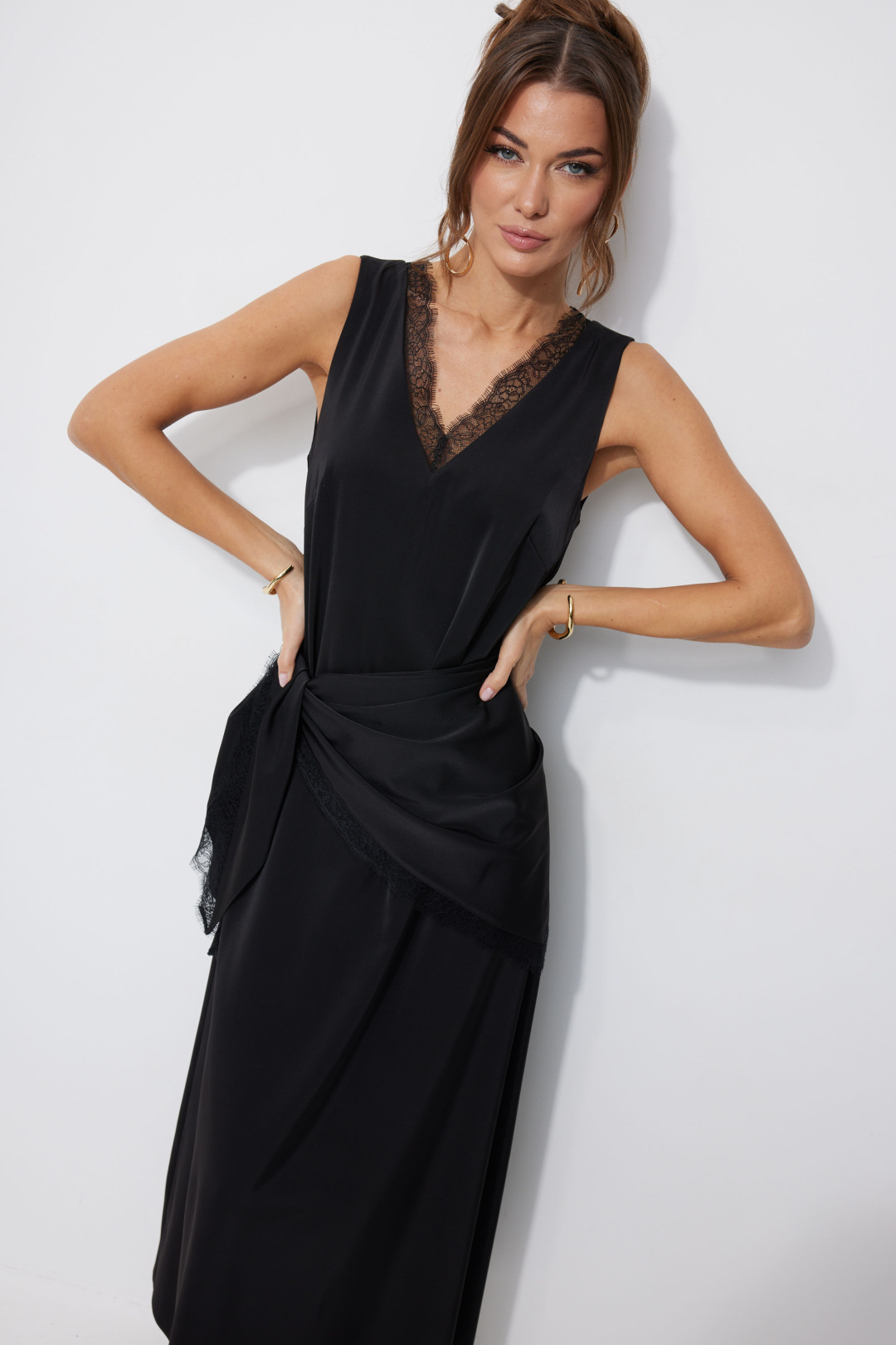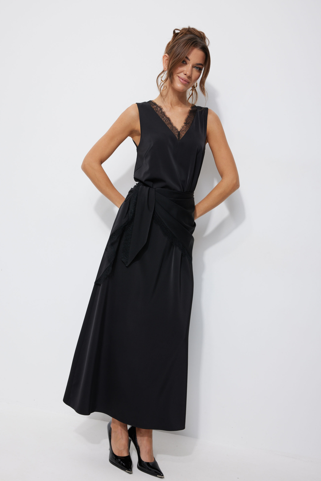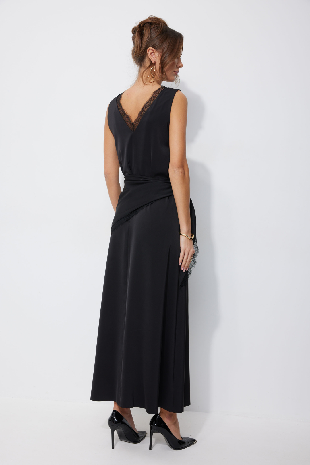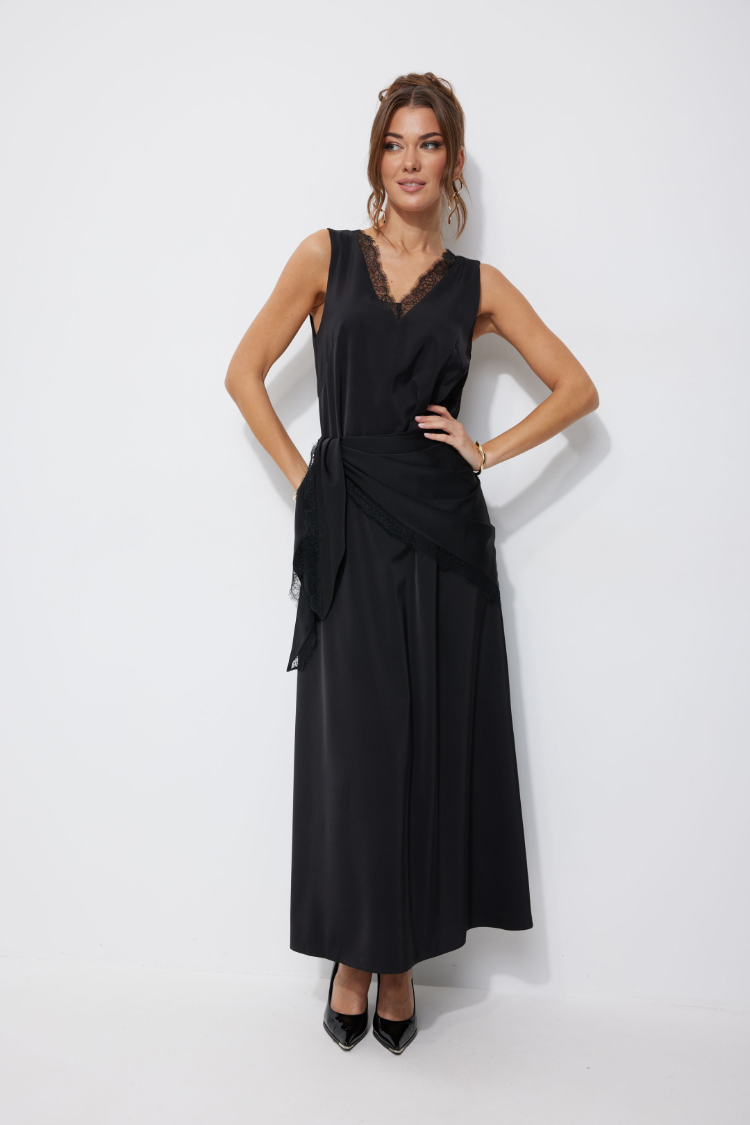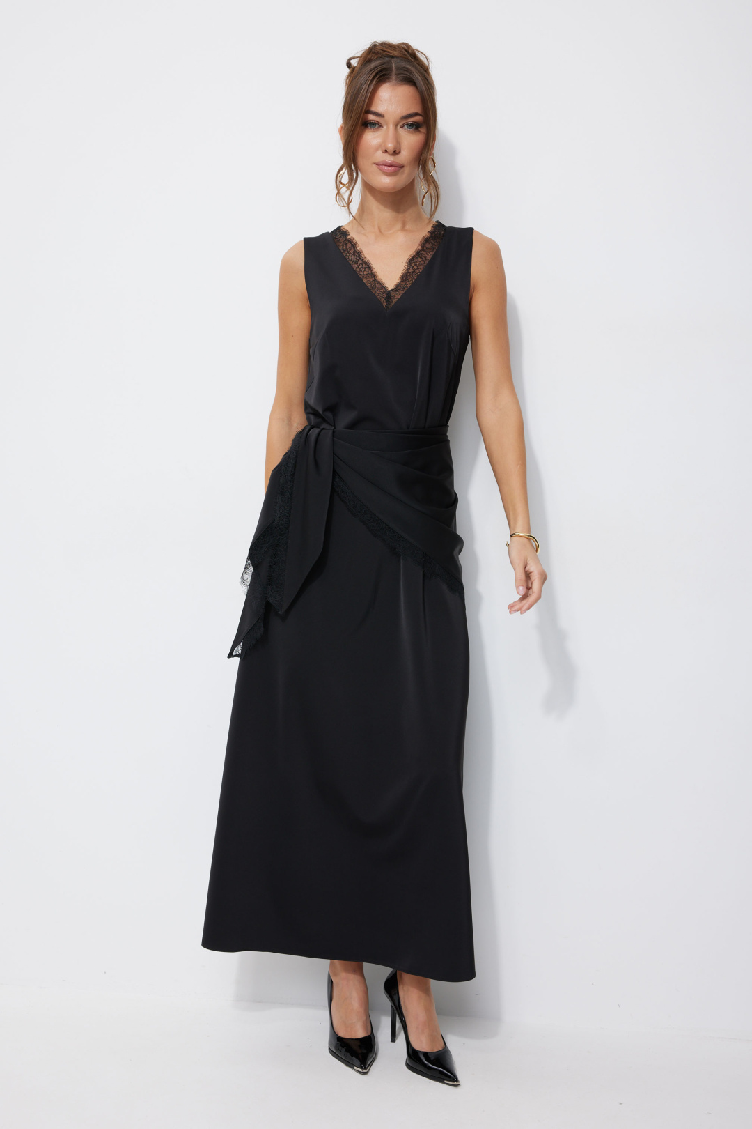 Нарядное платье из струящейся ткани, длина макси. Платье свободного кроя, прямое, расширенное к низу. С глубоким V-образным  вырезом горловины по  переду и спинке, декорированным французским кружевом. По переду нагрудные вытачки. Без рукава. Платье дополняется платком из основной ткани. Платок декорирован по двум срезам французским кружевом. Обращаем Ваше внимание, что кружево может незначительно отличаться от фото.
