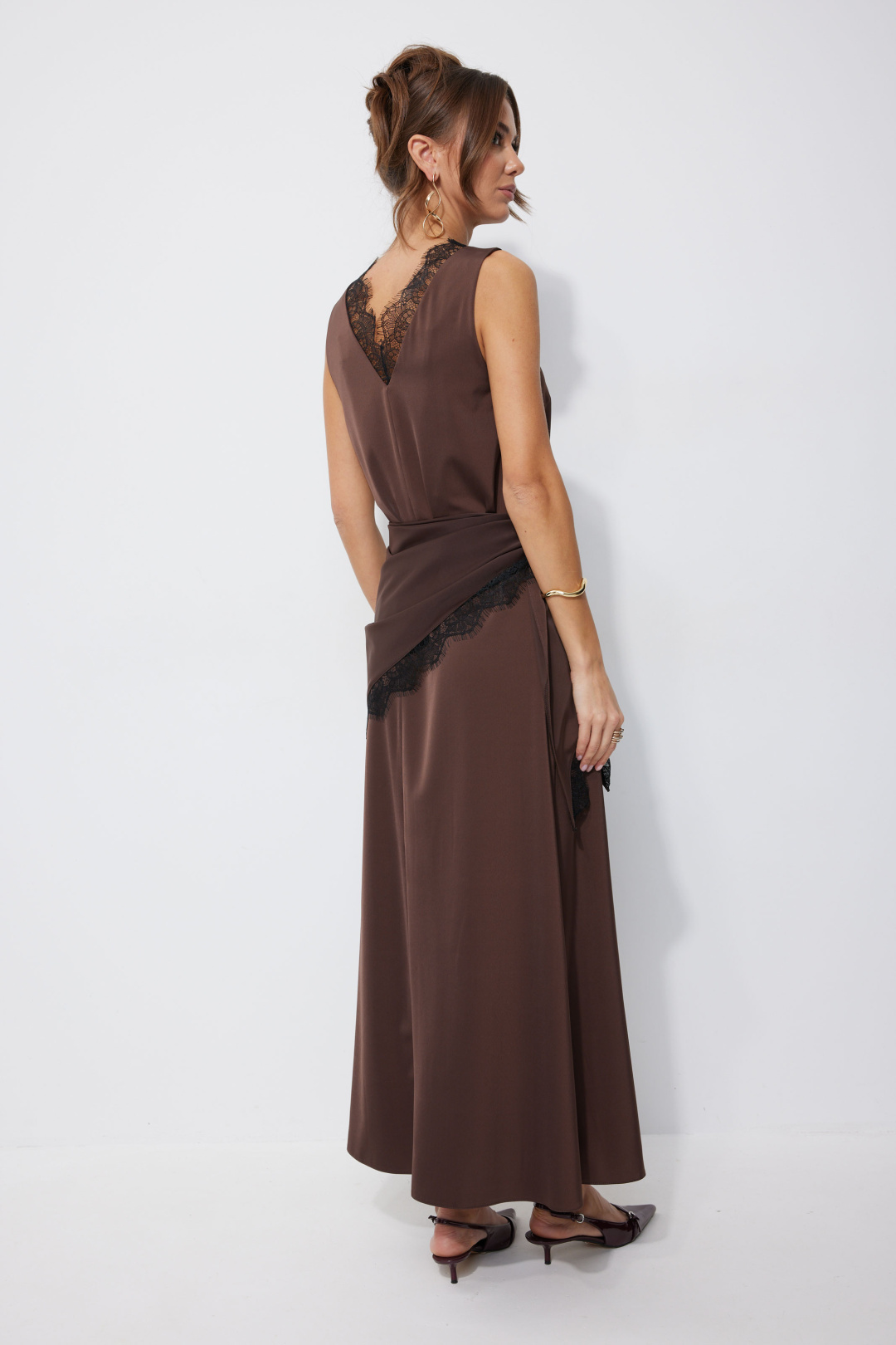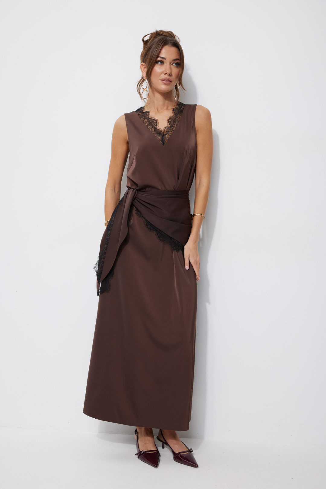 Нарядное платье из струящейся ткани, длина макси. Платье свободного кроя, прямое, расширенное к низу. С глубоким V-образным вырезом горловины по переду и спинке, декорированным французским кружевом. По переду нагрудные вытачки. Без рукава. Платье дополняется платком из основной ткани. Платок декорирован по двум срезам французским кружевом. Обращаем Ваше внимание, что кружево может незначительно отличаться от фото.