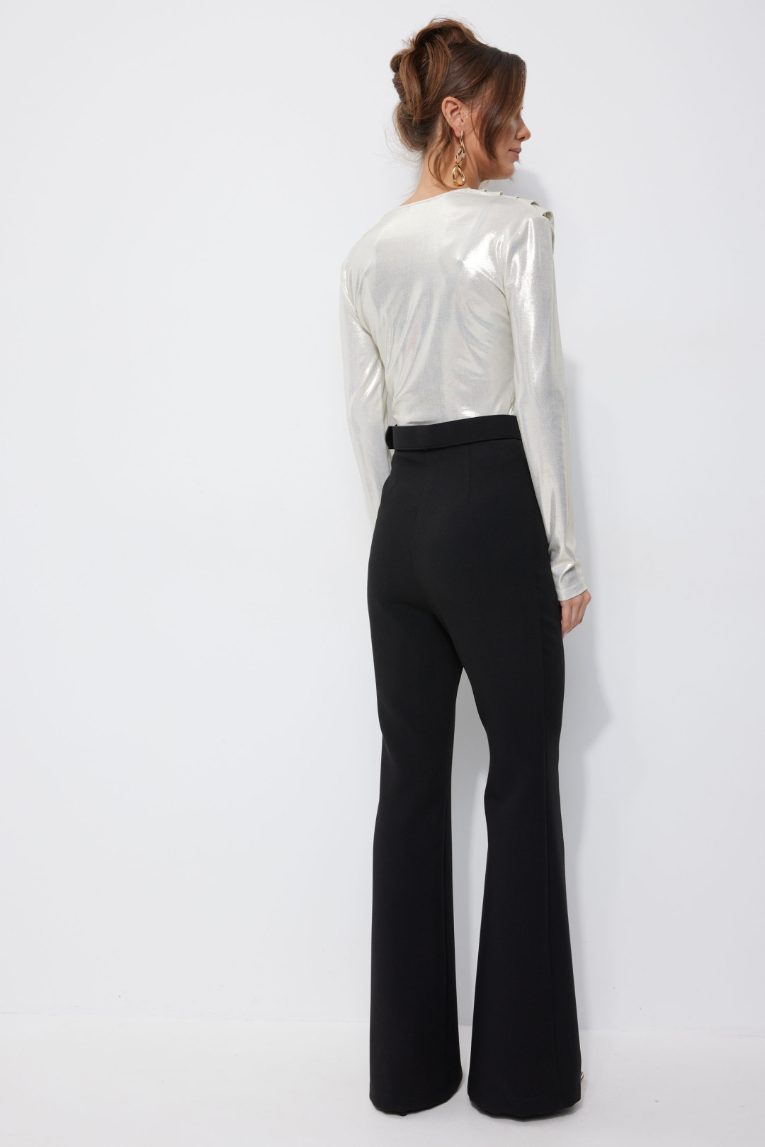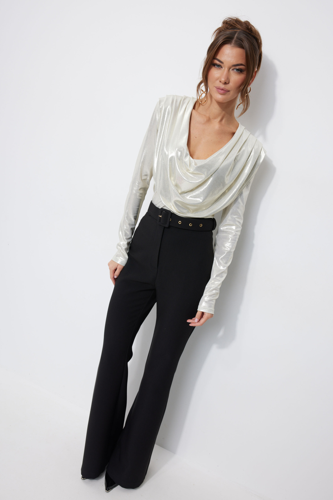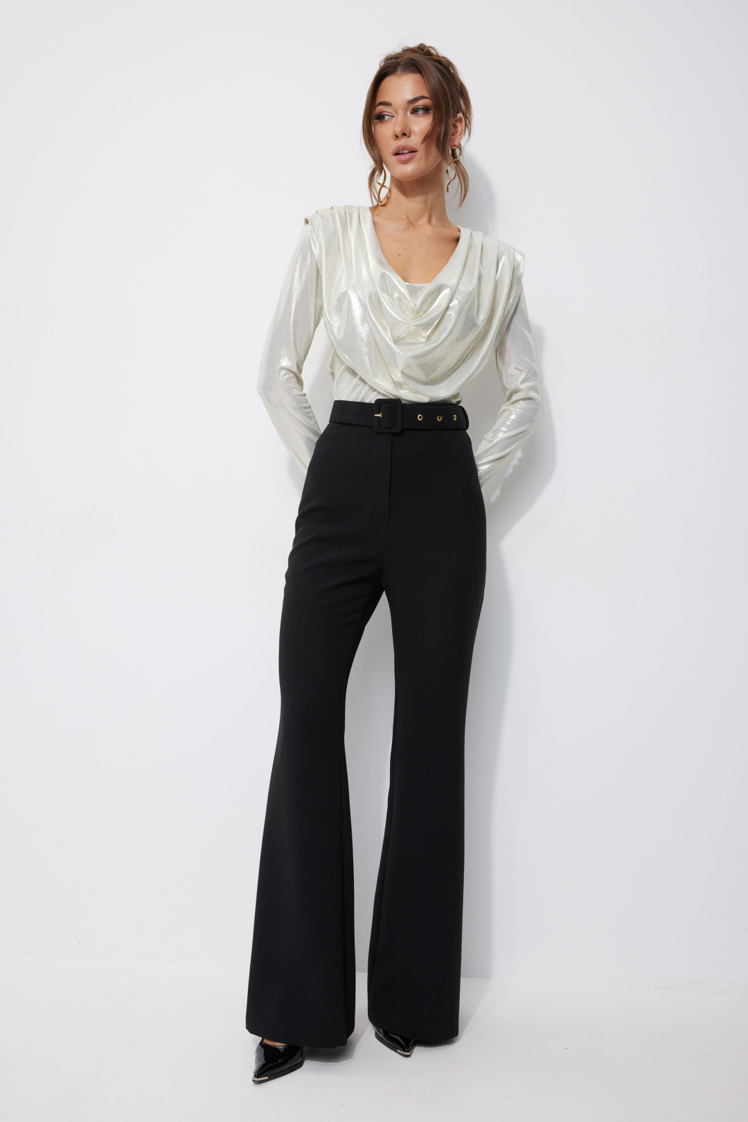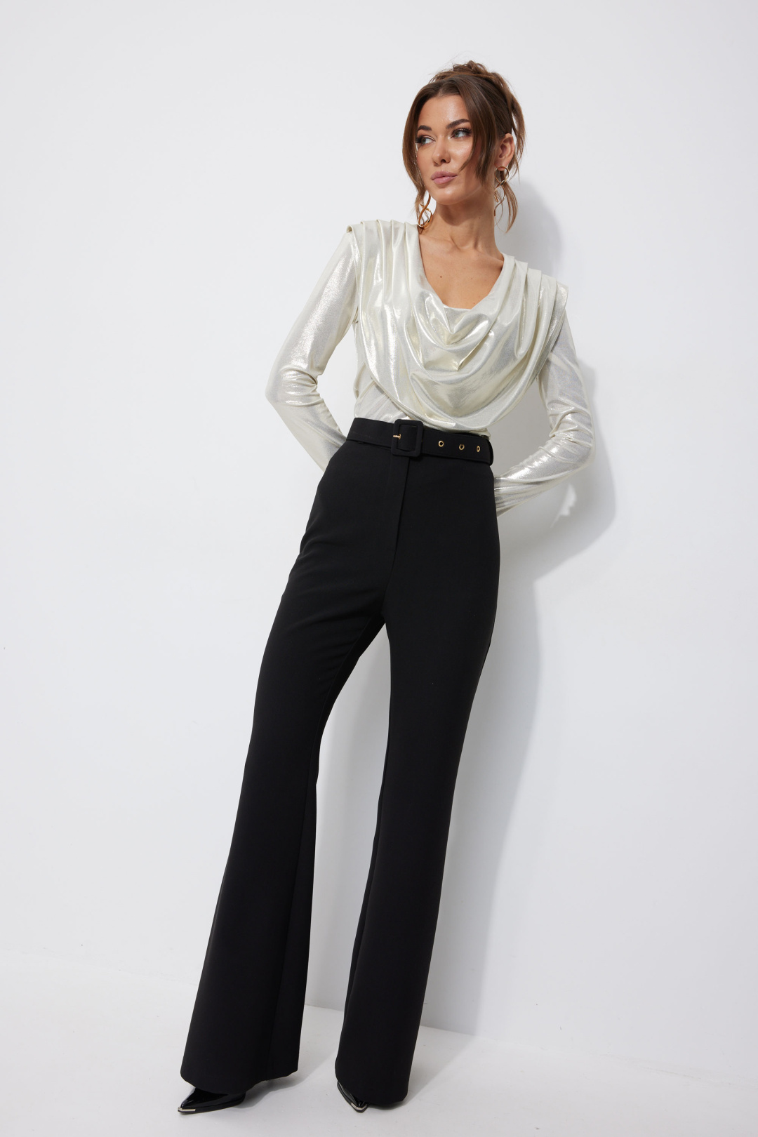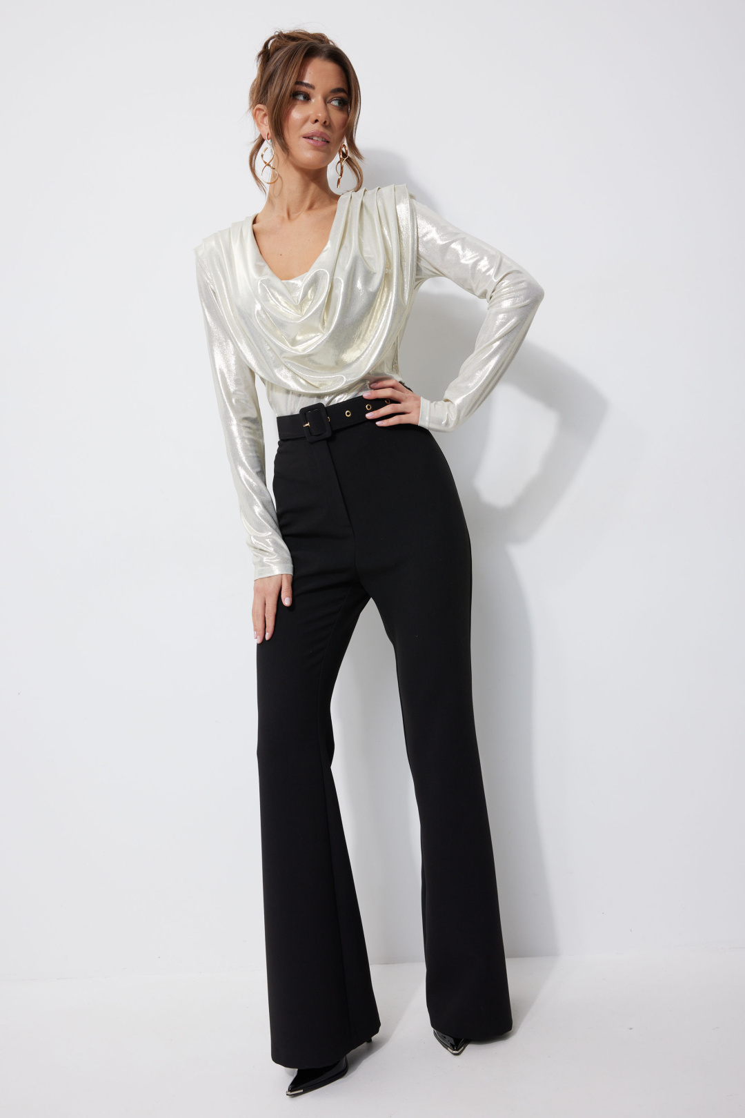 Блузка полуприлегающего  силуэта из трикотажного полотна. По переду глубокий вырез и декоративная деталь  ’качель’.  Рукав втачной удлиненный.