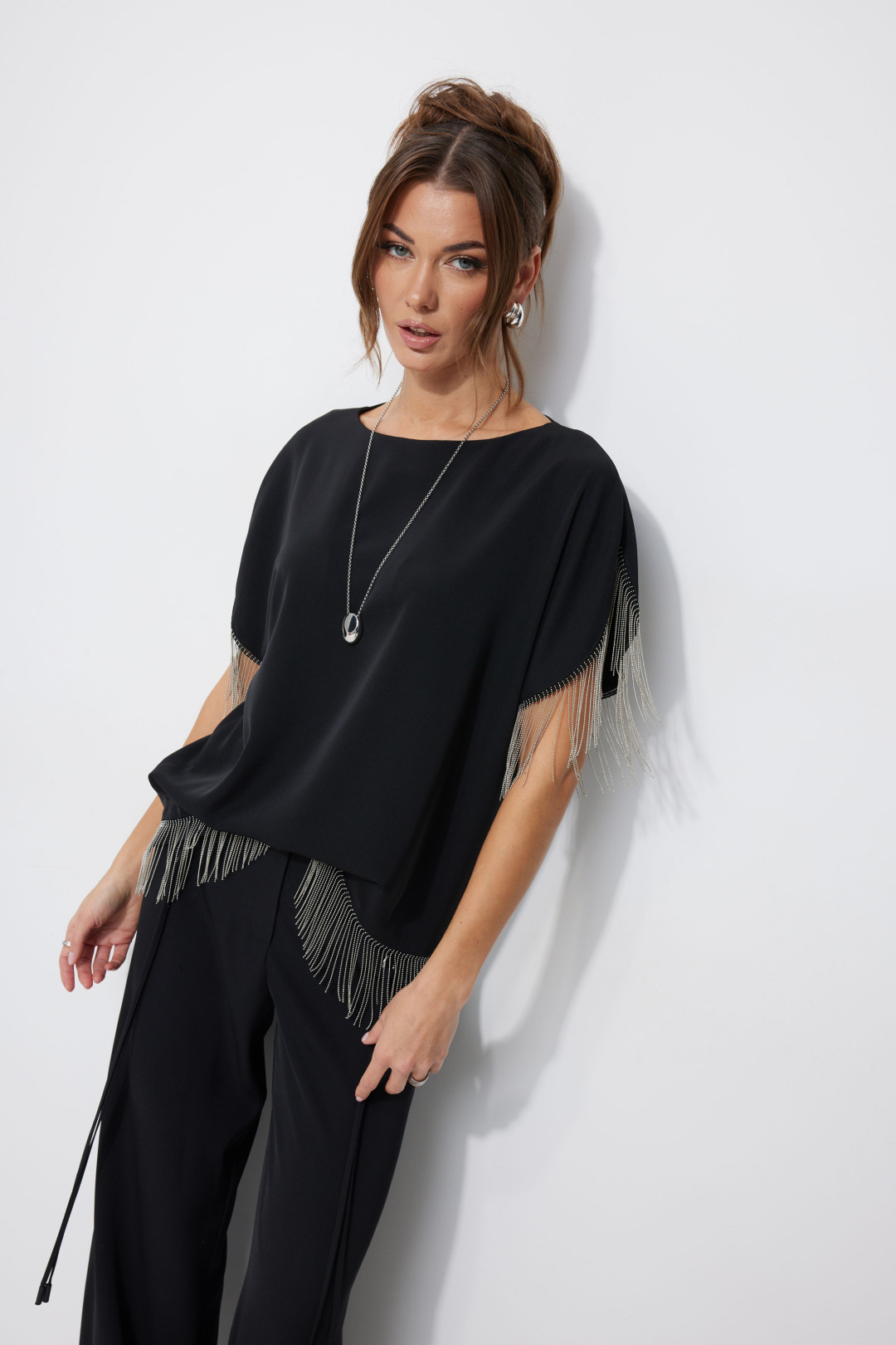Блузка прямого силуэта из струящейся ткани. Горловина-лодочка, на спинке застежка на петлю и пуговицу. Рукав цельнокроеный с фигурным вырезом. По низу рукава и низу изделия декоративная тесьма. Обращаем ваше внимание, что фурнитура может отличаться от фото.