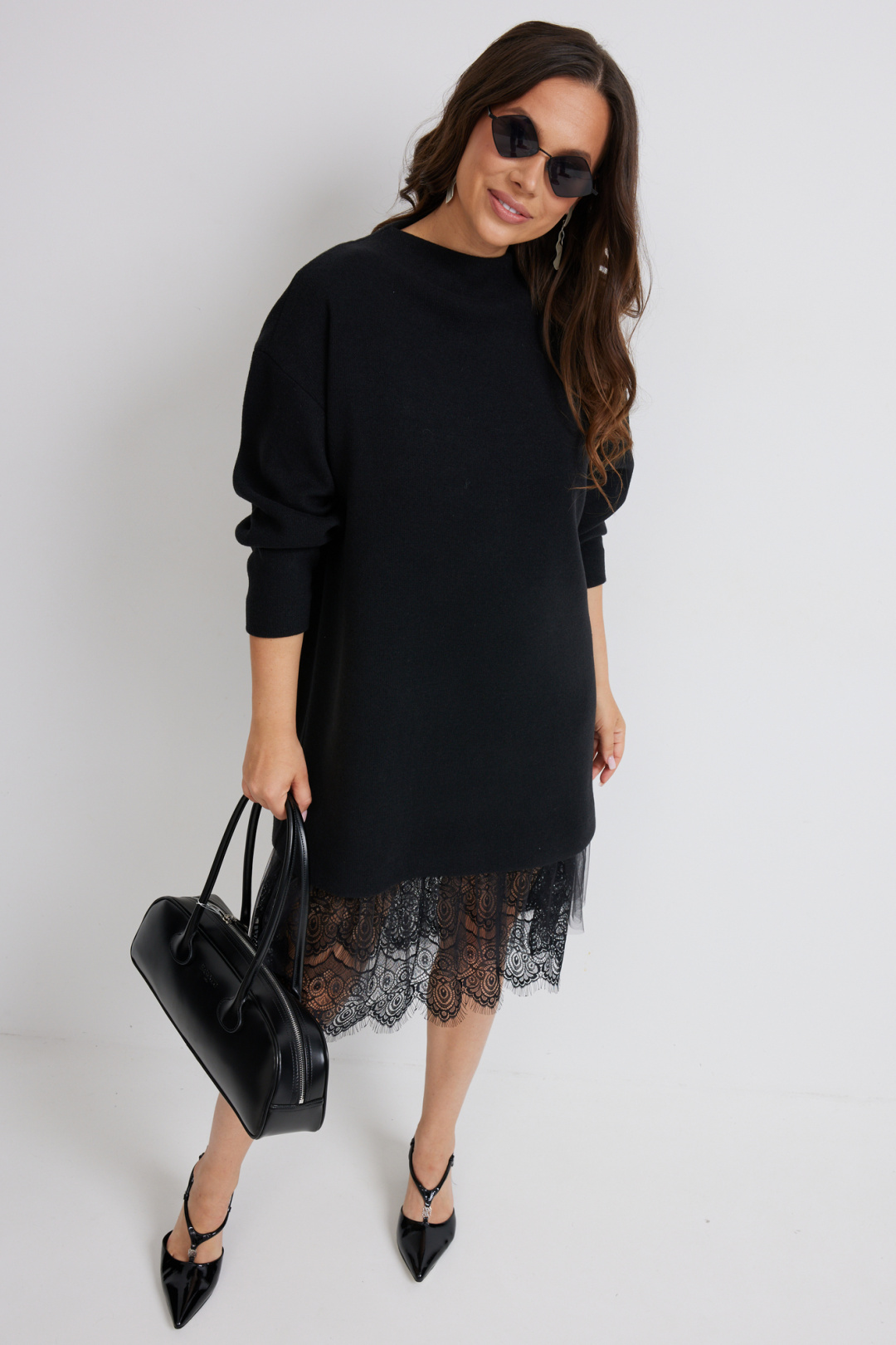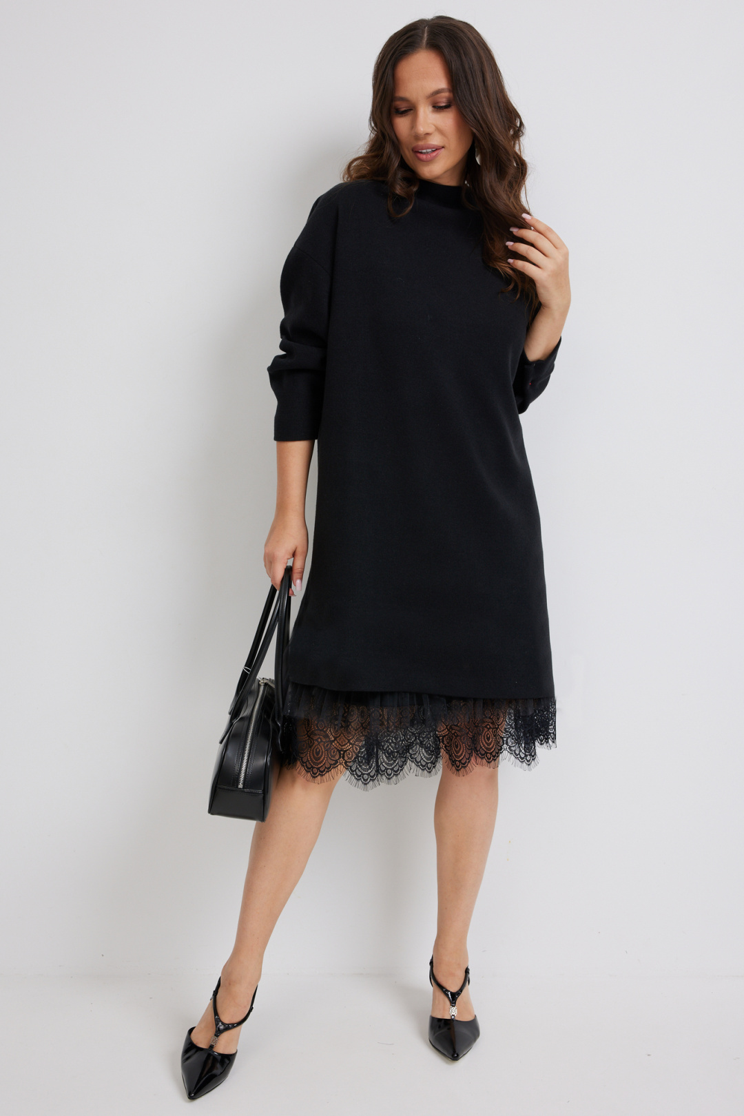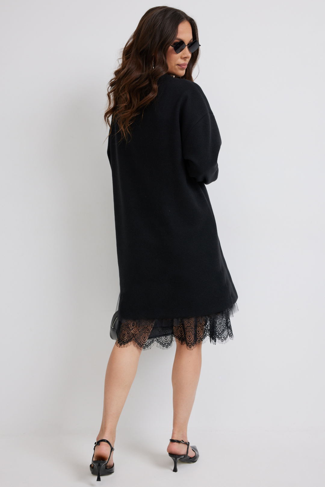 Стильный комплект из верхнего трикотажного платья и нижнего платья-комбинации. Верхнее платье свободного прямого кроя с длинным рукавом. Выполнено из приятного к телу трикотажного полотна средней плотности, который прекрасно держит форму. Нижнее платье-комбинация выполнено из нежного трикотажного полотна, дополненного красивым кружевом и фатином. Комбинация на тонких регулируемых бретелях. Длина верхнего платья от плечевого шва 81см. Длина рукава 60см. Длина нижнего платья 95см.