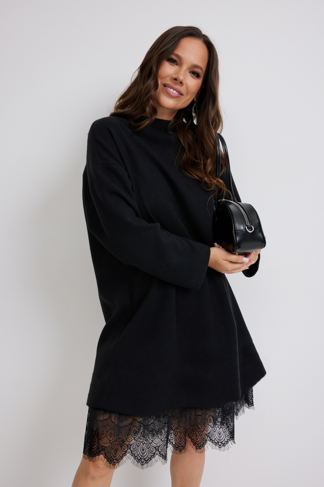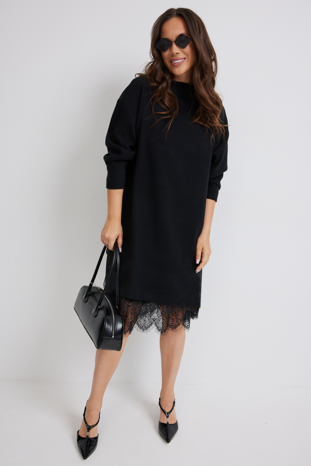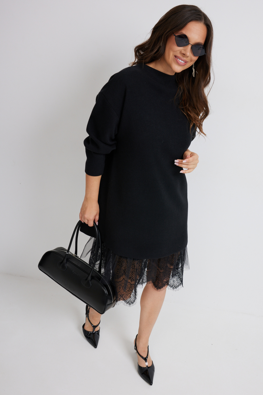 Стильный комплект из верхнего трикотажного платья и нижнего платья-комбинации. Верхнее платье свободного прямого кроя с длинным рукавом. Выполнено из приятного к телу трикотажного полотна средней плотности, который прекрасно держит форму. Нижнее платье-комбинация выполнено из нежного трикотажного полотна, дополненного красивым кружевом и фатином. Комбинация на тонких регулируемых бретелях. Длина верхнего платья от плечевого шва 81см. Длина рукава 60см. Длина нижнего платья 95см.