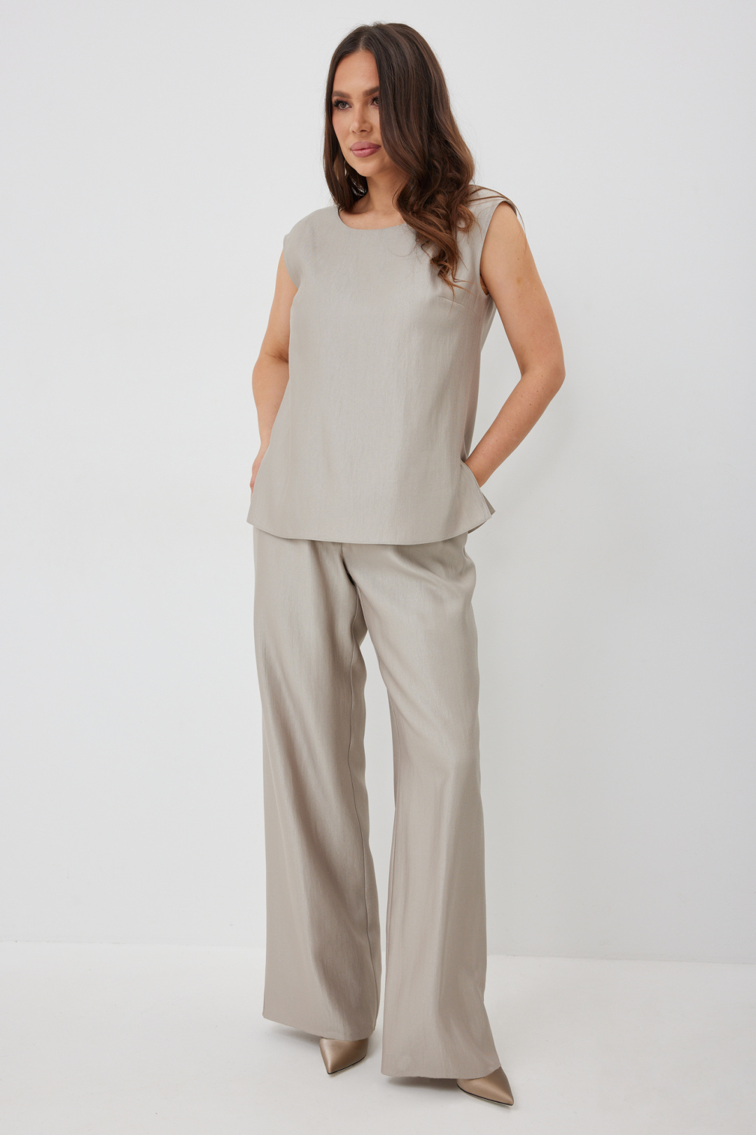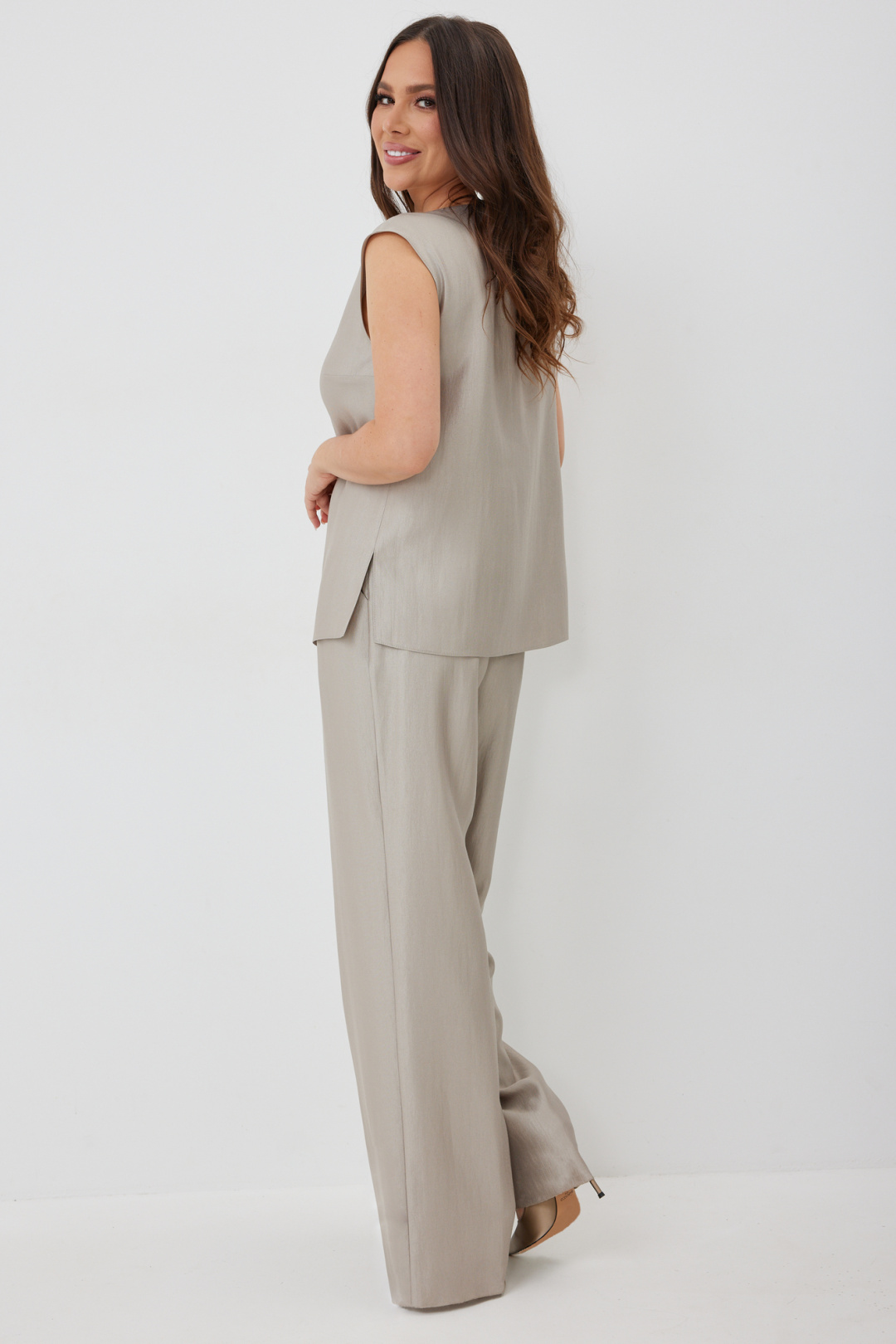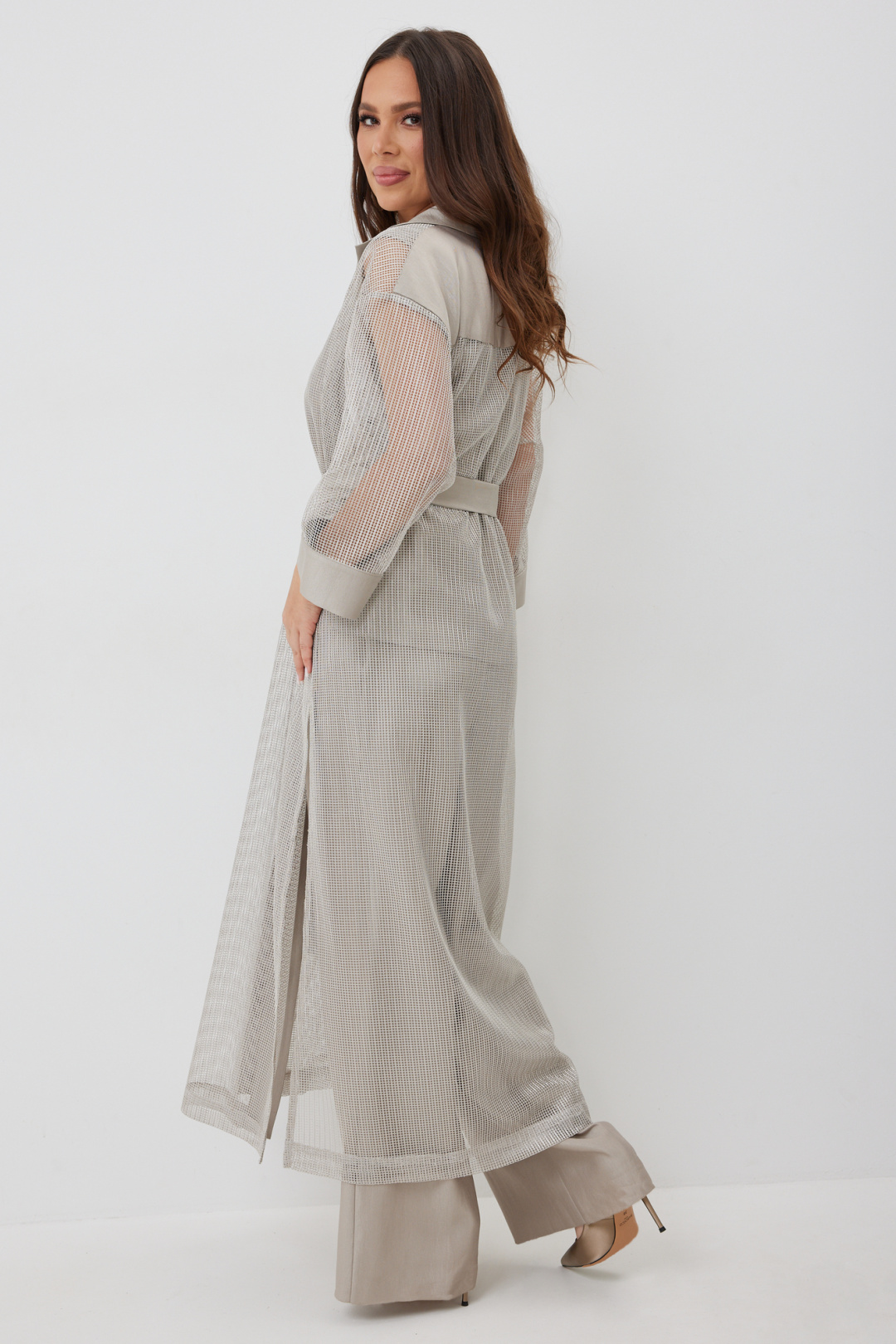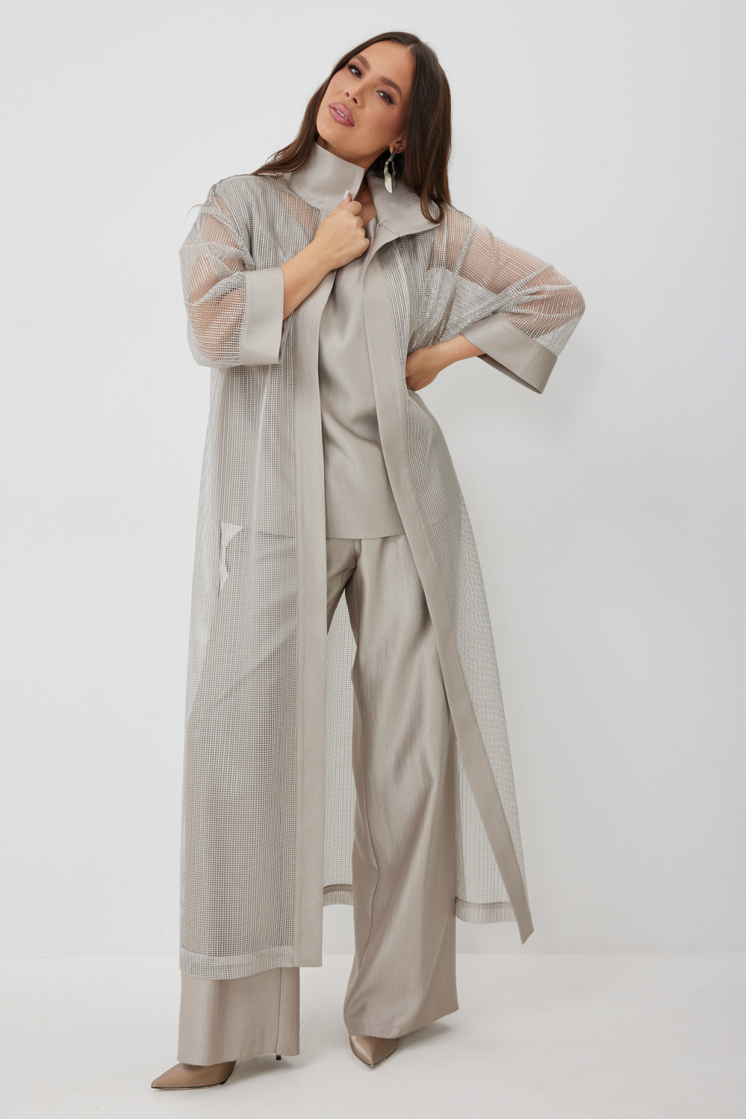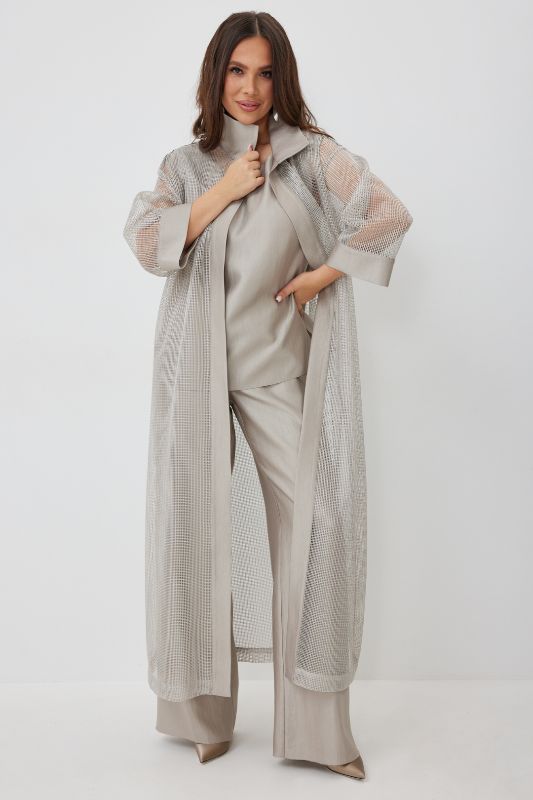 Стильный комплект из длинного кардигана, топа и брюк. Кардиган свободного прямого кроя с разрезами. Выполнен из текстильной сетки с отделкой из гладкой костюмной ткани. Рукав втачной, слегка спущен. Дополнен съемным поясом. Топ и брюки выполнены из красивой костюмной гладкой ткани. Топ свободного прямого кроя. Горловина округлой формы. Брюки классического прямого кроя. Посадка средняя. Пояс притачной, дополнен эластичной тесьмой. Брюки дополнены удобными боковыми и задними карманами. Застежка гульфик на молнию и пуговицу. Длина кардигана от плечевого шва 136см. Длина рукава 47см. Длина топа от плечевого шва 67см. Длина брюк по боковому шву 107см.
