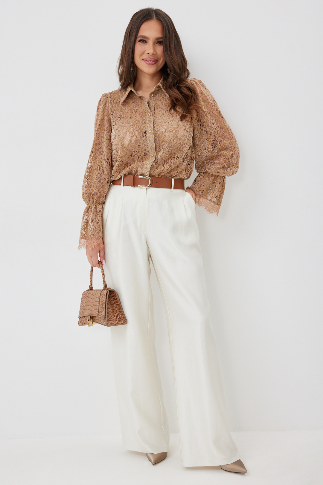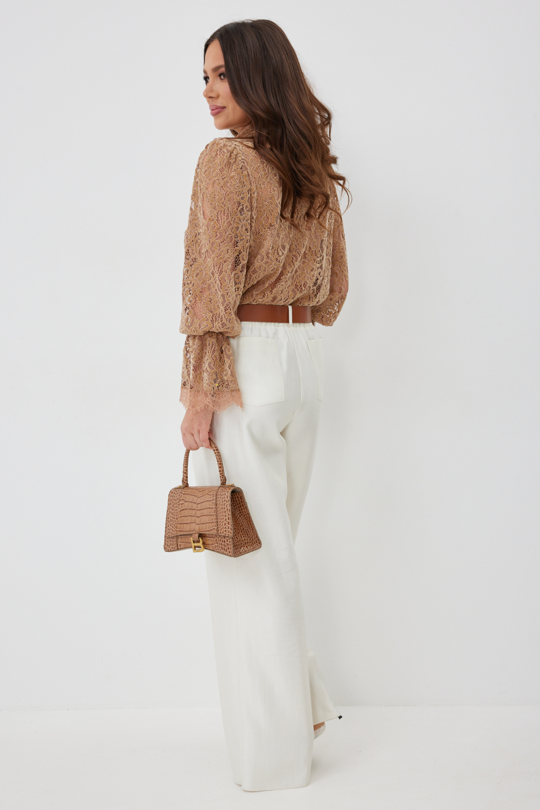 Стильный готовый образ с невероятным сочетанием кружевной блузы в нежном карамельном оттенке с шикарными брюками в красивом молочном цвете. Блуза прямого кроя с нагрудными вытачками. Рукав втачной, по низу присборен на эластичную тесьму и дополнен притачной кружевной манжетой. Застежка центральная на пришивные пуговицы. Воротник отложной на стойке. Блуза выполнена из красивого нежного бархатного кружева премиум качества. Брюки классического прямого кроя. Посадка средняя. Пояс притачной, дополнен эластичной тесьмой. Брюки дополнены удобными боковыми и задними карманами. Застежка гульфик на молнию и пуговицу. Выполнены из красивой гладкой костюмной ткани с жемчужным отливом. Красивый пояс в комплекте. Длина блузы от плечевого шва 67см. Длина рукава 69 см. Длина брюк по боковому шву 107 см.