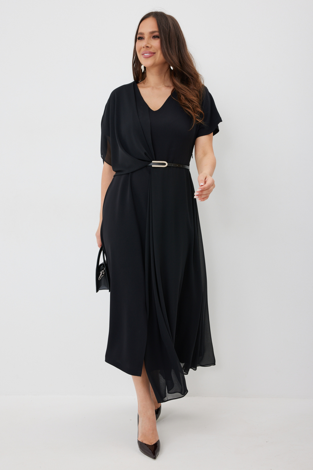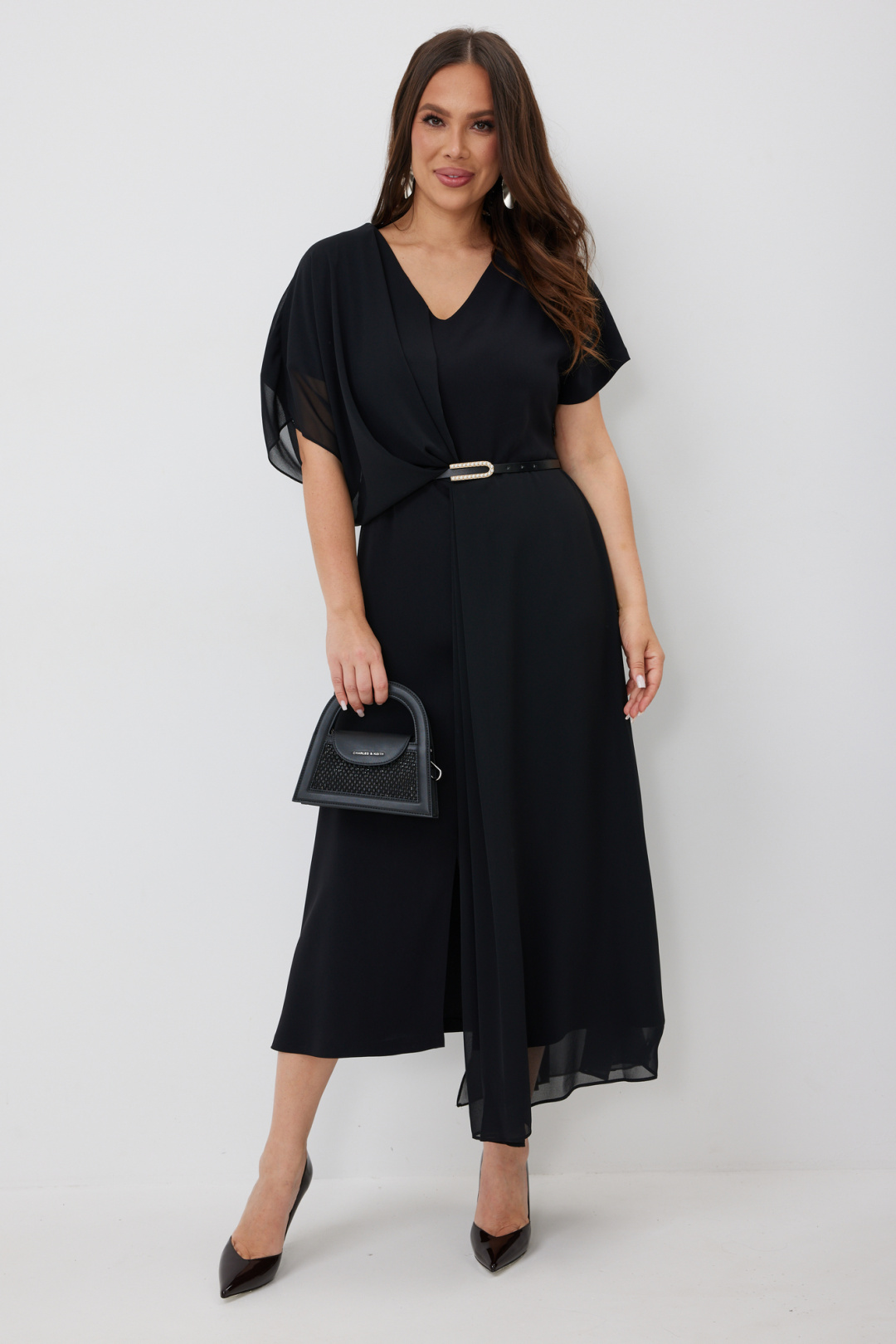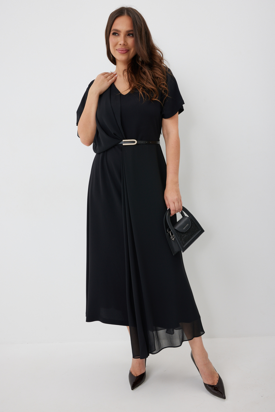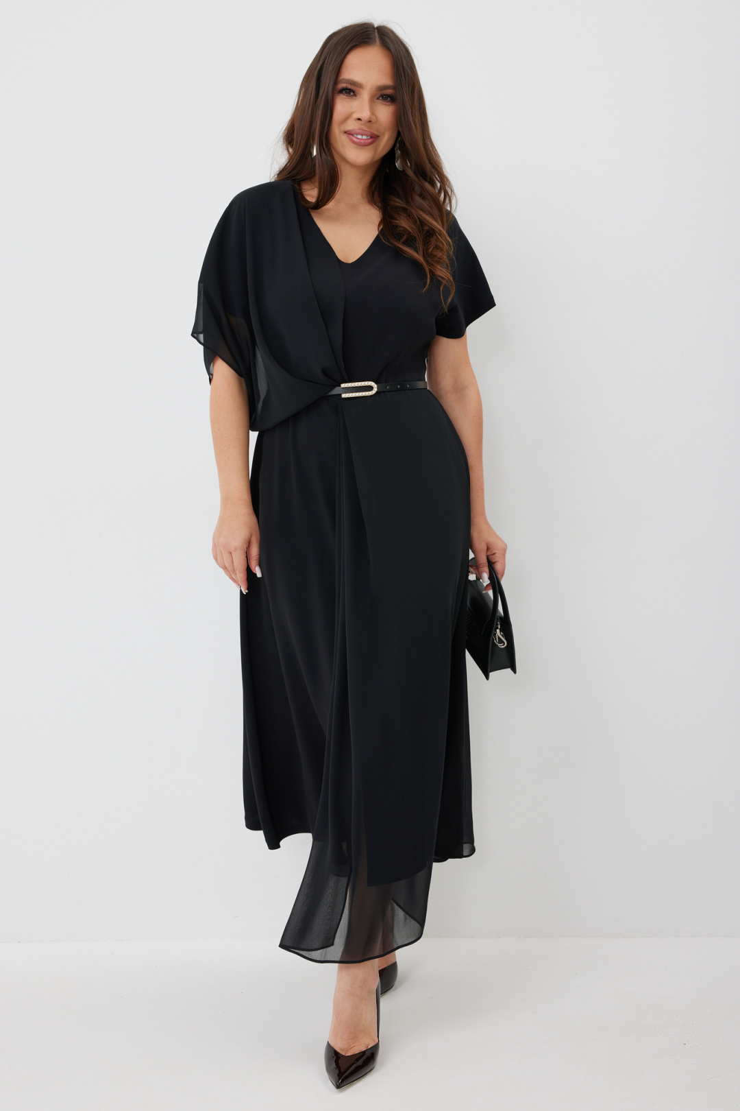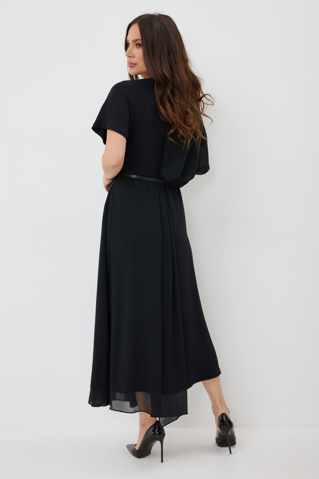 Элегантное платье свободного силуэта. Выполнено из основной красивой плательной ткани в дополнении с легким струящимся шифоном в цвет основной ткани. Платье отрезное по талии. Горловина с V-образным вырезом. Рукав цельнокроеный с напуском. В боковом шве застежка на потайную молнию. В комплекте кожаный пояс с красивой пряжкой. Длина платья 128/138 см.