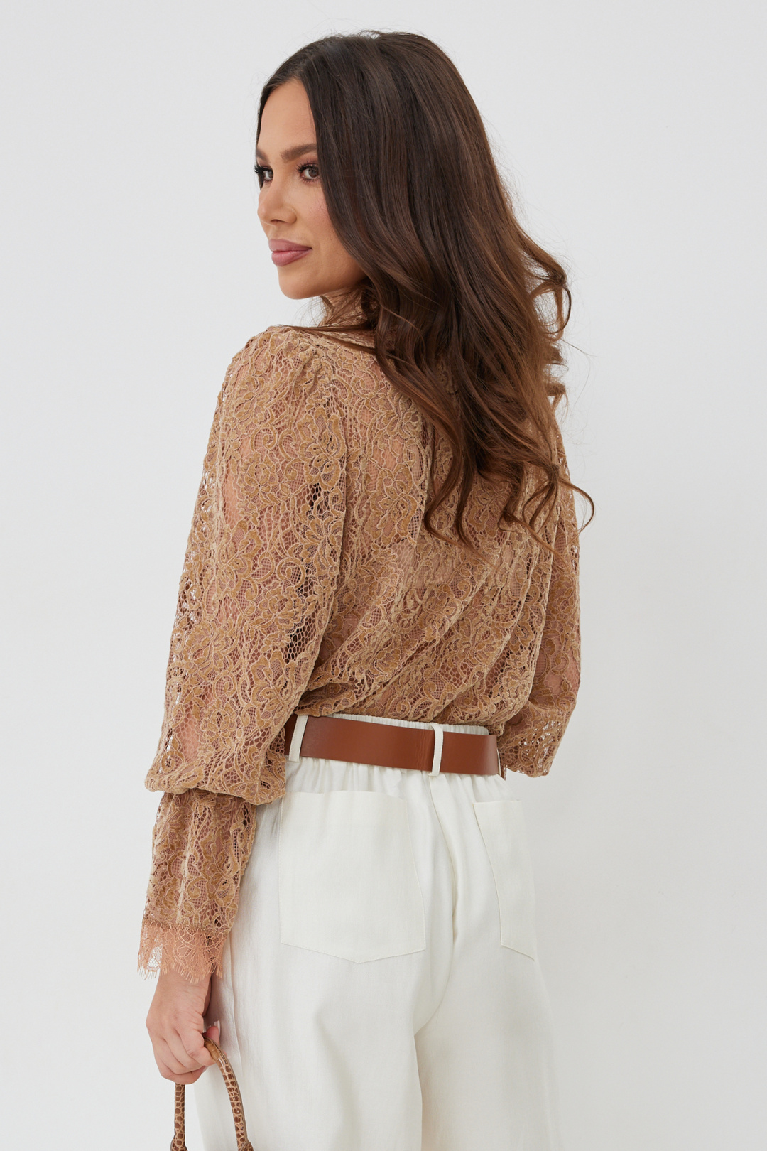 Невероятно нежная и стильная блуза прямого кроя с нагрудными вытачками. Рукав втачной, по низу присборен на эластичную тесьму и дополнен притачной кружевной манжетой. Застежка центральная на пришивные пуговицы. Воротник отложной на стойке. Блуза выполнена из красивого нежного бархатного кружева премиум качества. Длина блузы от плечевого шва 67см. Длина рукава 69 см.