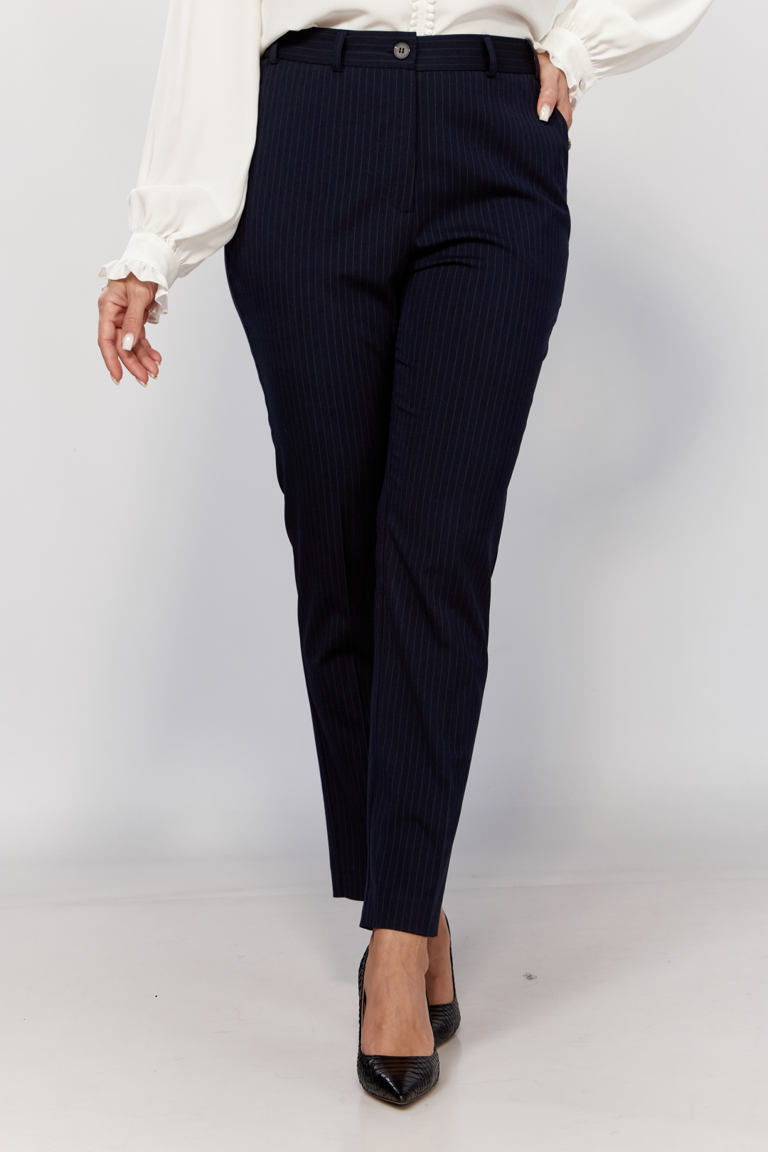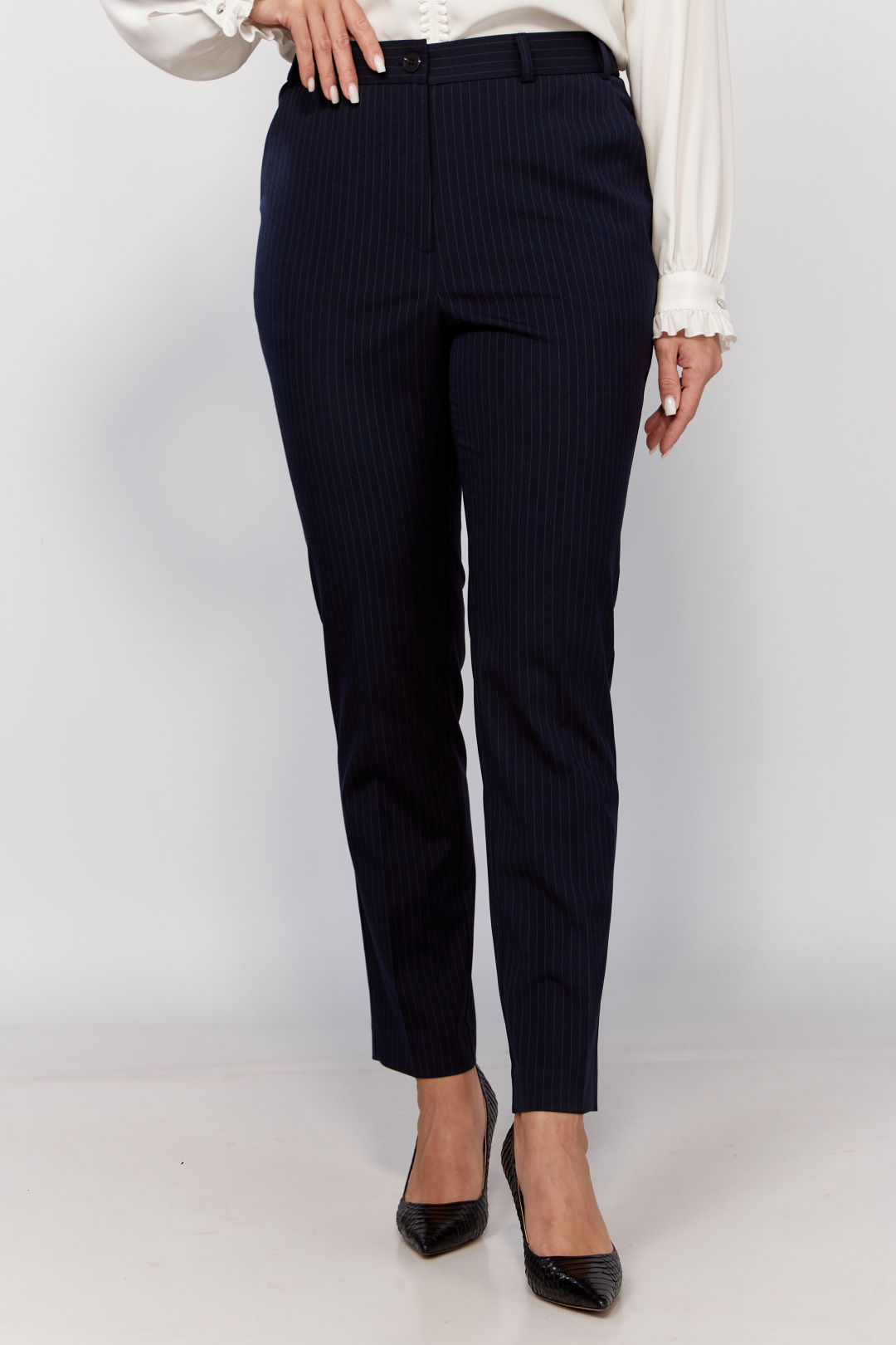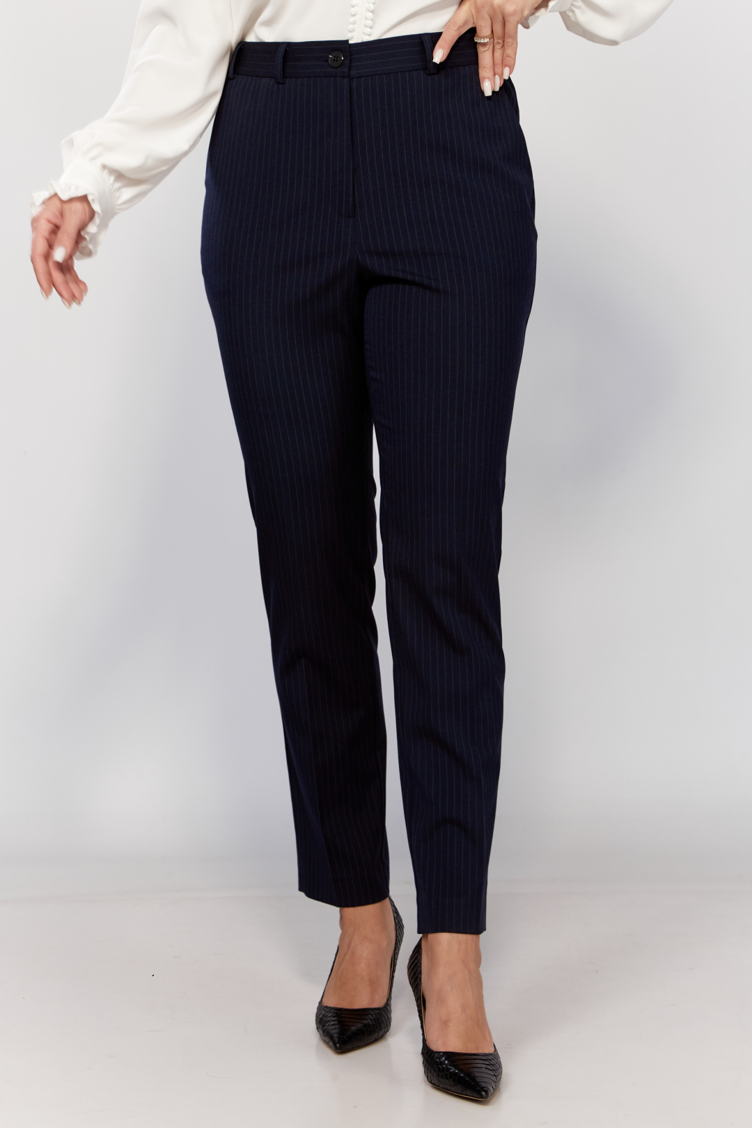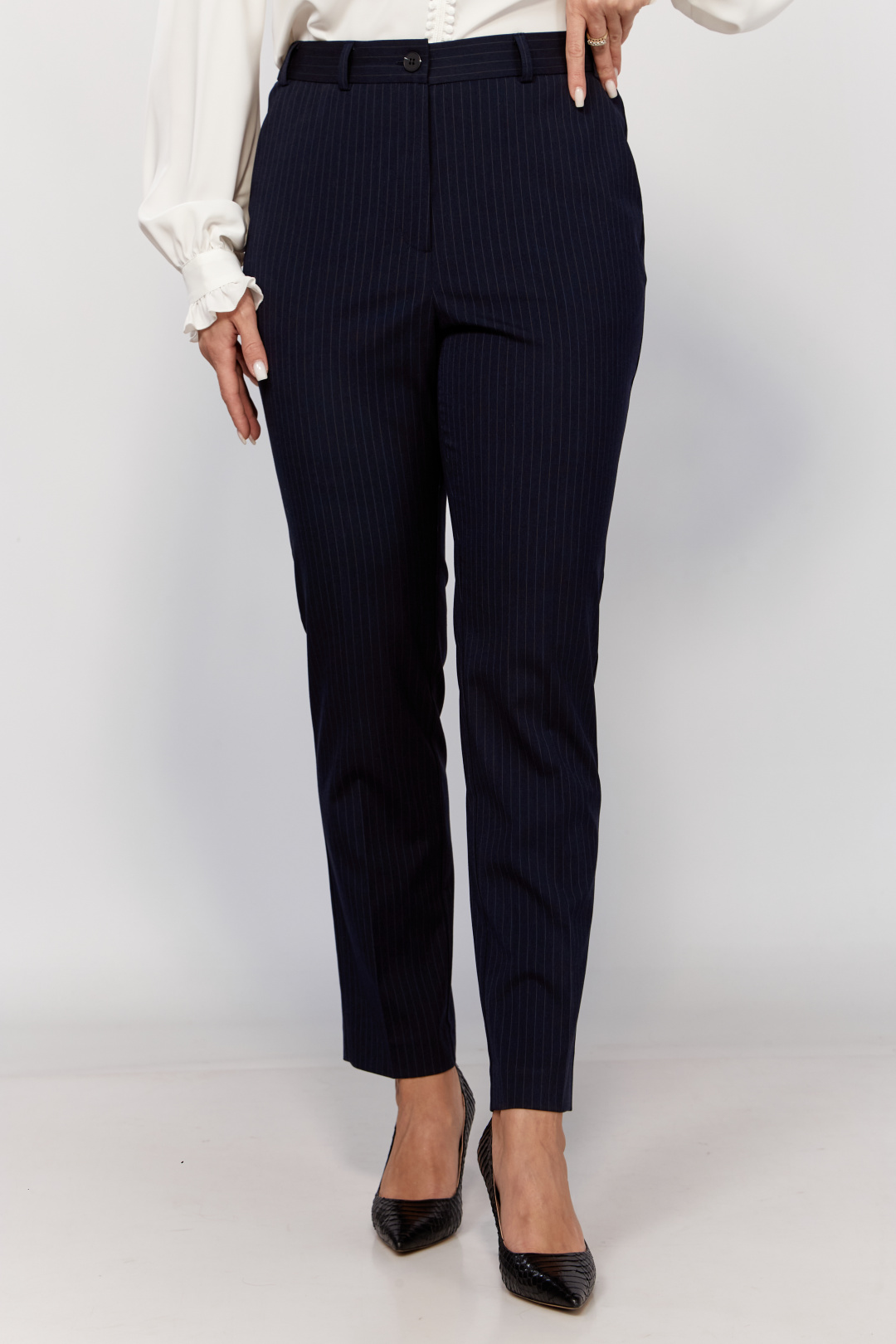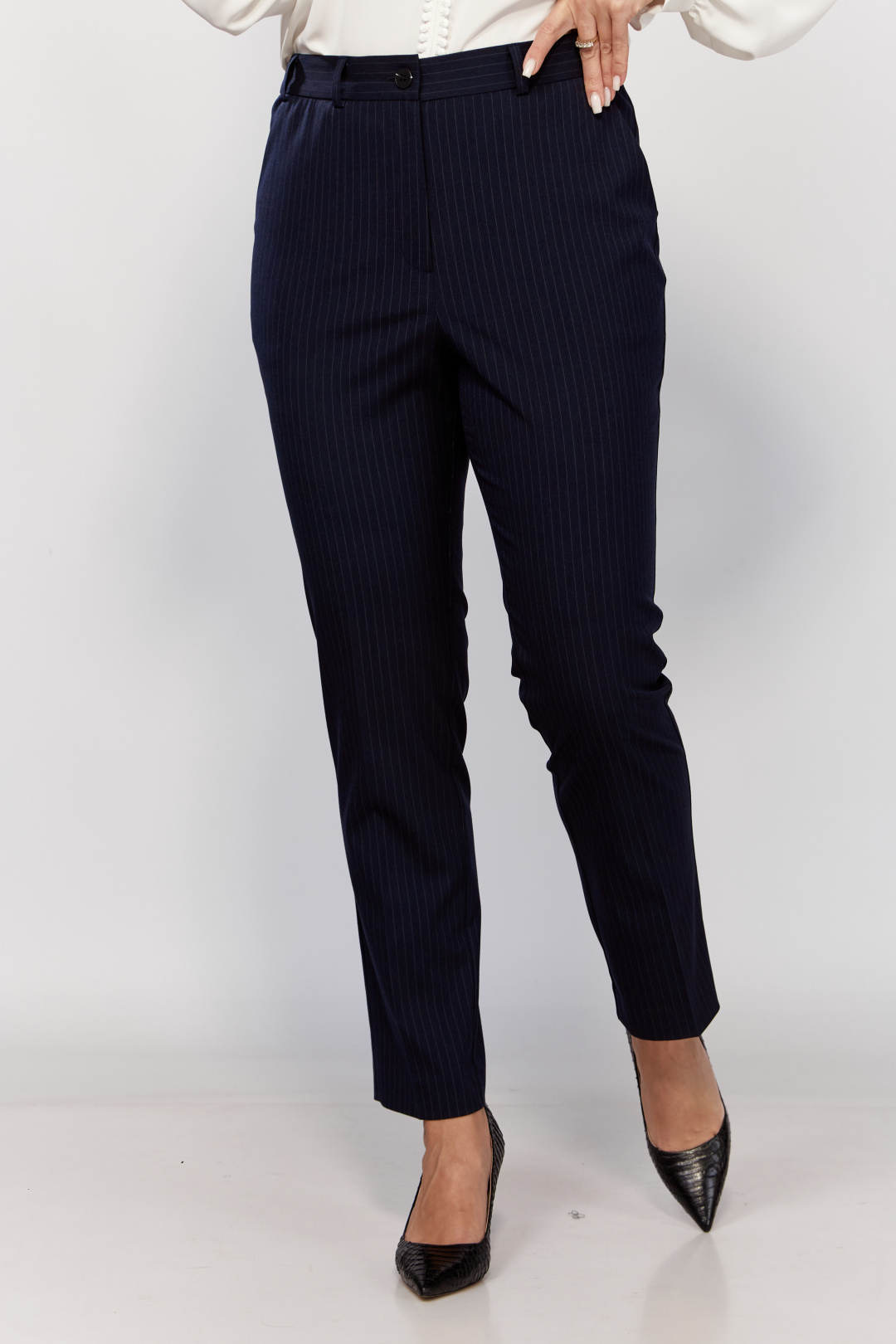 Элегантные зауженные к низу классические брюки в темно-синем цвете с вертикальным тонким белым полосатым принтом, добавляющим утонченности образу. Комфортные карманы с отрезным бочком удобны для повседневного использования. Застежка на молнию обеспечивает идеальную посадку. Идеальный выбор для деловых встреч или официальных мероприятий.