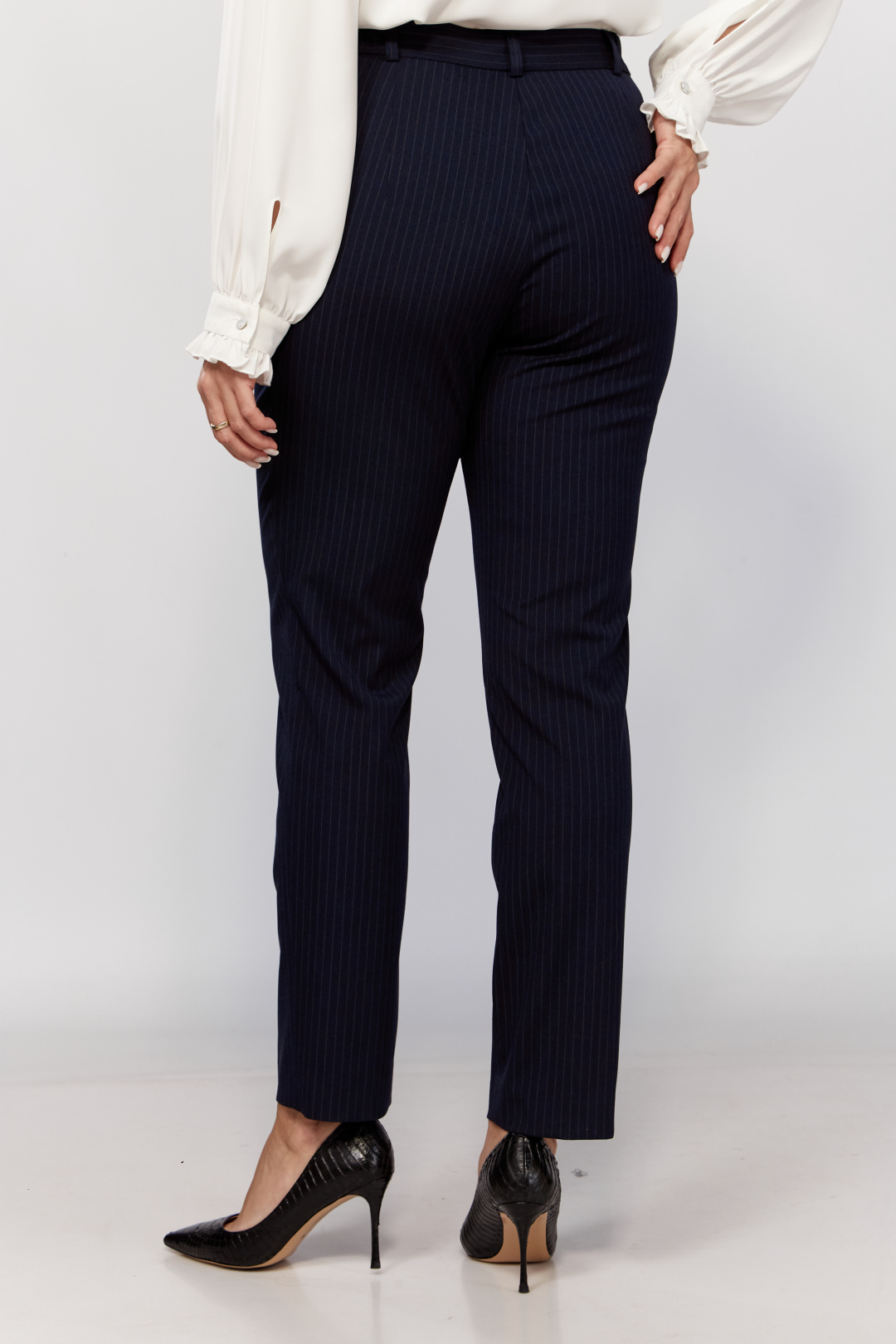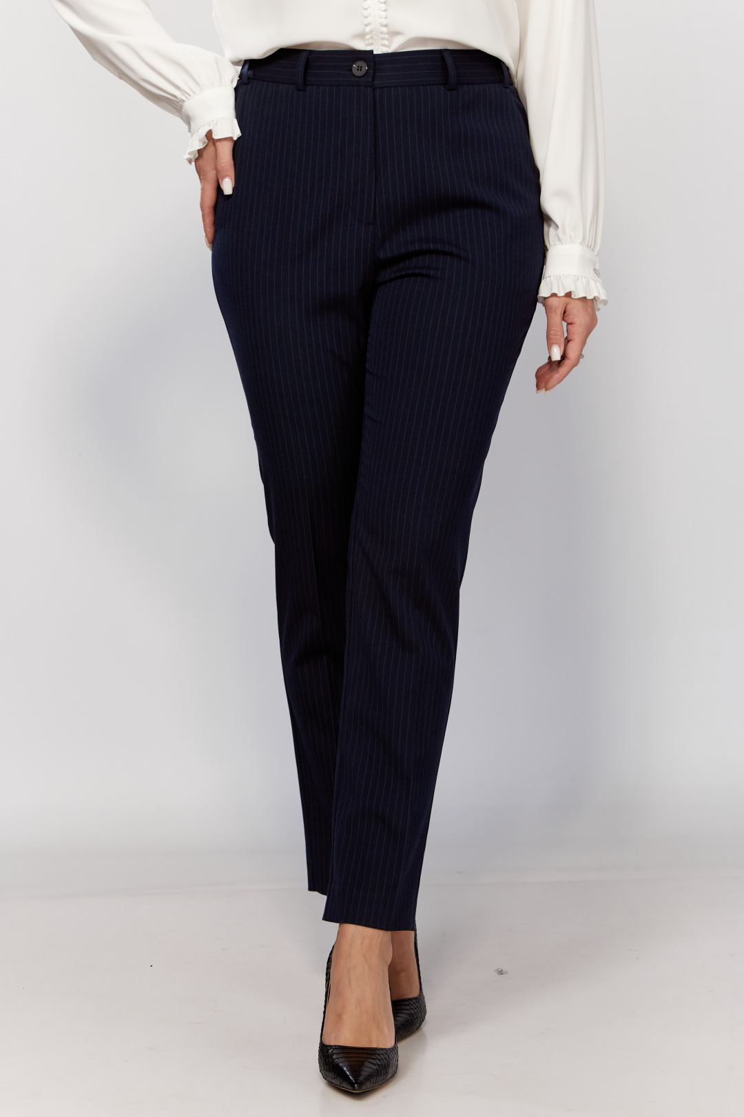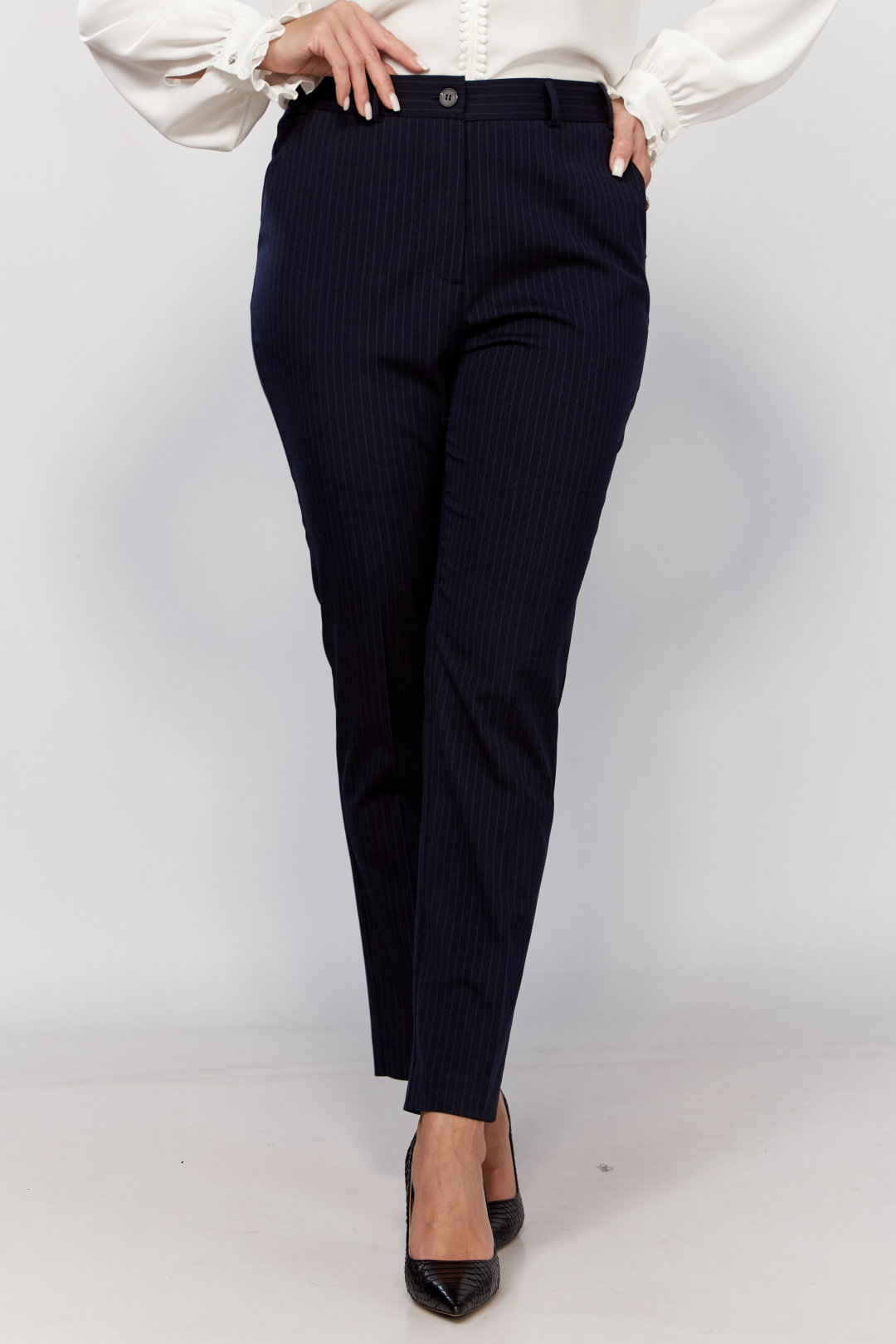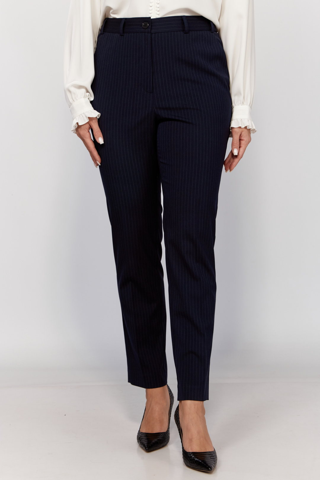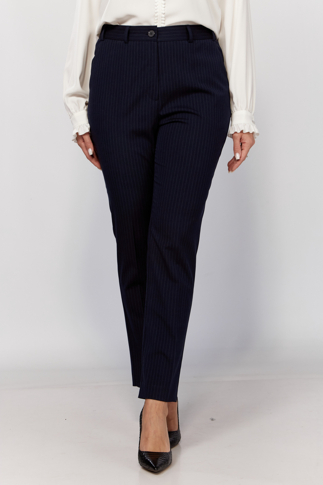 Элегантные зауженные к низу классические брюки в темно-синем цвете с вертикальным тонким белым полосатым принтом, добавляющим утонченности образу. Комфортные карманы с отрезным бочком удобны для повседневного использования. Застежка на молнию обеспечивает идеальную посадку. Идеальный выбор для деловых встреч или официальных мероприятий.