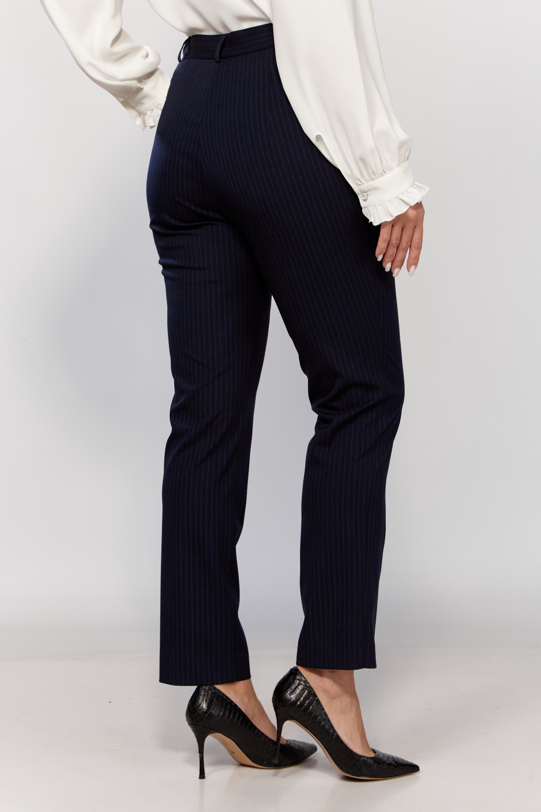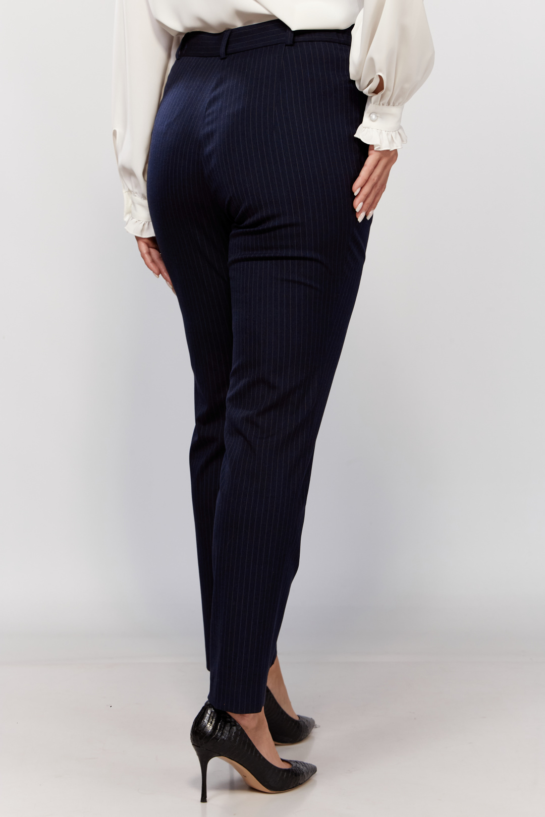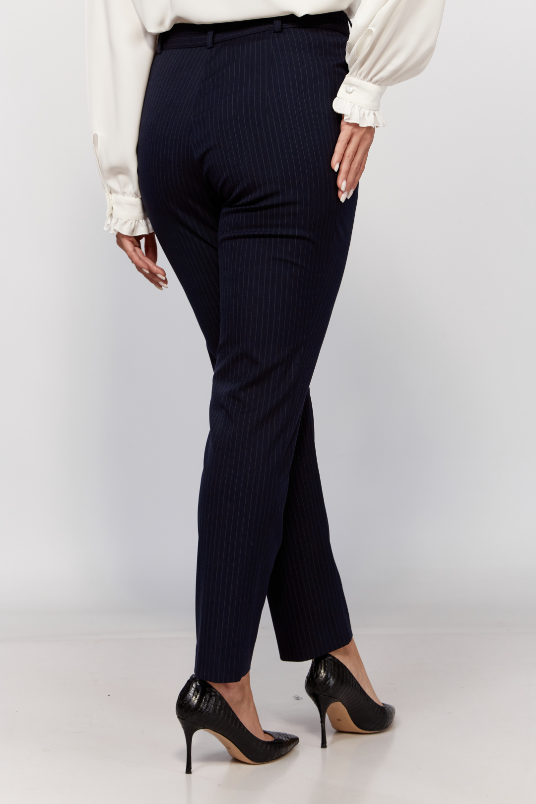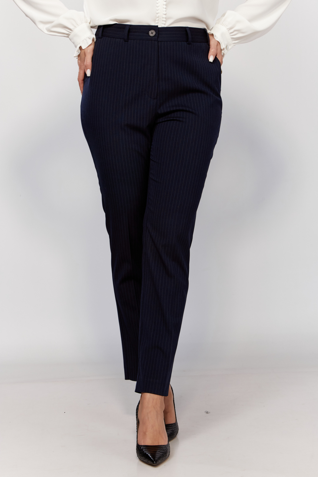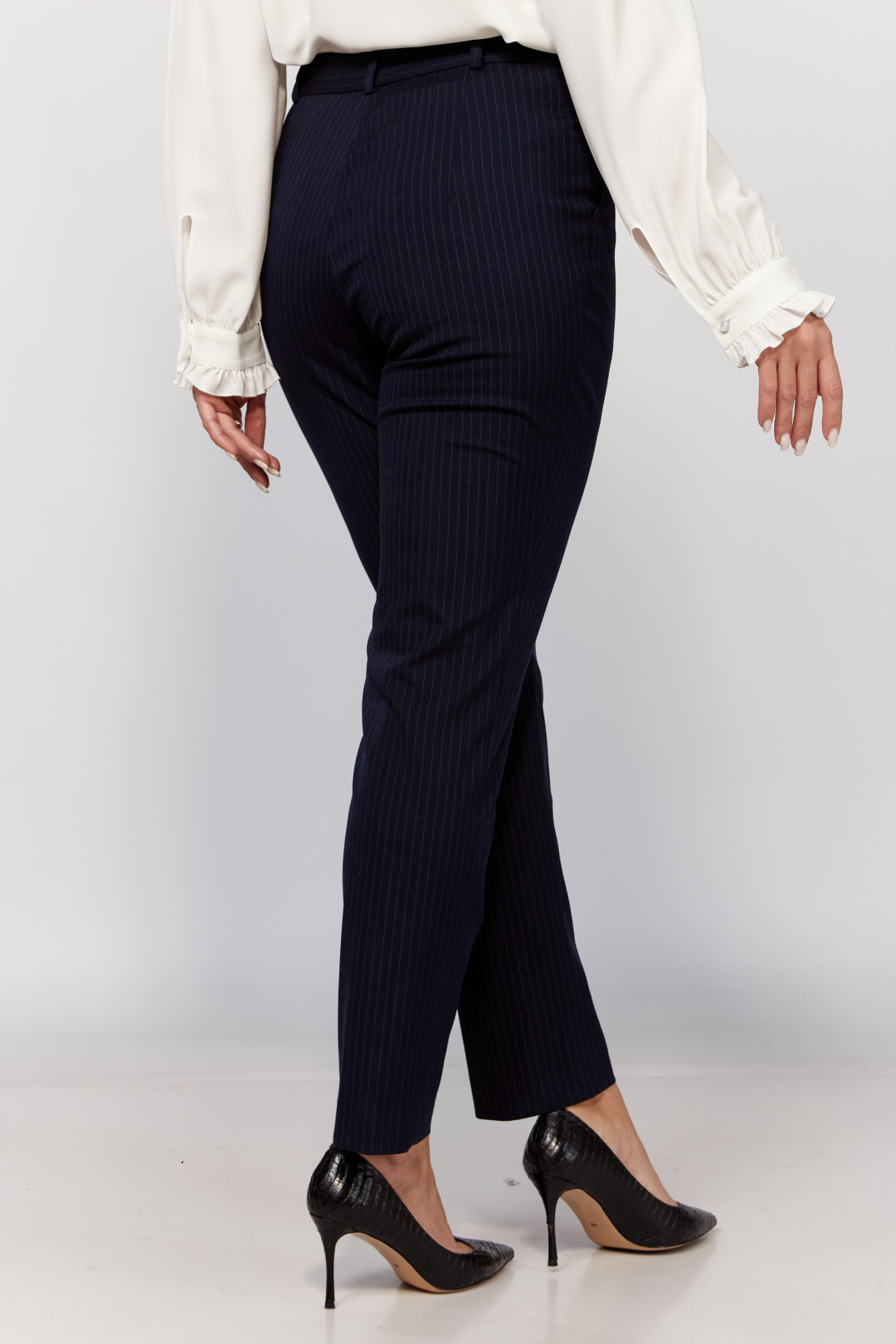 Элегантные зауженные к низу классические брюки в темно-синем цвете с вертикальным тонким белым полосатым принтом, добавляющим утонченности образу. Комфортные карманы с отрезным бочком удобны для повседневного использования. Застежка на молнию обеспечивает идеальную посадку. Идеальный выбор для деловых встреч или официальных мероприятий.