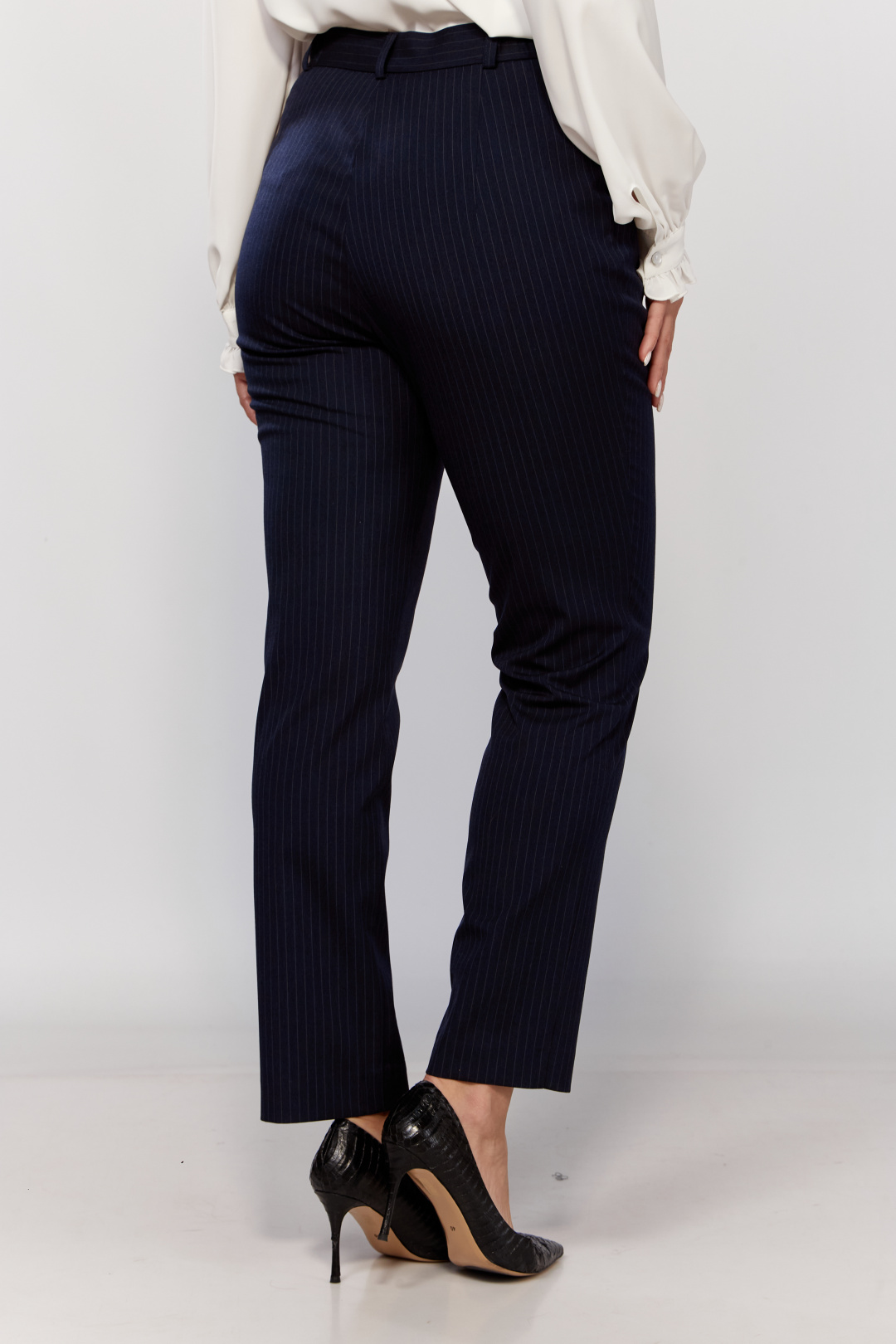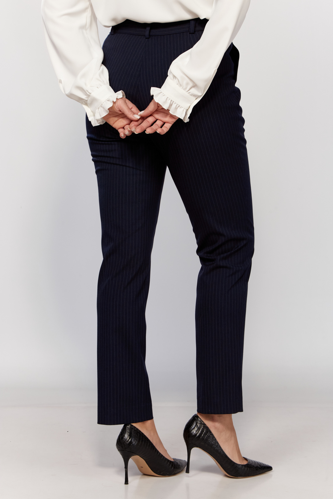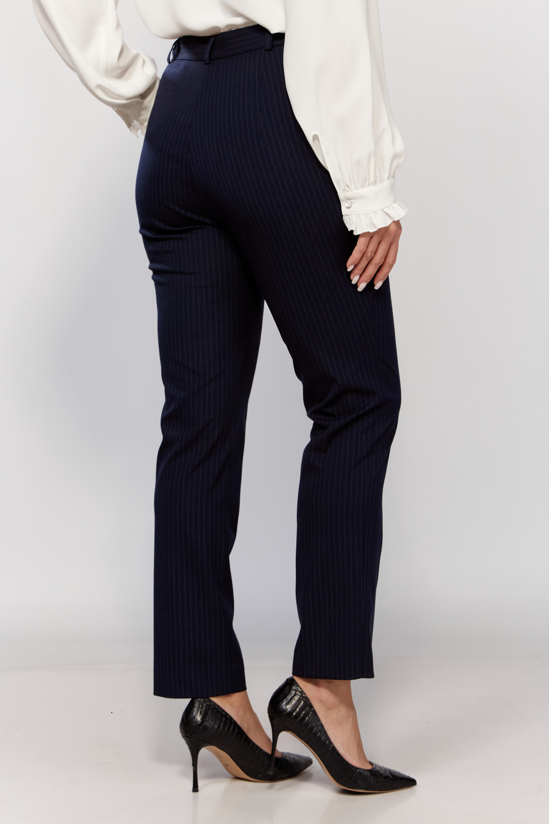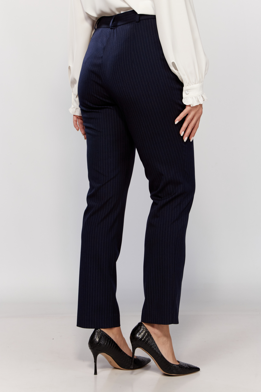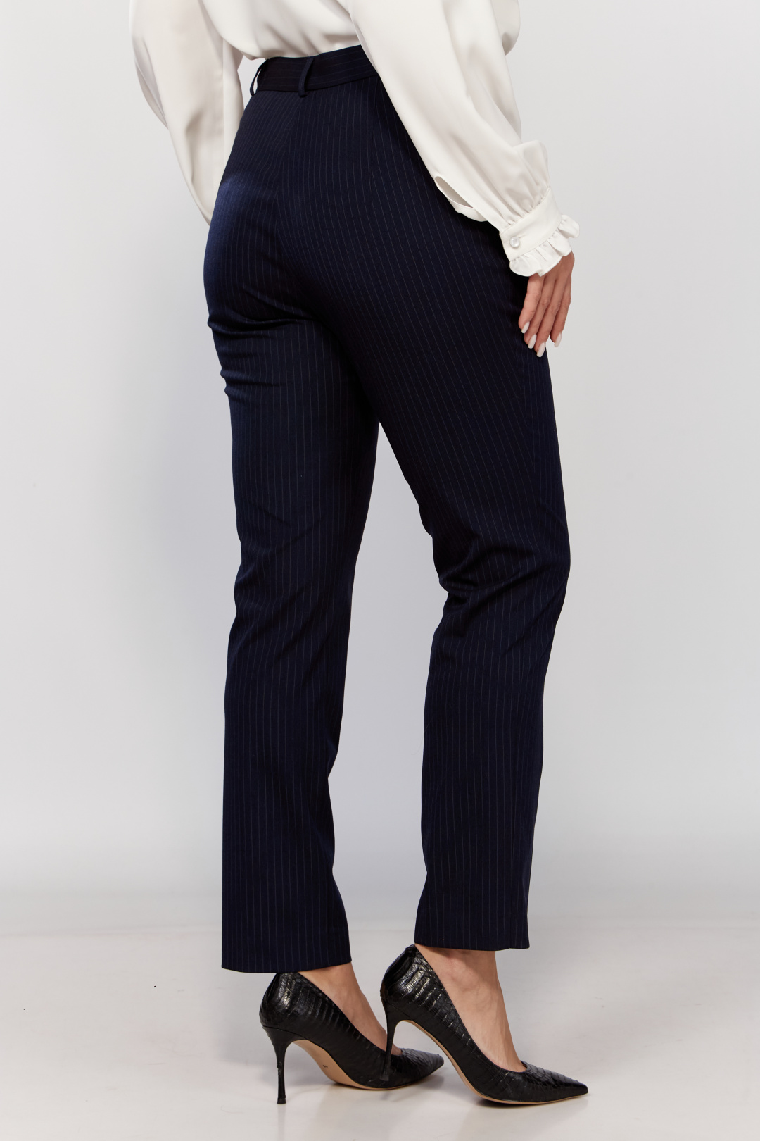 Элегантные зауженные к низу классические брюки в темно-синем цвете с вертикальным тонким белым полосатым принтом, добавляющим утонченности образу. Комфортные карманы с отрезным бочком удобны для повседневного использования. Застежка на молнию обеспечивает идеальную посадку. Идеальный выбор для деловых встреч или официальных мероприятий.