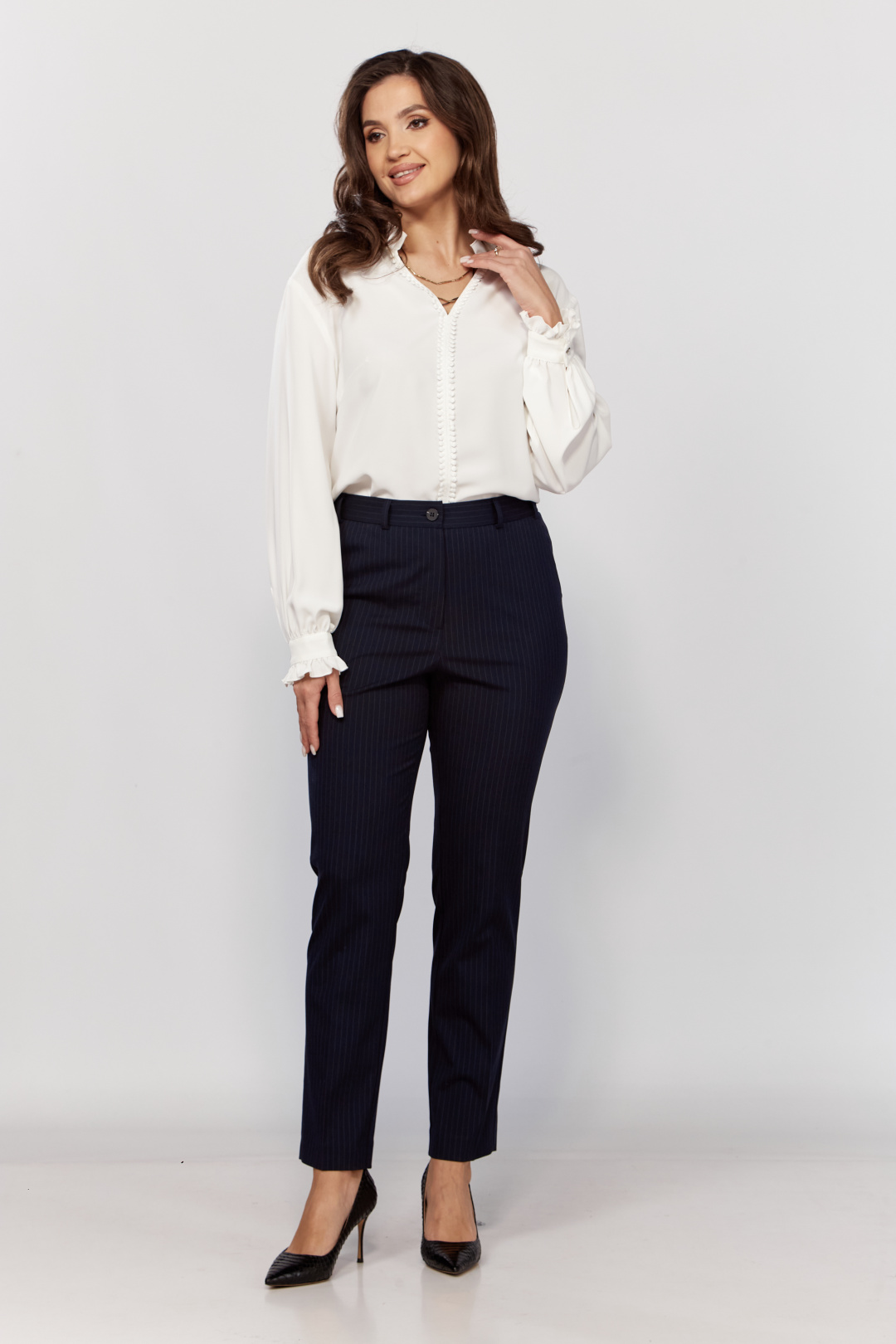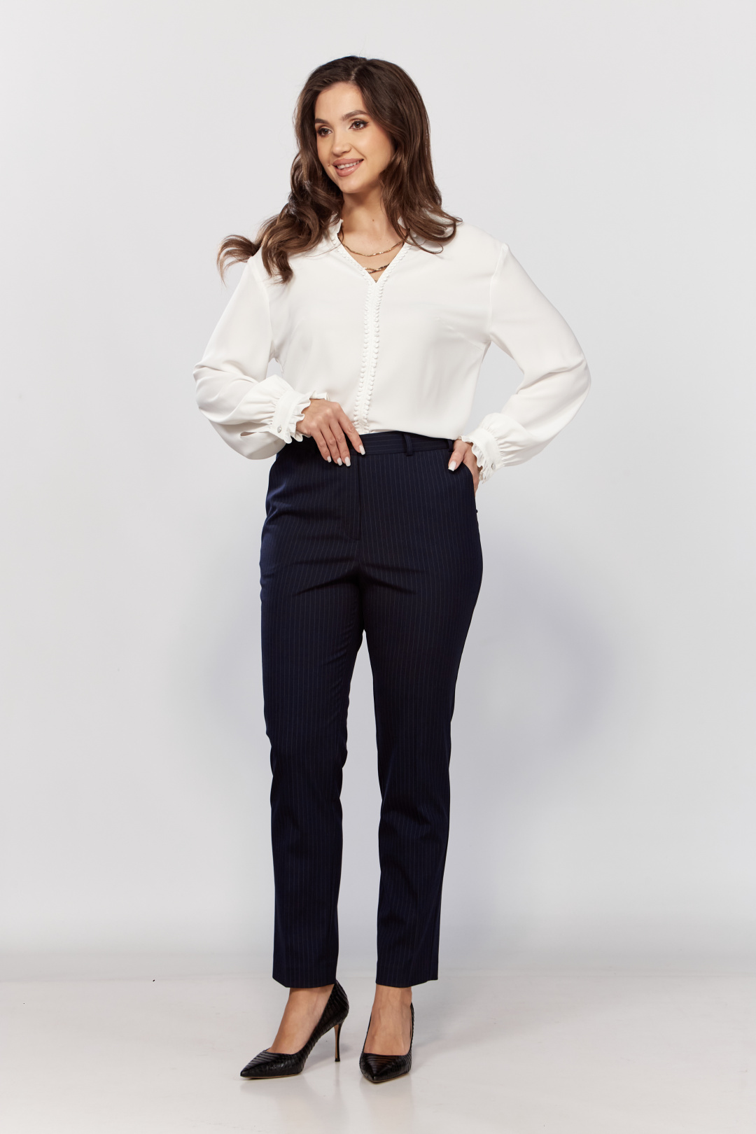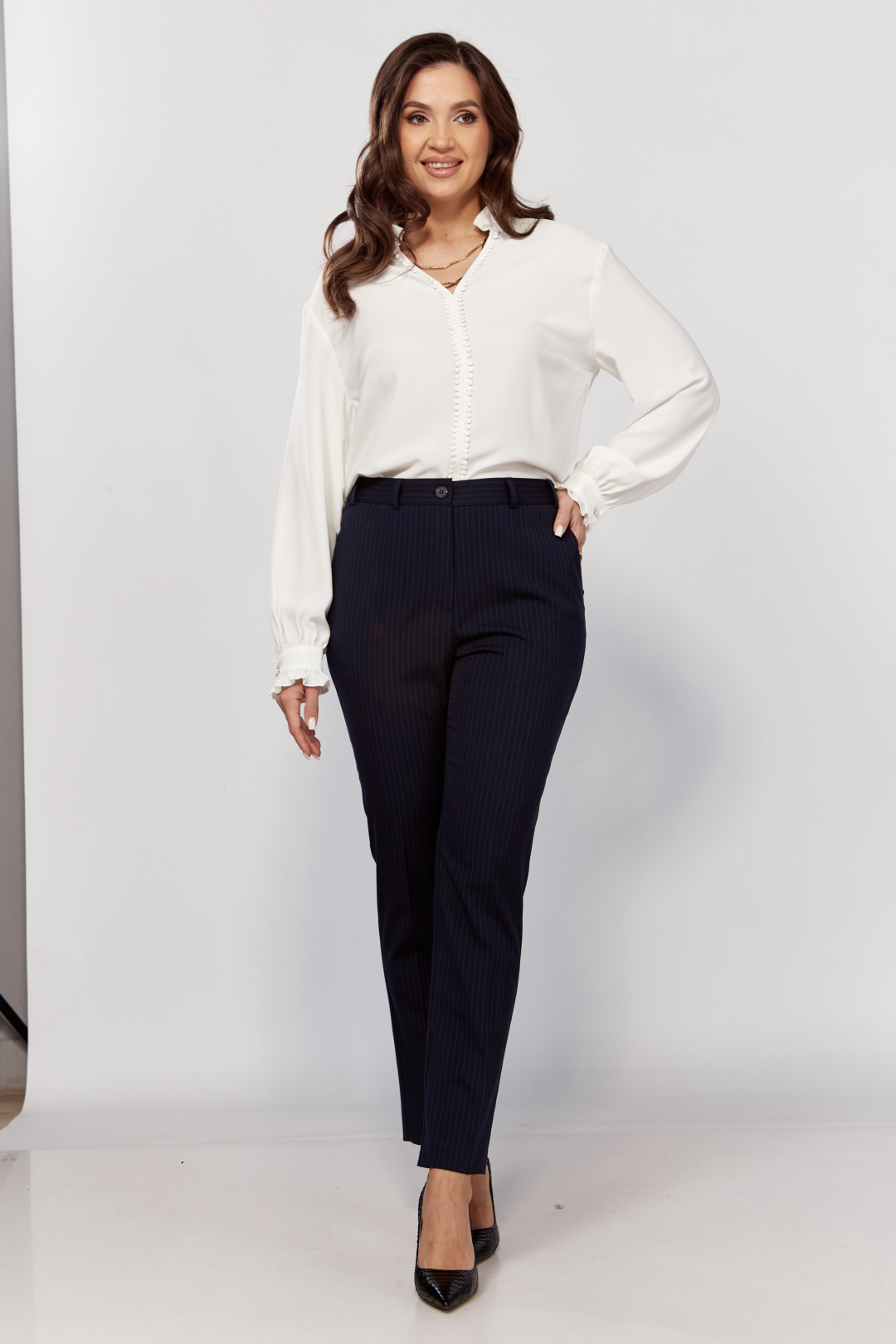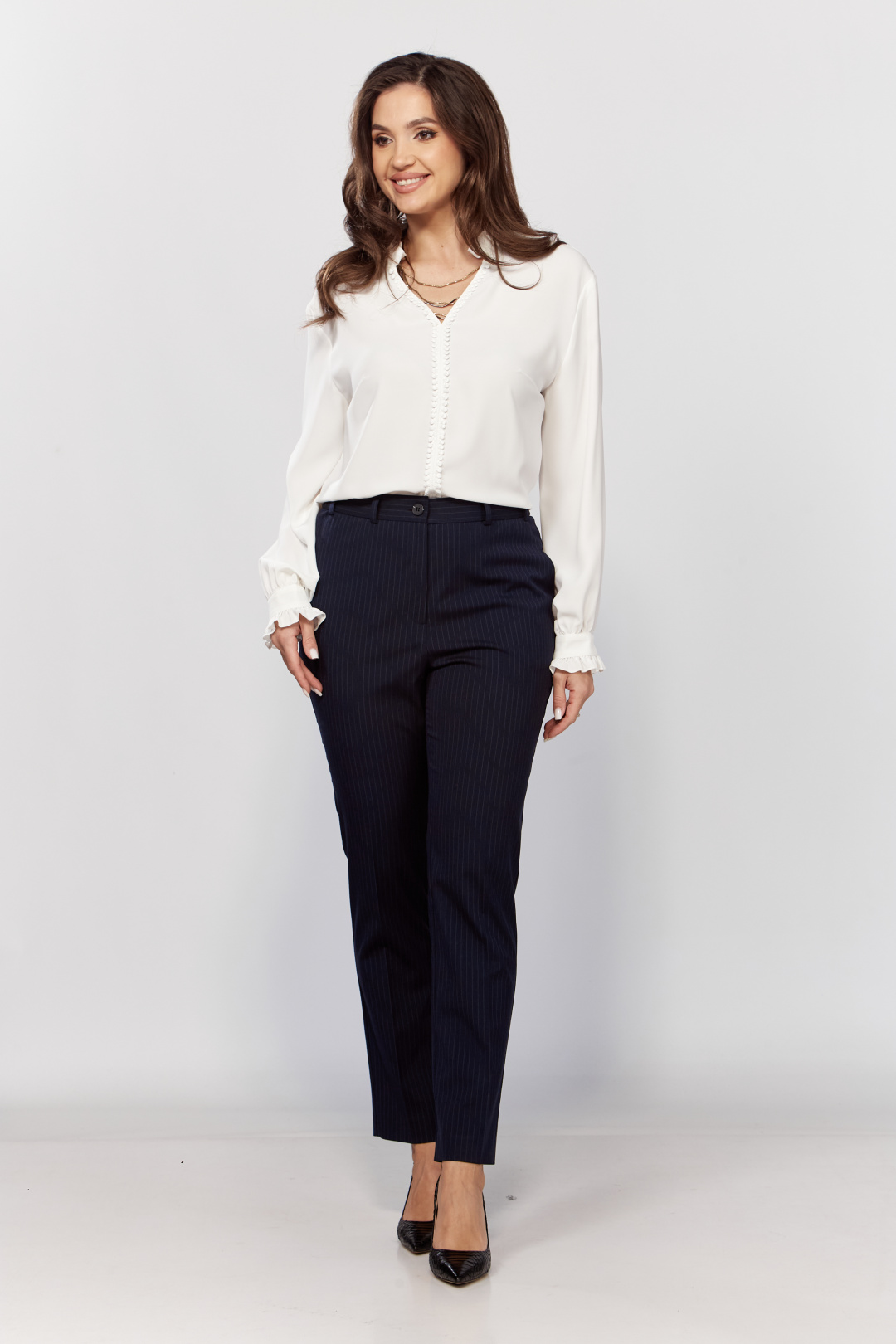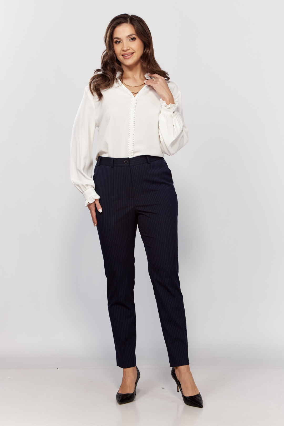 Элегантные зауженные к низу классические брюки в темно-синем цвете с вертикальным тонким белым полосатым принтом, добавляющим утонченности образу. Комфортные карманы с отрезным бочком удобны для повседневного использования. Застежка на молнию обеспечивает идеальную посадку. Идеальный выбор для деловых встреч или официальных мероприятий.