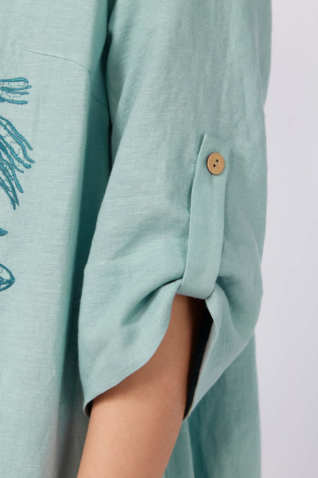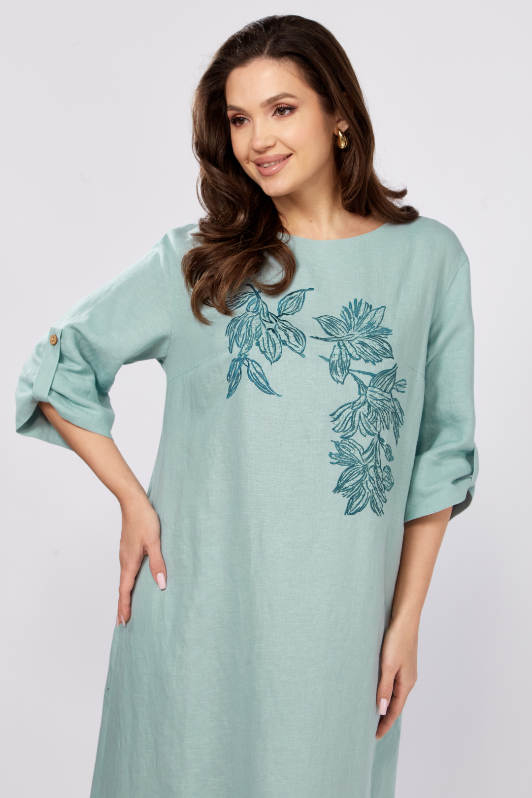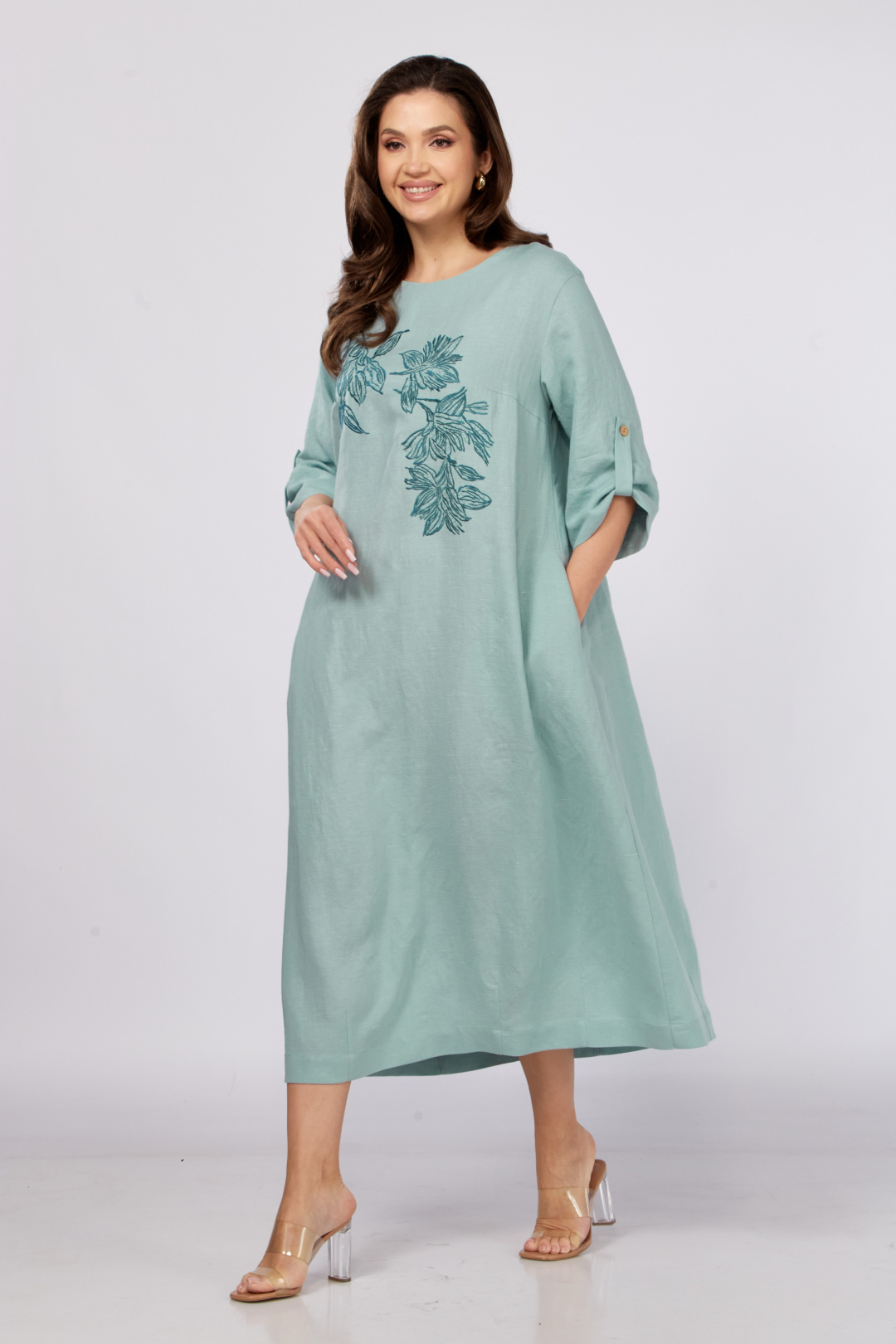 Платье в стиле бохо силуэта трапеция.Спинка со средним швом.По переду нагрудные вытачки и декоративная вышивка.Горловина слегка расширена, округлой формы.Рукав втачной ,3/4.Низ рукава подбирается патой с застёжкой на пуговицу. В боковых швах обработаны карманы.