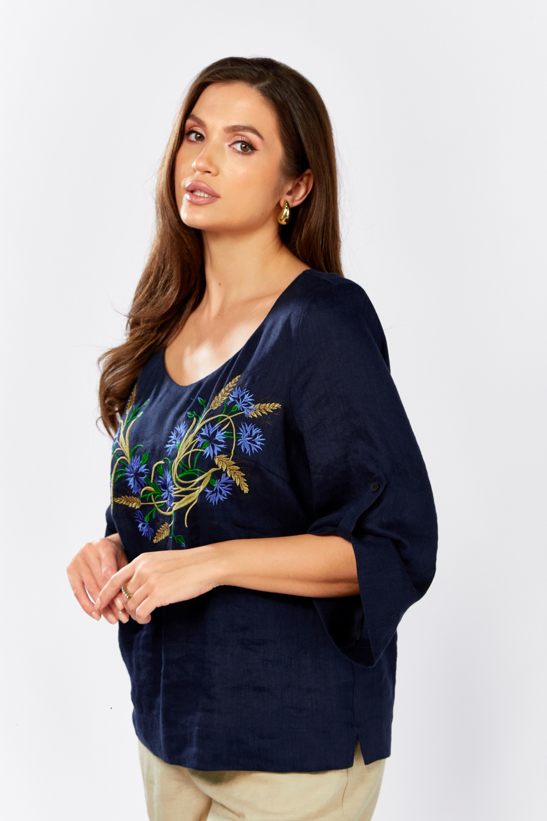 Блузка прямого силуэта. По переду нагрудные вытачки и декоративная вышивка. Горловина округлой формы. В боковых швах разрезы. Рукав втачной, расширен к низу, с застёжкой на пату и пуговицу.
