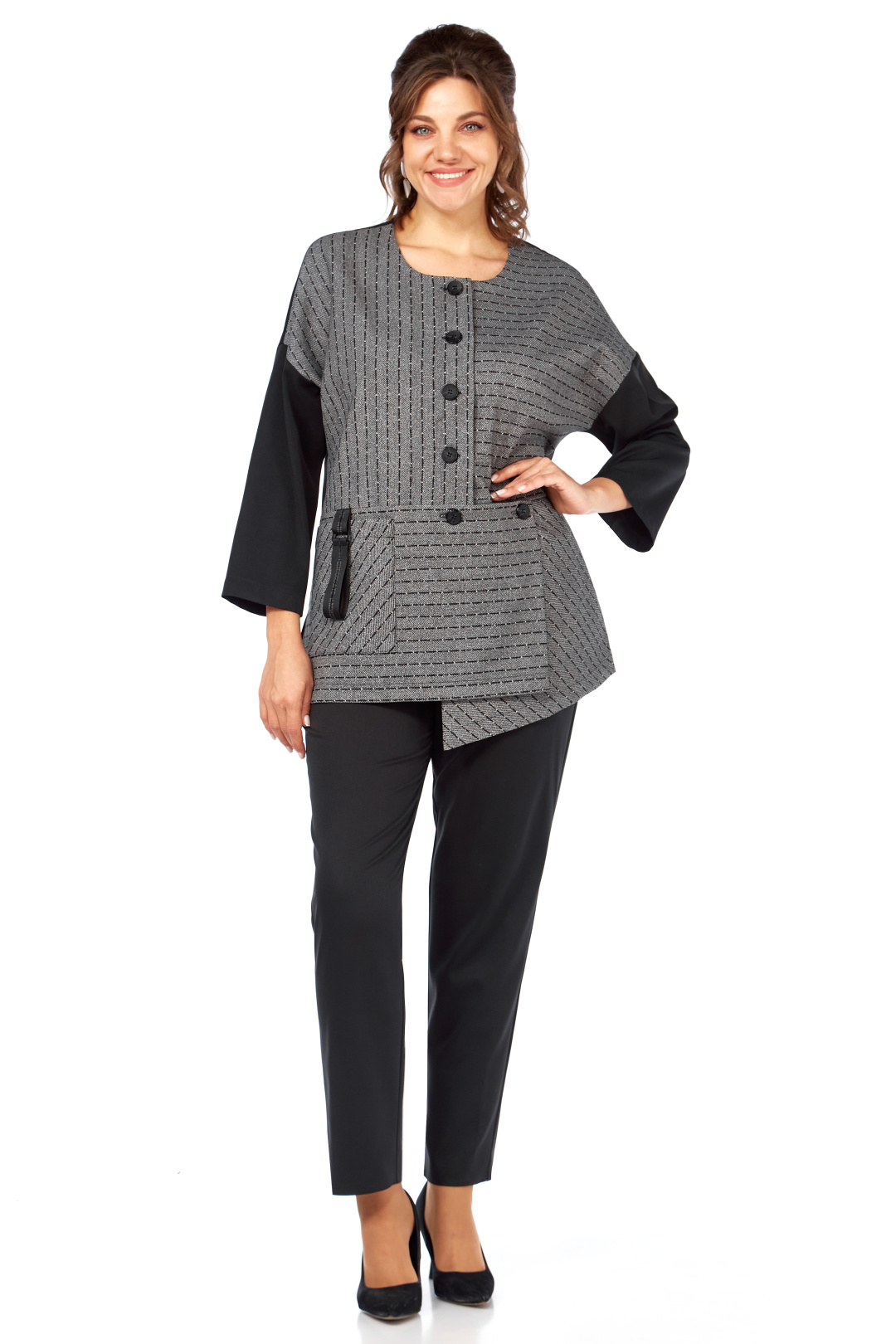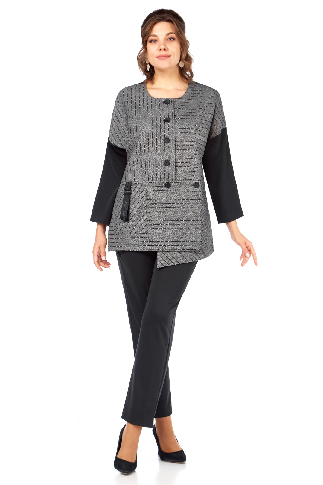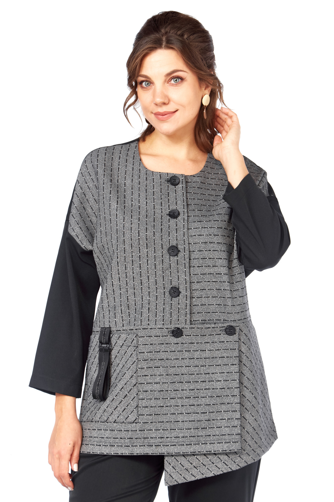 Жакет женский, с цельнокроеным рукавом длиной 3/4, округлым вырезом горловины. Центральная застёжка симметрична до линии талии, низ переда асимметричен. По полочке, справа, имеется накладной карман с декоративной патой. Спинка и отрезная деталь рукава из однотонного трикотажного полотна.