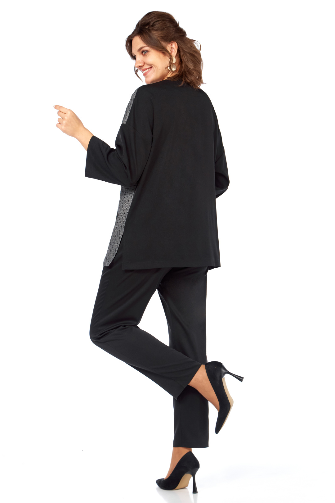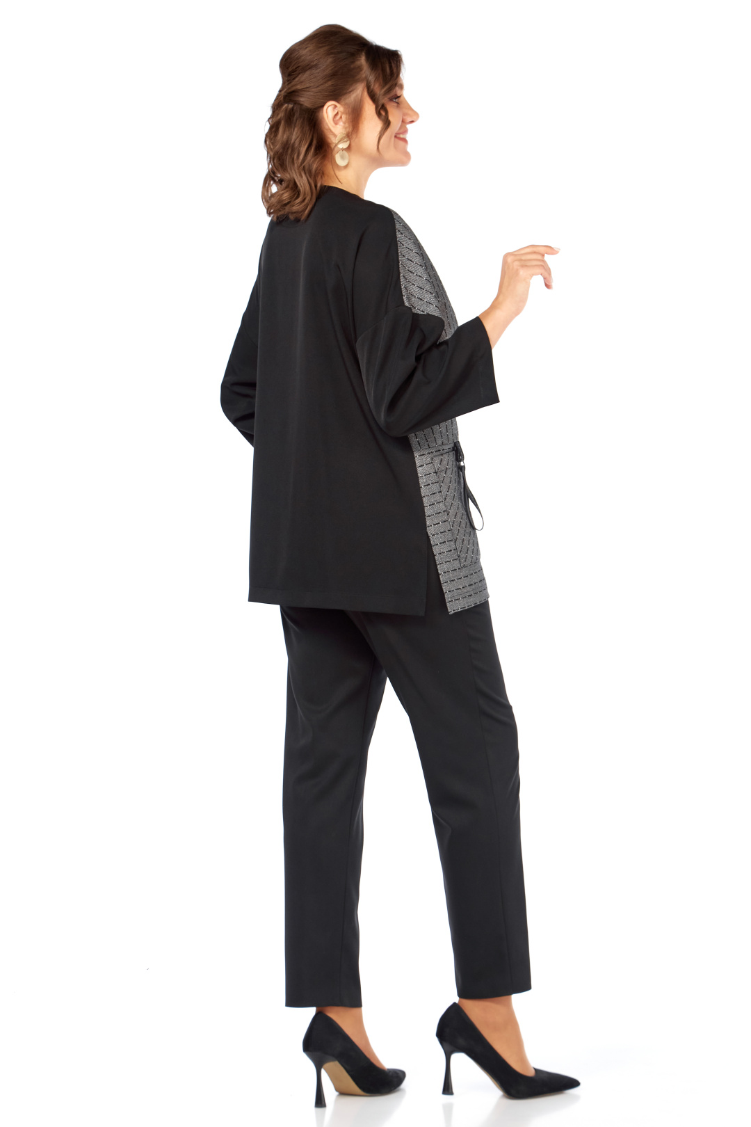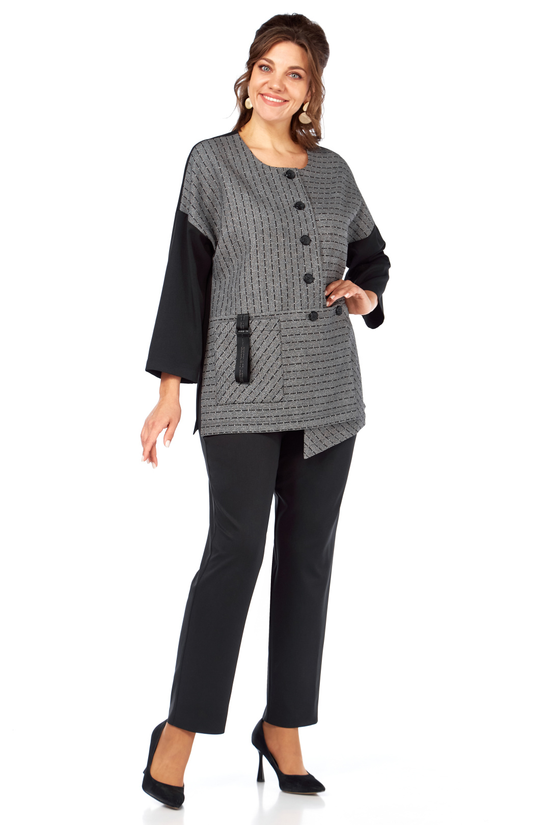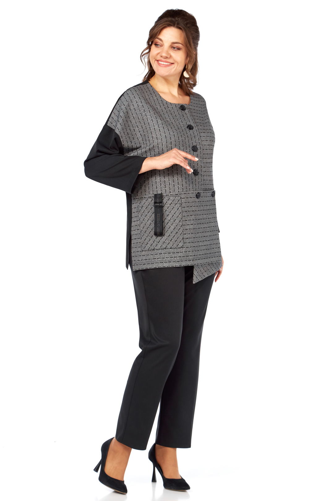 Жакет женский, с цельнокроеным рукавом длиной 3/4, округлым вырезом горловины. Центральная застёжка симметрична до линии талии, низ переда асимметричен. По полочке, справа, имеется накладной карман с декоративной патой. Спинка и отрезная деталь рукава из однотонного трикотажного полотна.