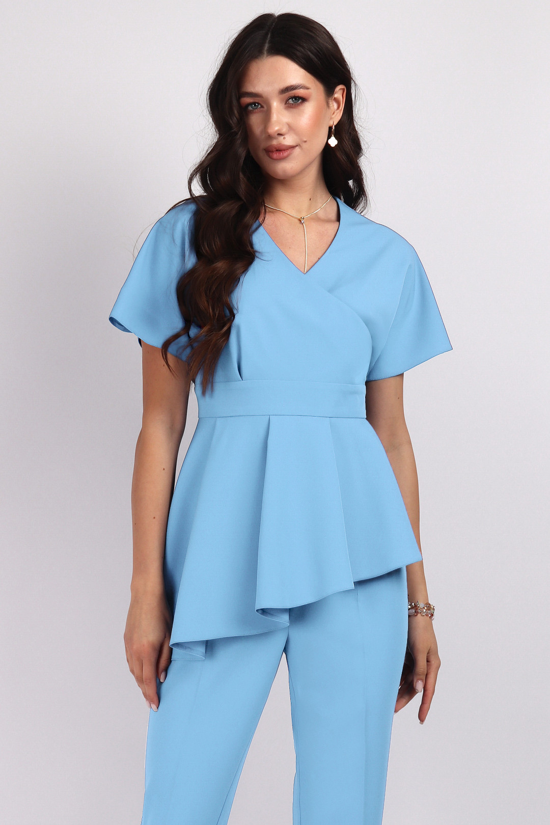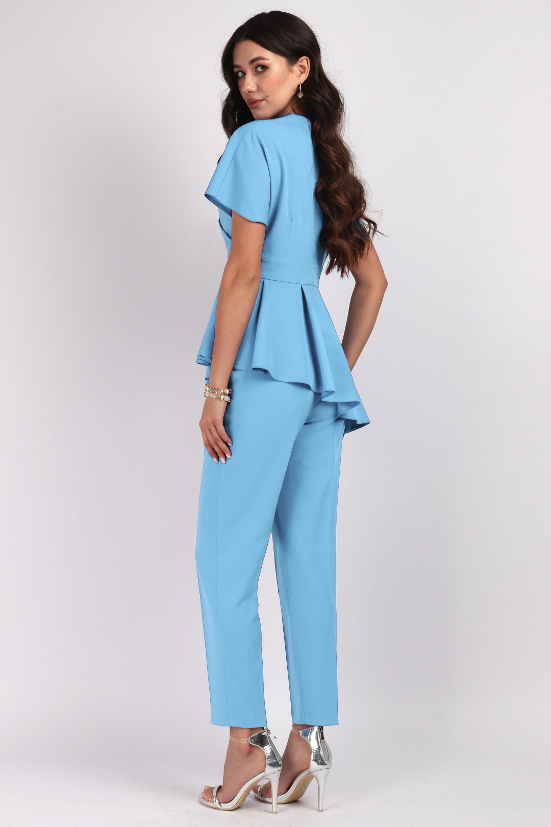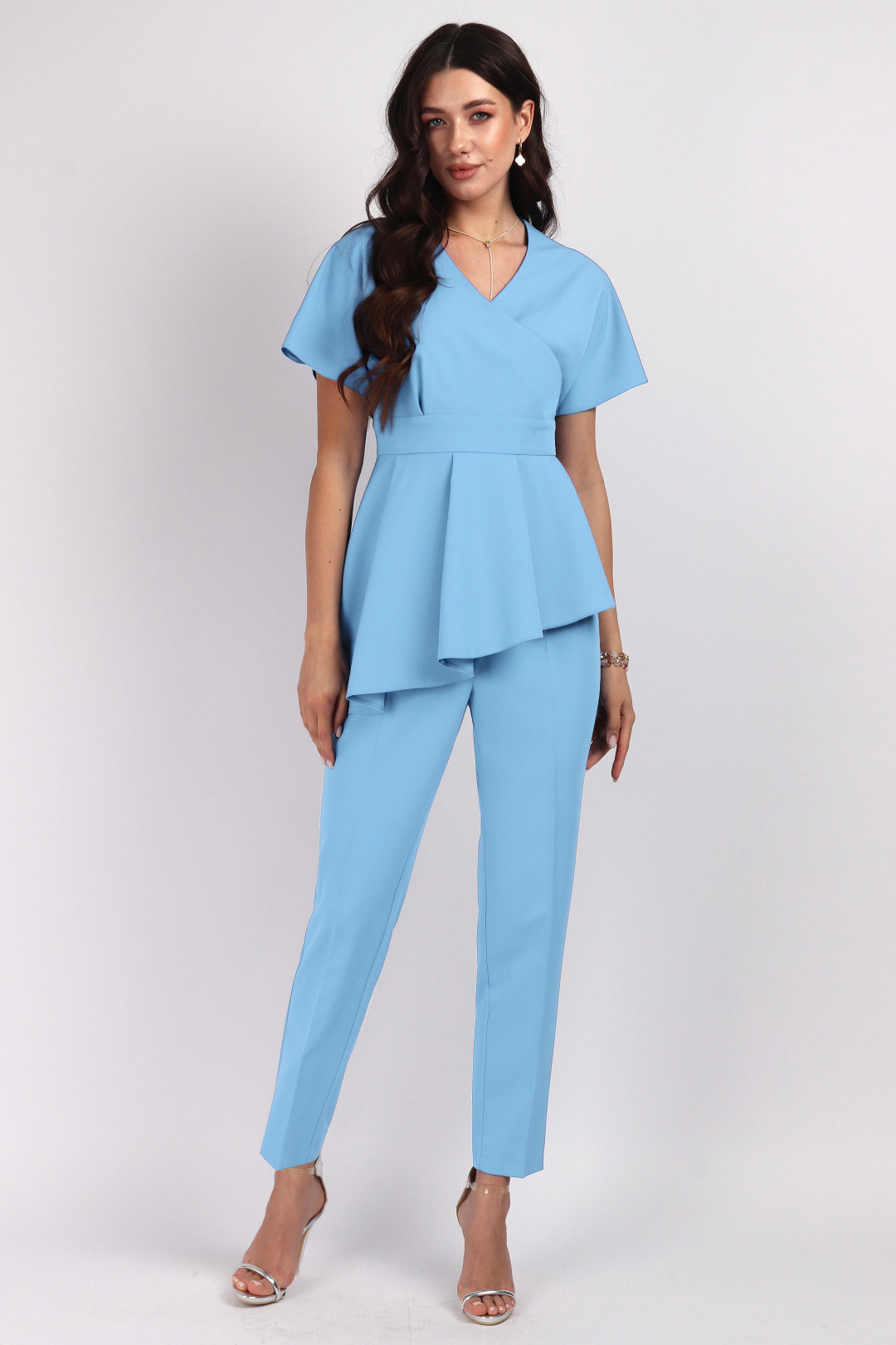 Костюм женский состоит из блузки и брюк.Блузка на отрезной планке по линии талии.По низу асимметричная баска со складками.Верхняя часть блузки на запах со спущенной линией плеча.На спинке застёжка на потайную тесьму молния.Брюки зауженные к низу.Застежка на тесьму молния. Длина блузки 61 см.Длина рукава от начала горловины 31 см. Длина брюк 95 см. Подойдет изделие на рост 164-170 см.