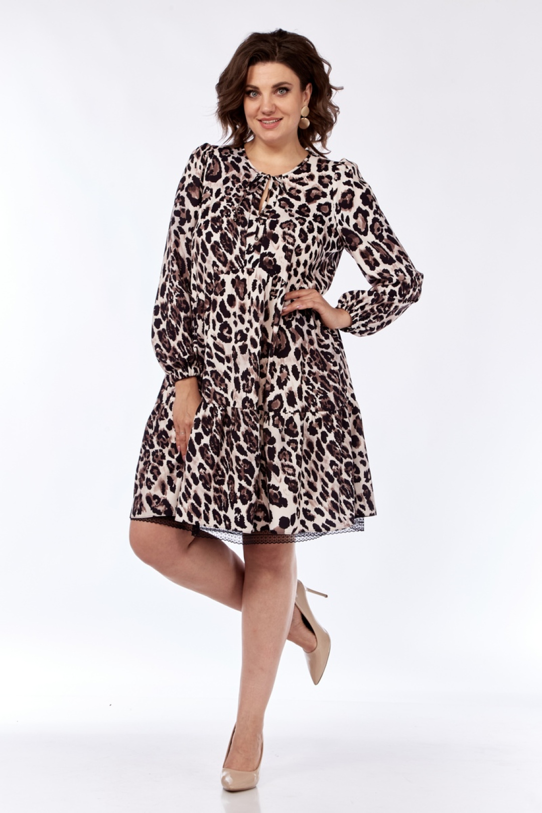 Платье женское свободного силуэта. Округлый вырез горловины, на завязках. Рукав втачной, со сборкой, по низу-на резинке. Изделие с подрезами, со сборкой. По спинке-декоративный вырез с кружевом. Нижний волан платье выполнен из сетки с кружевом.