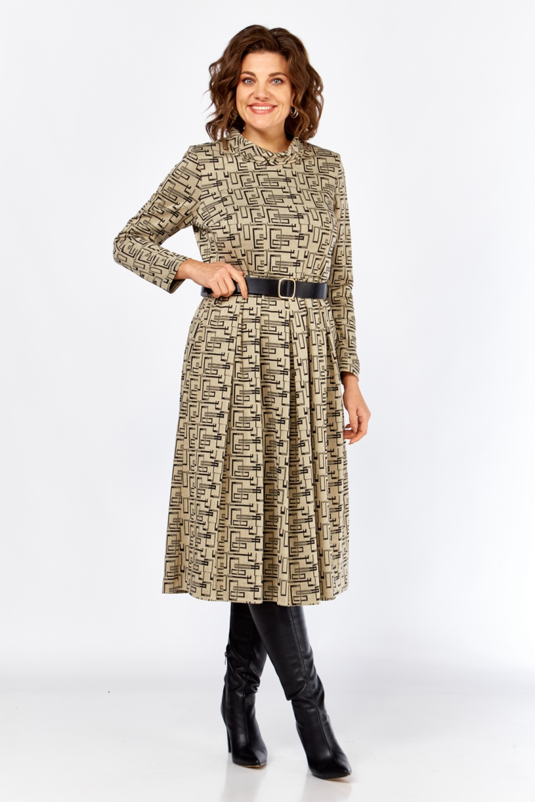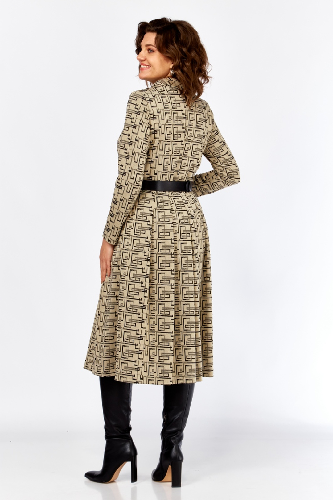 Это элегантное платье выполнено в стиле полуприлегающего силуэта, идеально подчеркивающего фигуру. Модель украшена плавным принтом в форме геометрических фигур, доминирующими цветами являются светло-бежевый и темно-коричневый. Эффектный воротник "хомут" и длинные втачные рукава добавляют платью изысканный вид. Особенностью дизайна является подрез по талии со складками, а также в комплекте предусмотрен пояс, подчеркивающий силуэт. Длина платья составляет 121 см, а длина рукава — 62 см, что делает его отличным выбором как для офиса, так и для вечерних мероприятий.