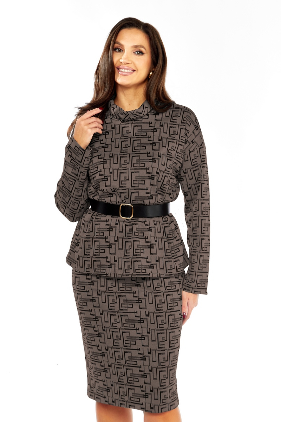 Элегантный женский костюм в черно-коричневой гамме, идеально подходящий для деловых встреч и офисной работы. Костюм включает в себя удобный джемпер свободного силуэта с длинными спущенными рукавами и стильный воротник-"хомут". Принт в виде геометрического узора придает образу особый шик. Юбка прямого кроя с эластичной талией обеспечивает комфортное ношение на протяжении всего дня. В комплект входит элегантный ремень, который подчеркивает фигуру. Длина юбки составляет 65 см, что делает её универсальным выбором для различных мероприятий. С этим костюмом вы будете выглядеть аккуратно и модно.