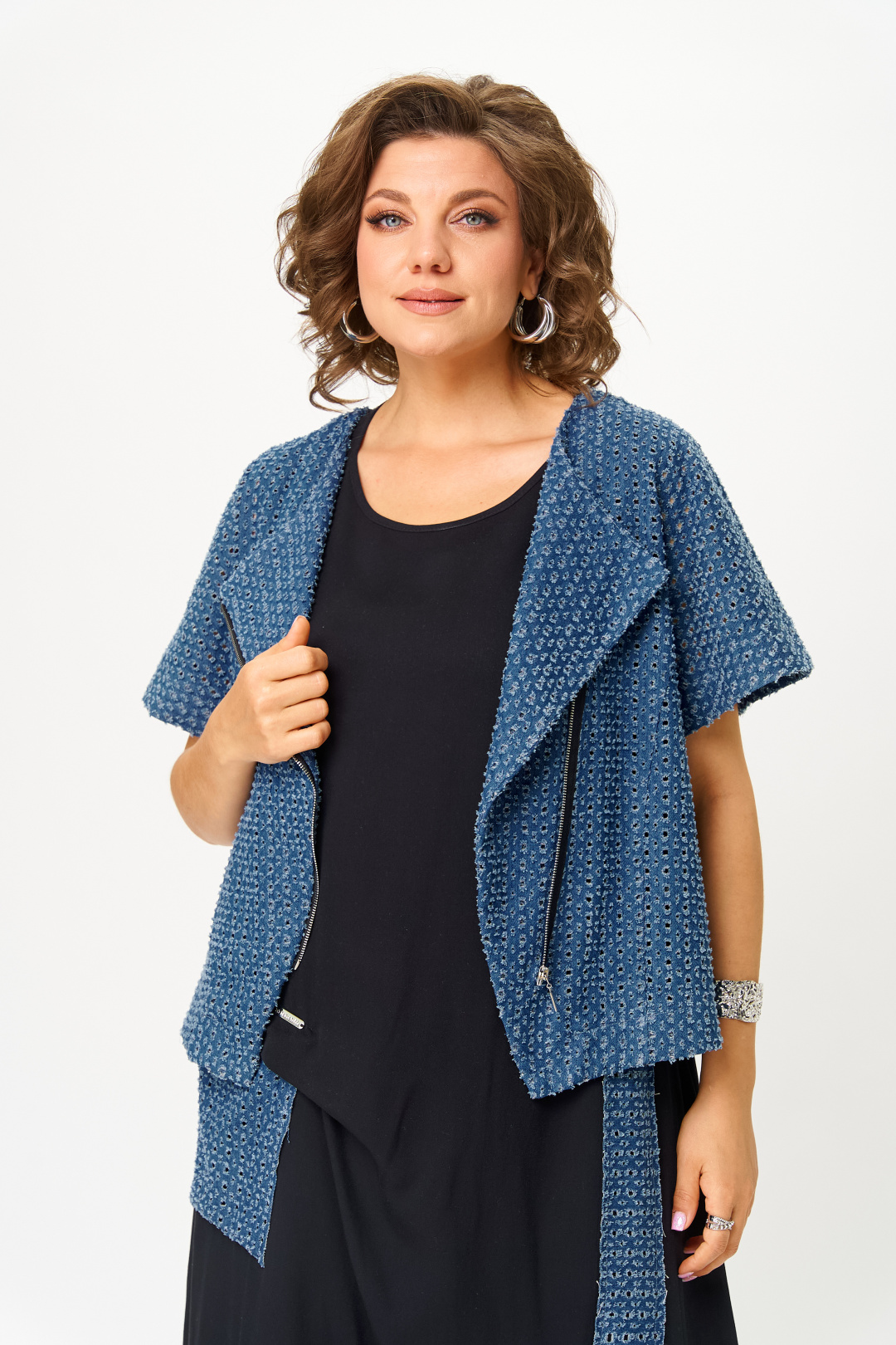 Такой наряд отлично подойдет для повседневной носки , а также для вечерней прогулки. Женский комплект — летнее платье в стиле бохо без рукава+ жакет из перфорированного джинса, укороченный с коротким цельнокроеным рукавом и асимметричной застежкой на молнии с запахом. Платье с круглой горловиной декорировано накладным джинсовым карманом и складкой ,по низу платья два боковых разреза, карман в боковом шве.