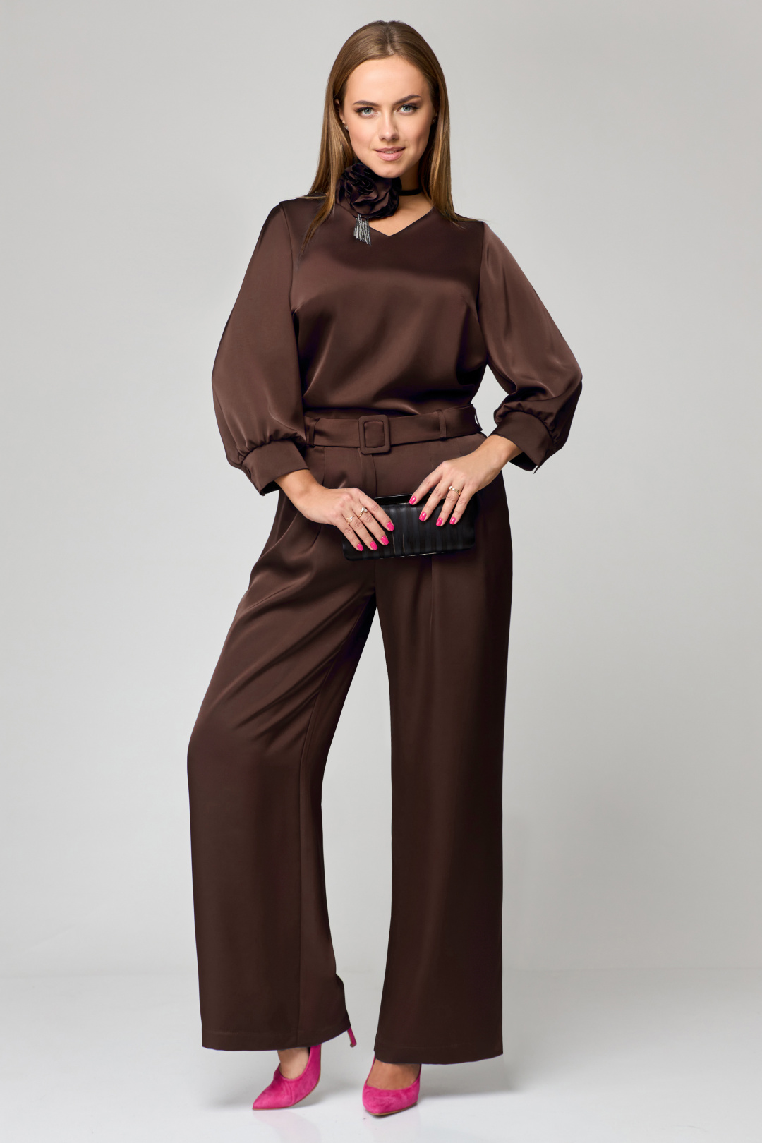 Комплект женский двухпредметный. Блузка - прямого силуэта с V-образным вырезом горловины. По спинке застежка на 3-петли и пуговицы. В боковых швах разрезы. Рукав втачной со складкой по низу с манжетой. Брюки классического покроя, прямые от бедра. В боковых швах карманы с отрезными бочками. Пояс отрезной со шлевками. Застежка на молнию и петлю с пуговицей. Изделие дополнено съемным поясом из основной ткани на пряжке.