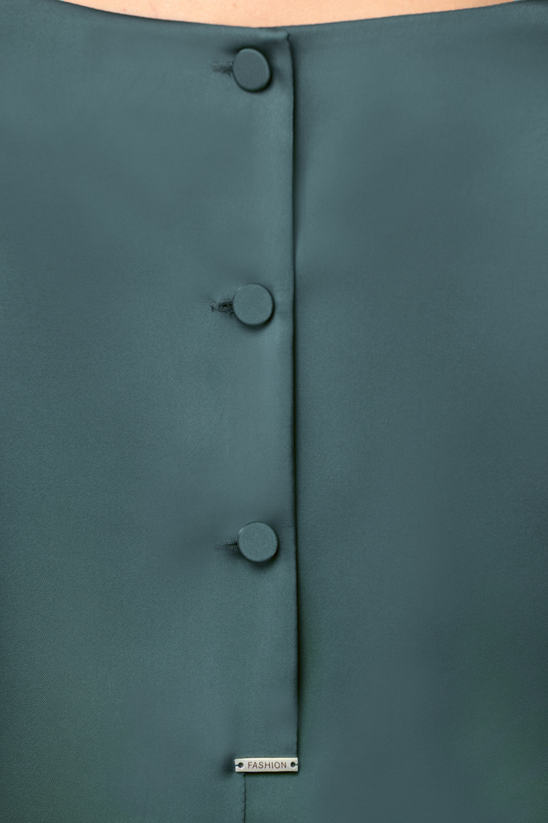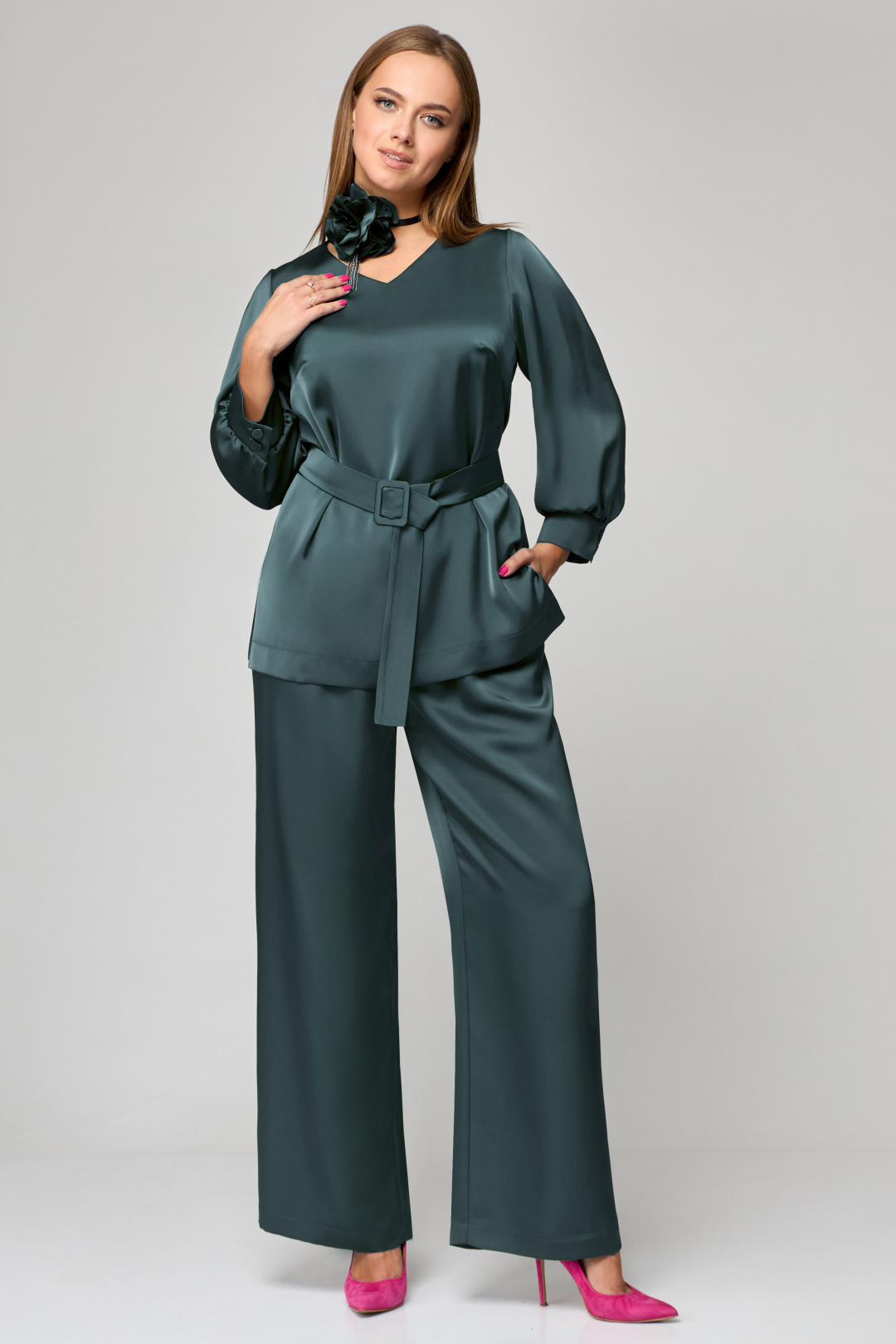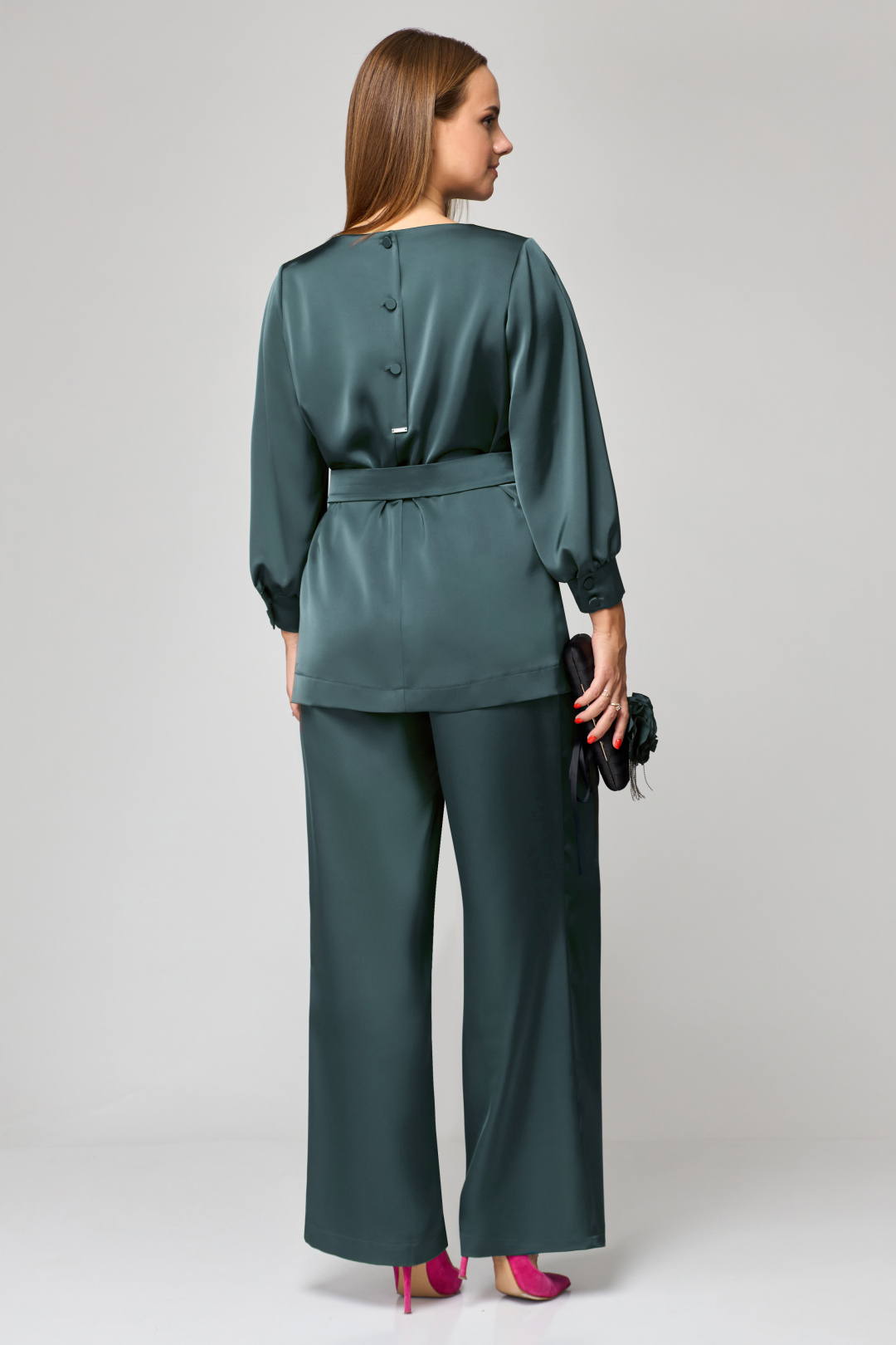 Комплект женский двухпредметный. Блузка - прямого силуэта с V-образным вырезом горловины. По спинке застежка на 3-петли и пуговицы. В боковых швах разрезы. Рукав втачной со складкой по низу с манжетой. Брюки классического покроя, прямые от бедра. В боковых швах карманы с отрезными бочками. Пояс отрезной со шлевками. Застежка на молнию и петлю с пуговицей. Изделие дополнено съемным поясом из основной ткани на пряжке.