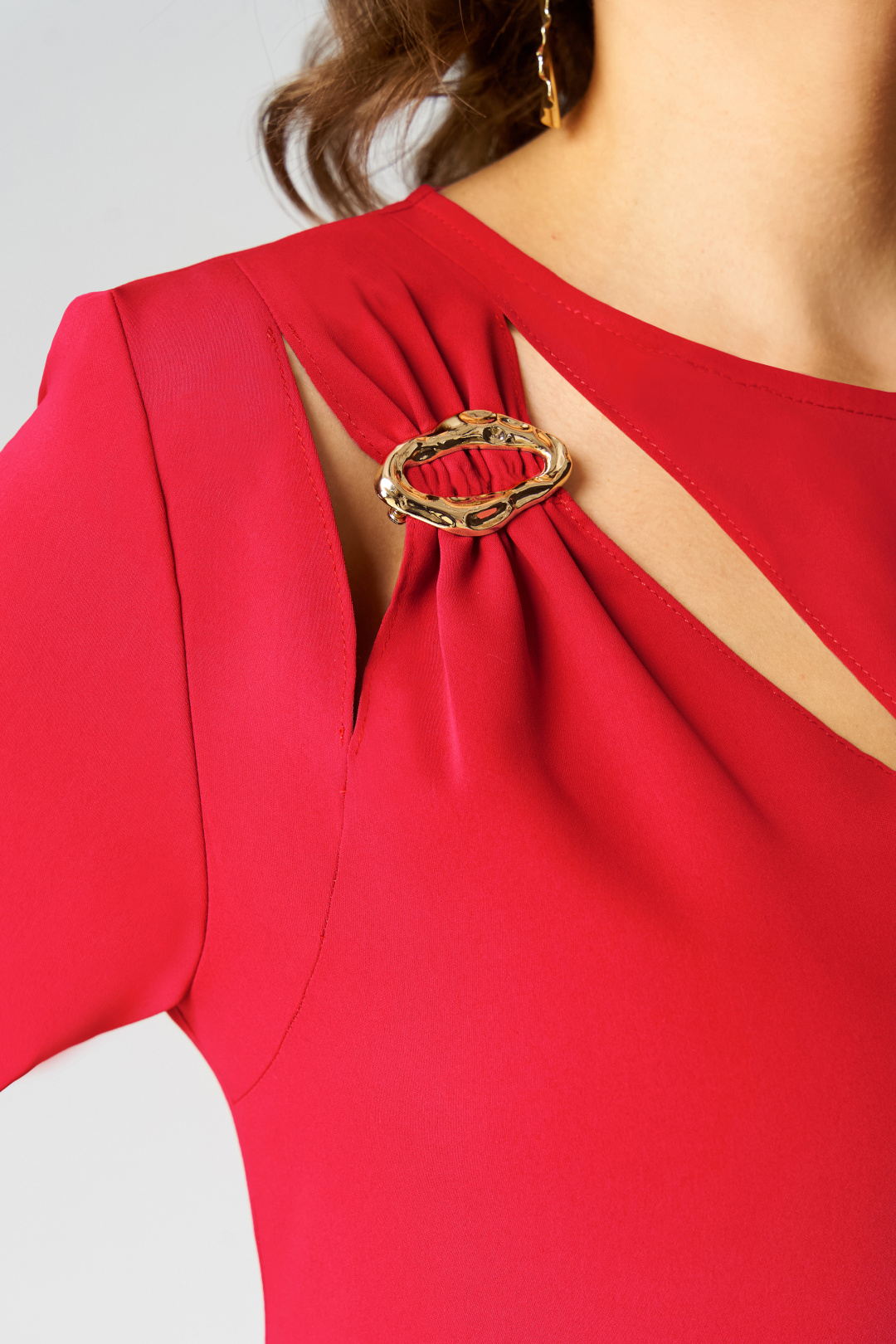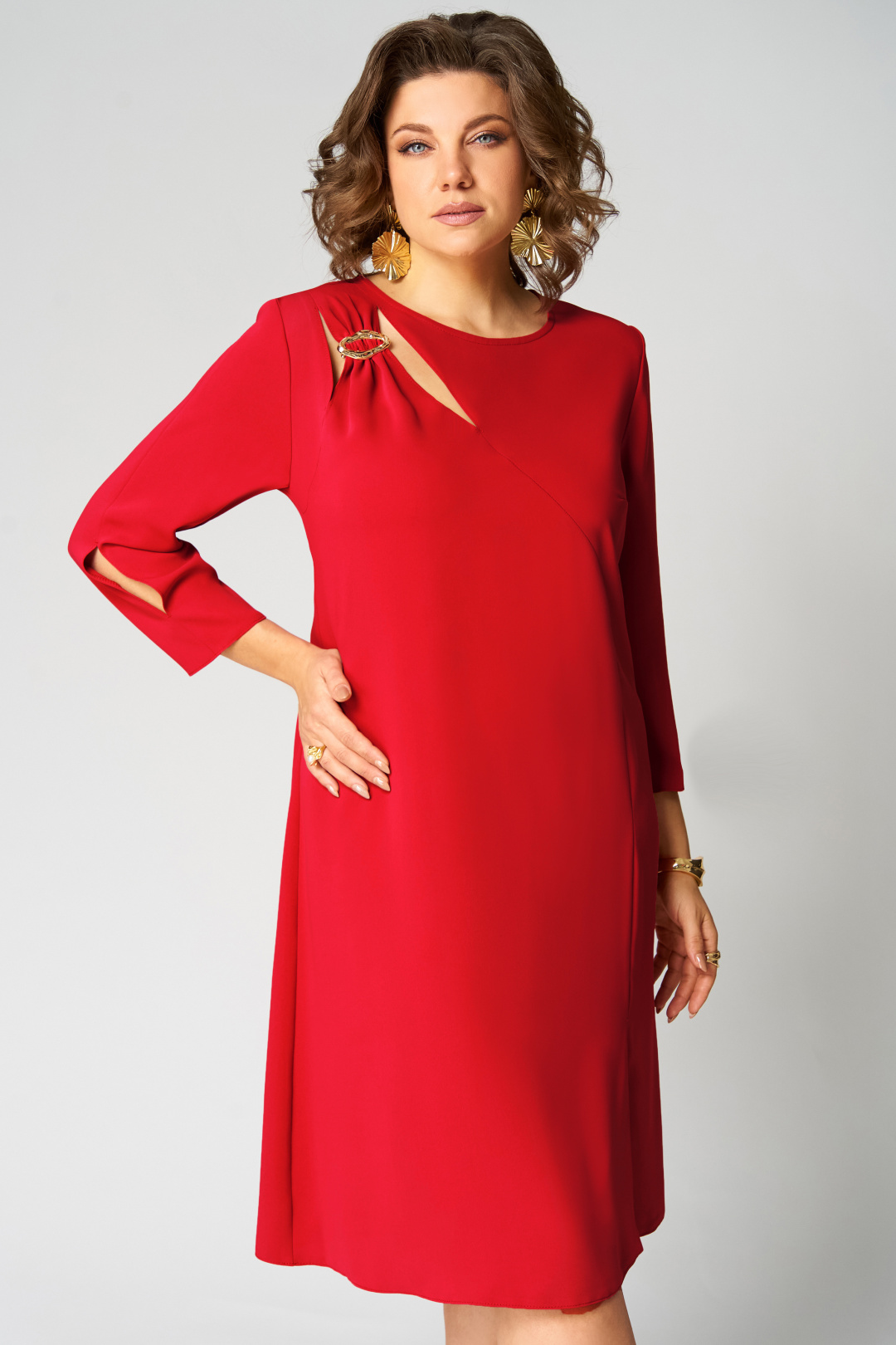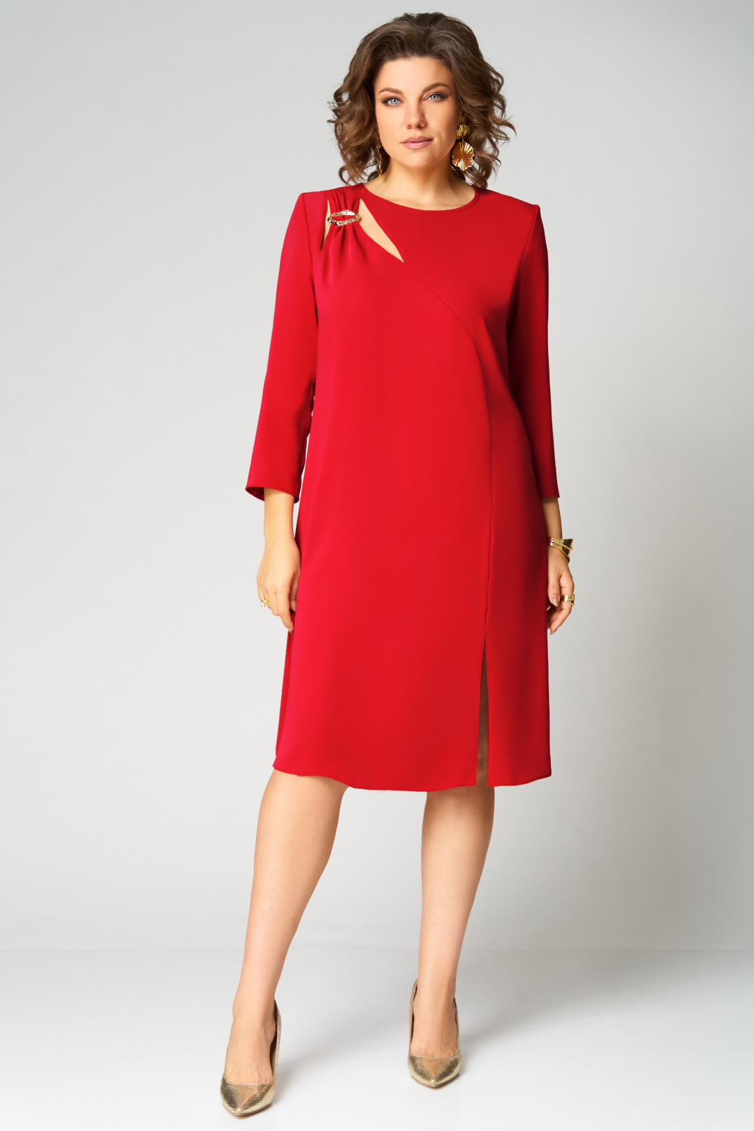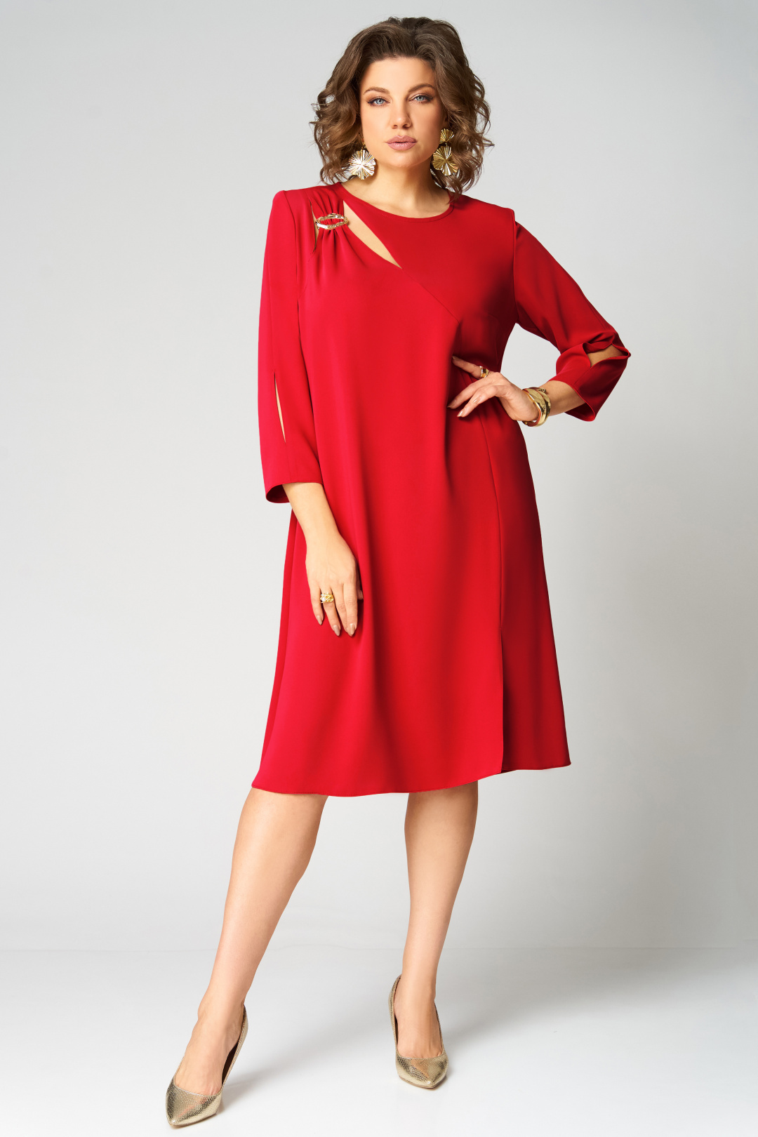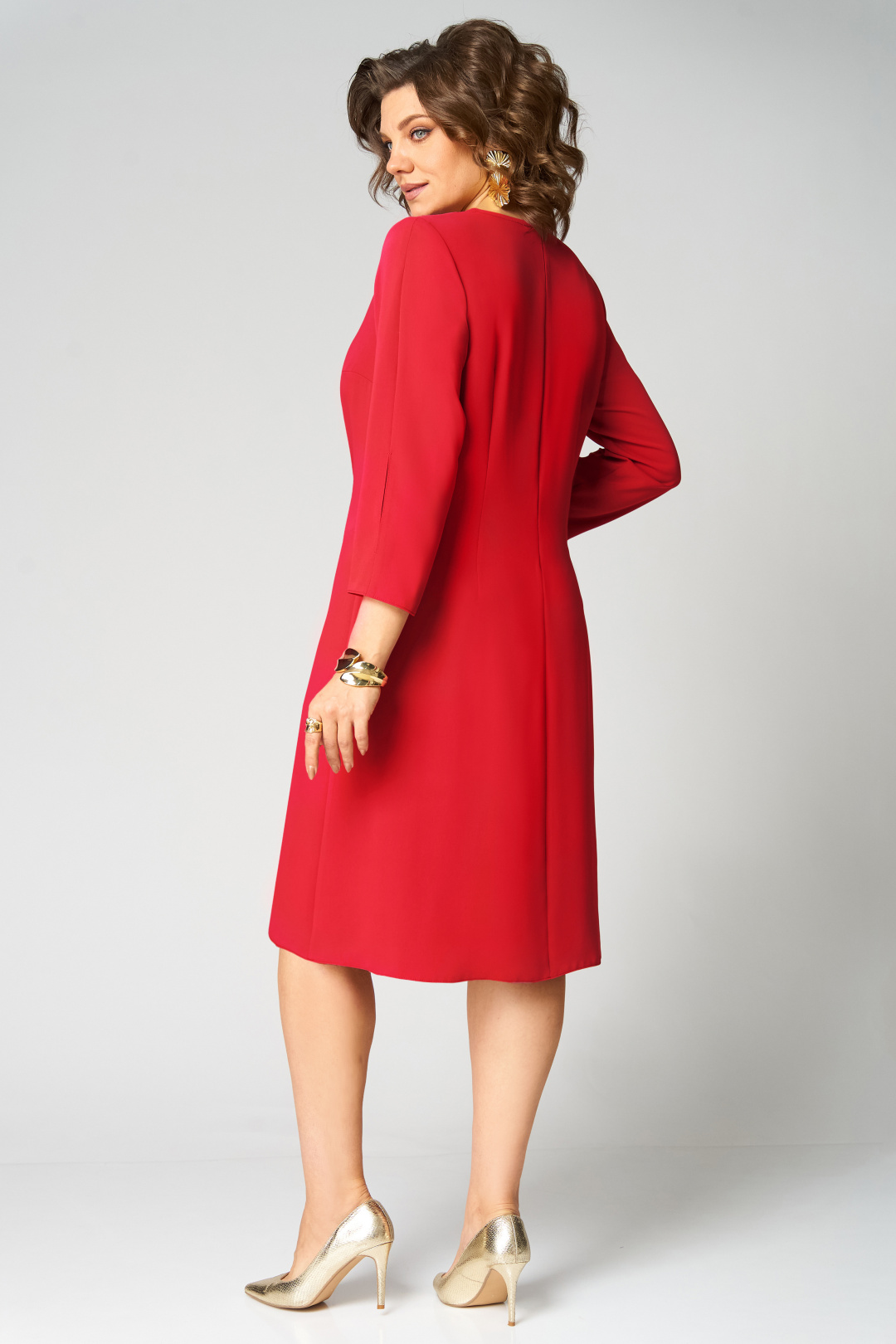 Нарядное платье А- силуэта, без подкладки. Округлый вырез горловины обработан бейкой. Перед с фигурным подрезом и разрезом по низу. По правой стороне переда легкая драпировка с декоративной пряжкой и двумя вырезами. Рукав втачной, двухшовный с вертикальным разрезом в локтевом шве. Спинка со средним швом и застежкой сзади на потайную тесьму-молнию. Длина рукава от горловины- 50 см, длина по синке-104 см
