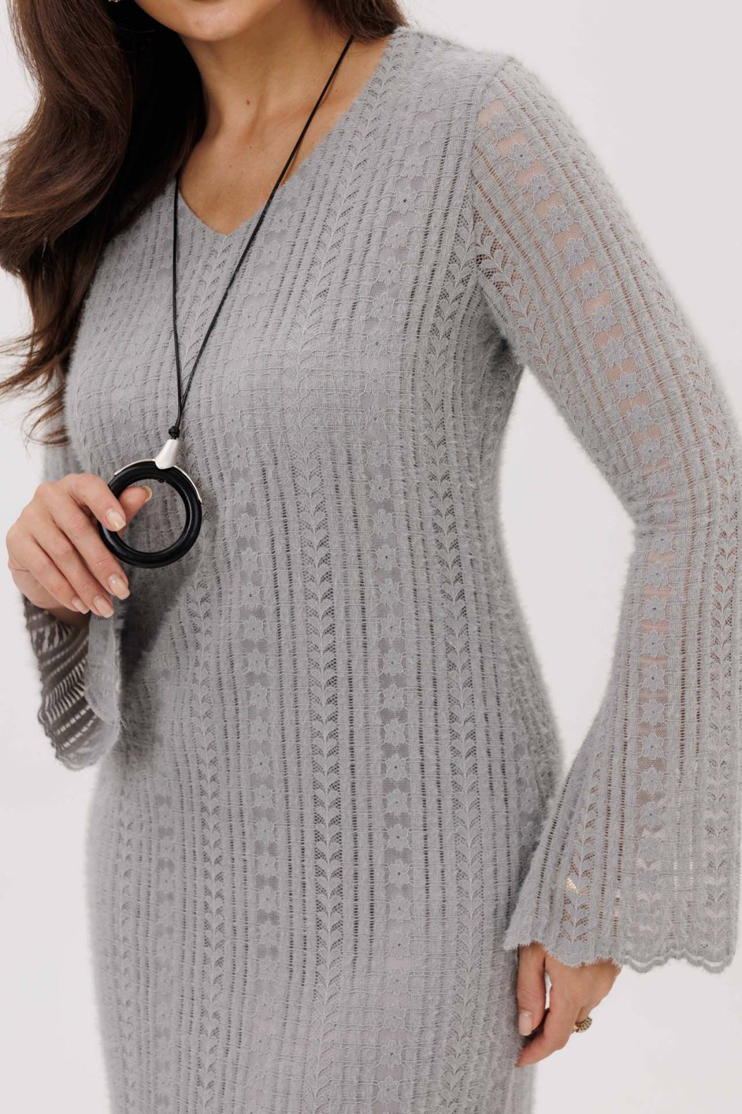 Платье трикотажное на подкладке. Платье выполнено из трикотажного полотна с ажурным (кружевным) рисунком. Полотно средней плотности, эластичное, с мягким прилеганием по фигуре. Изделие полуприлегающего силуэта, длиной миди, с V-образным вырезом горловины и длинным втачным рукавом. Низ рукавов и низа изделия обработан фигурным краем полотна, что придаёт модели завершённый декоративный акцент. Для комфортной посадки предусмотрена трикотажная подкладка по всей длине изделия.