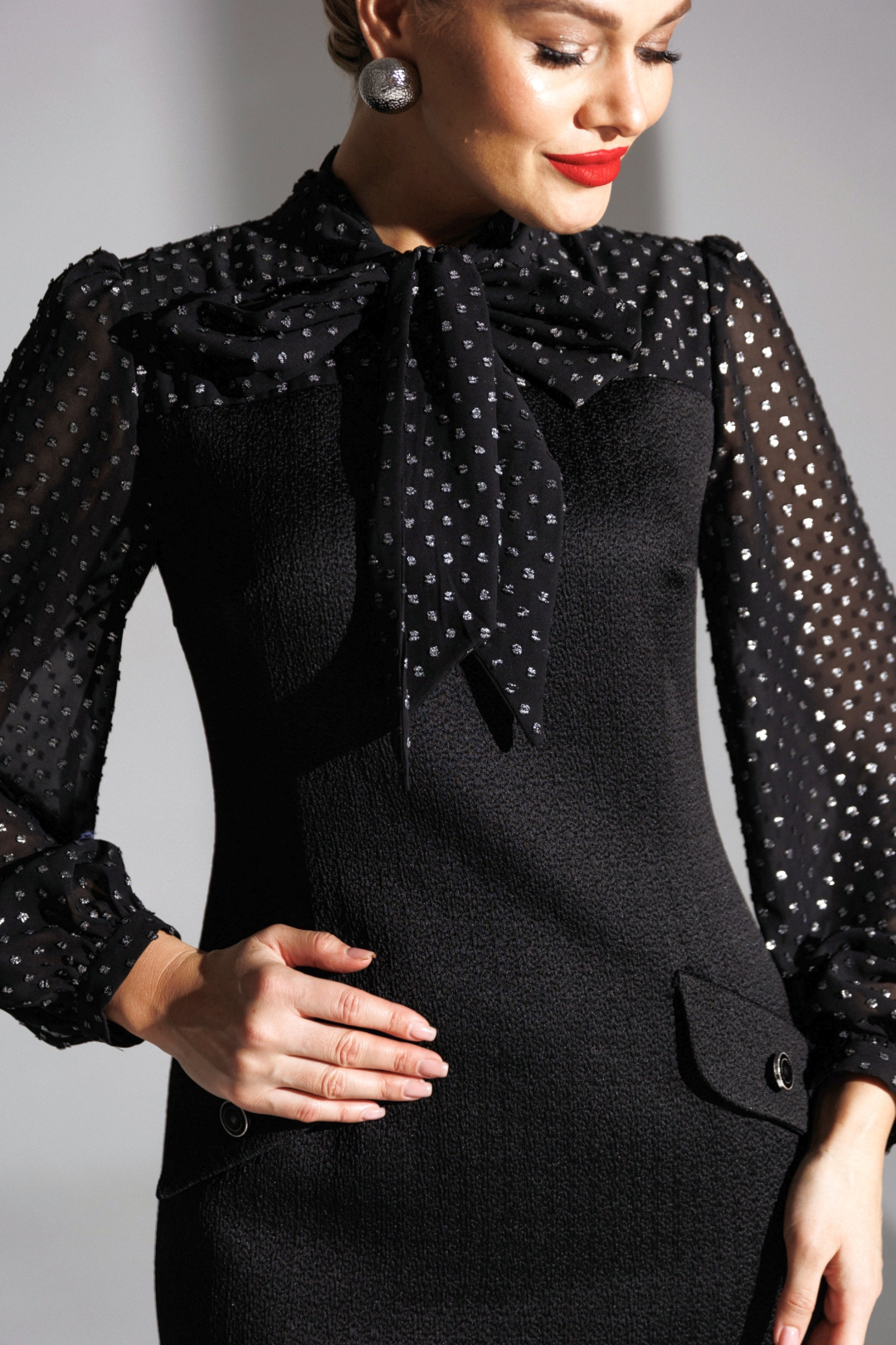 Платье прилегающего силуэта, с накладными декоративными клапанами по переду. Рукав одношовный, со сборкой по низу и на манжете, сборка по верхней части рукава. Рукав, кокетка переда и спинки, воротник-бант выполнены из ткани шифон в горошек. Воротник-бант декоративный , с длинными хвостами. По задней половинке с талиевыми вытачками и шлицей.