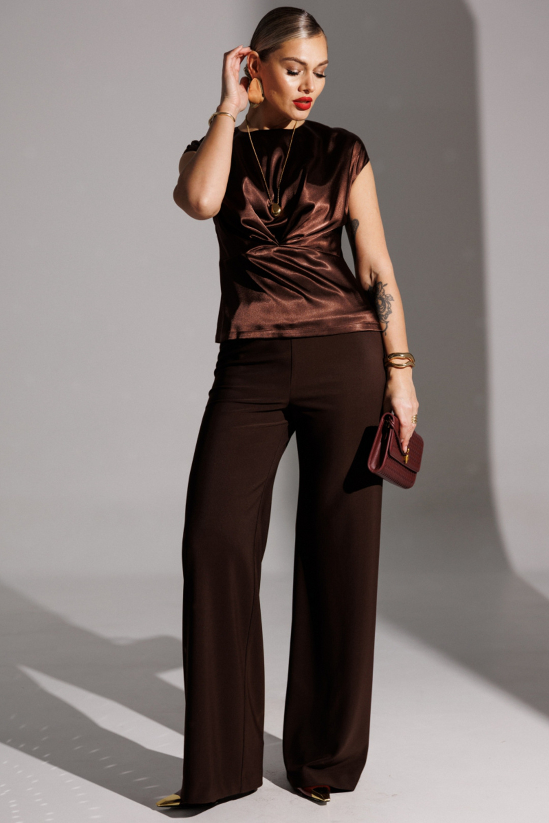 Стильный дуэт в трендовом цвете! Блуза выполнена из атласной ткани свободного кроя с немного спущенным плечевым швом,что добавляет расслабленности и воздушности в образ.