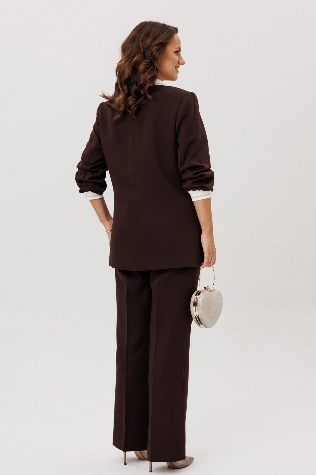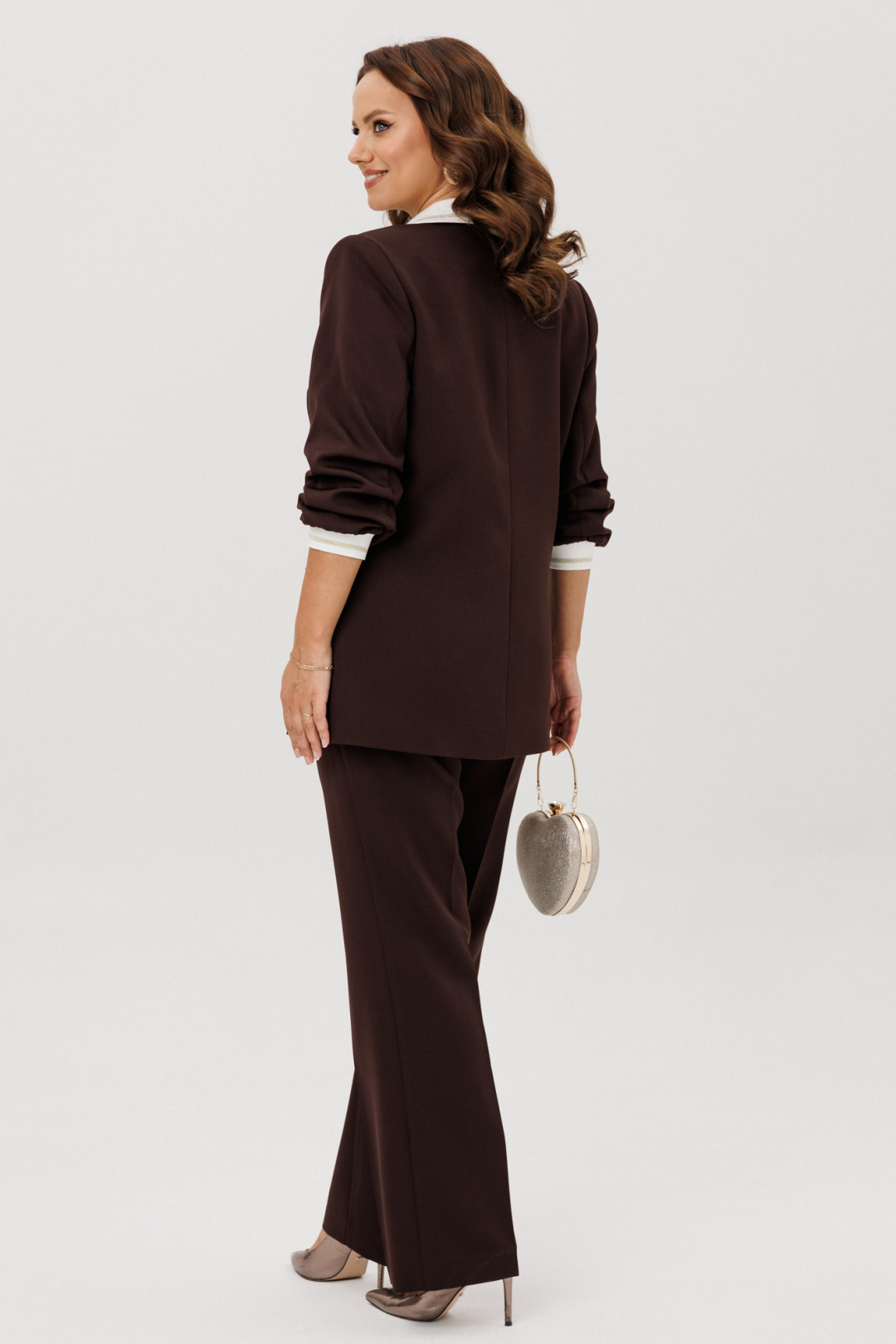 Костюм брючный 2-ка. Жакет полуприлегающего силуэта, выполнен из костюмной ткани (не тянется) с отделкой из довяза на подкладке. Перед с нагрудными вытачками и настрочными клапанами. Застежка центральная на петли-пуговицы. Горловина оформлена воротником пиджачного типа с лацканом. Спинка со средним швом. Рукава втачные, двухшовные с мягкими складками и манжетой из довяза.