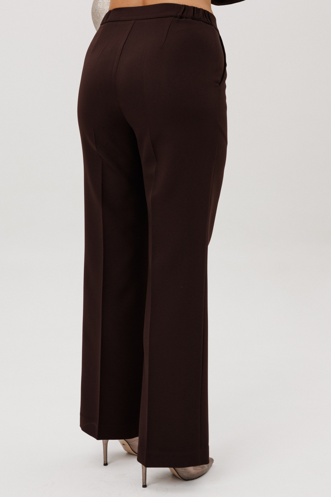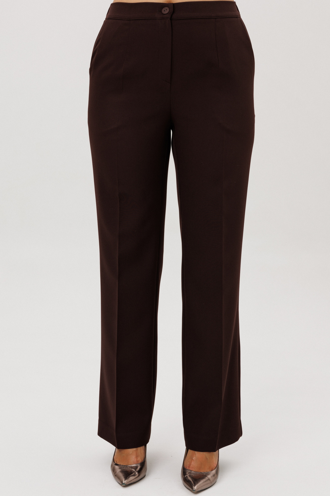 Брюки свободного прямого кроя с высокой посадкой из костюмной ткани (тянется). В боковых швах функциональные карманы. По срезу банта – застежка-молния. Верхний срез оформлен поясом с эластичной резинкой по задней половинке.